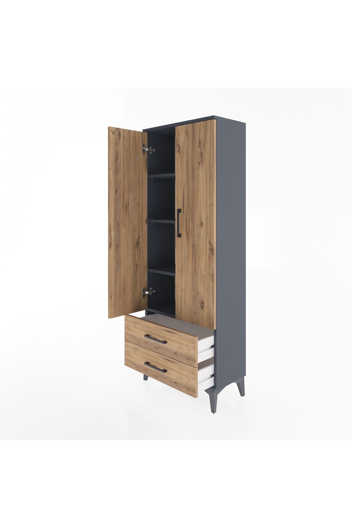 ✨ Evine düzen ve şıklık katacak Arges Dolap 4 Raflı 2 Çekmeceli 2 Kapaklı Antrasit-Çam ile tanış! Antrasit gövdesi ve Atlas Çam kapaklarıyla modern ve sıcak bir atmosfer yaratır. Hem kullanışlı hem de estetik bu dolap, yaşam alanlarınıza değer katacak.