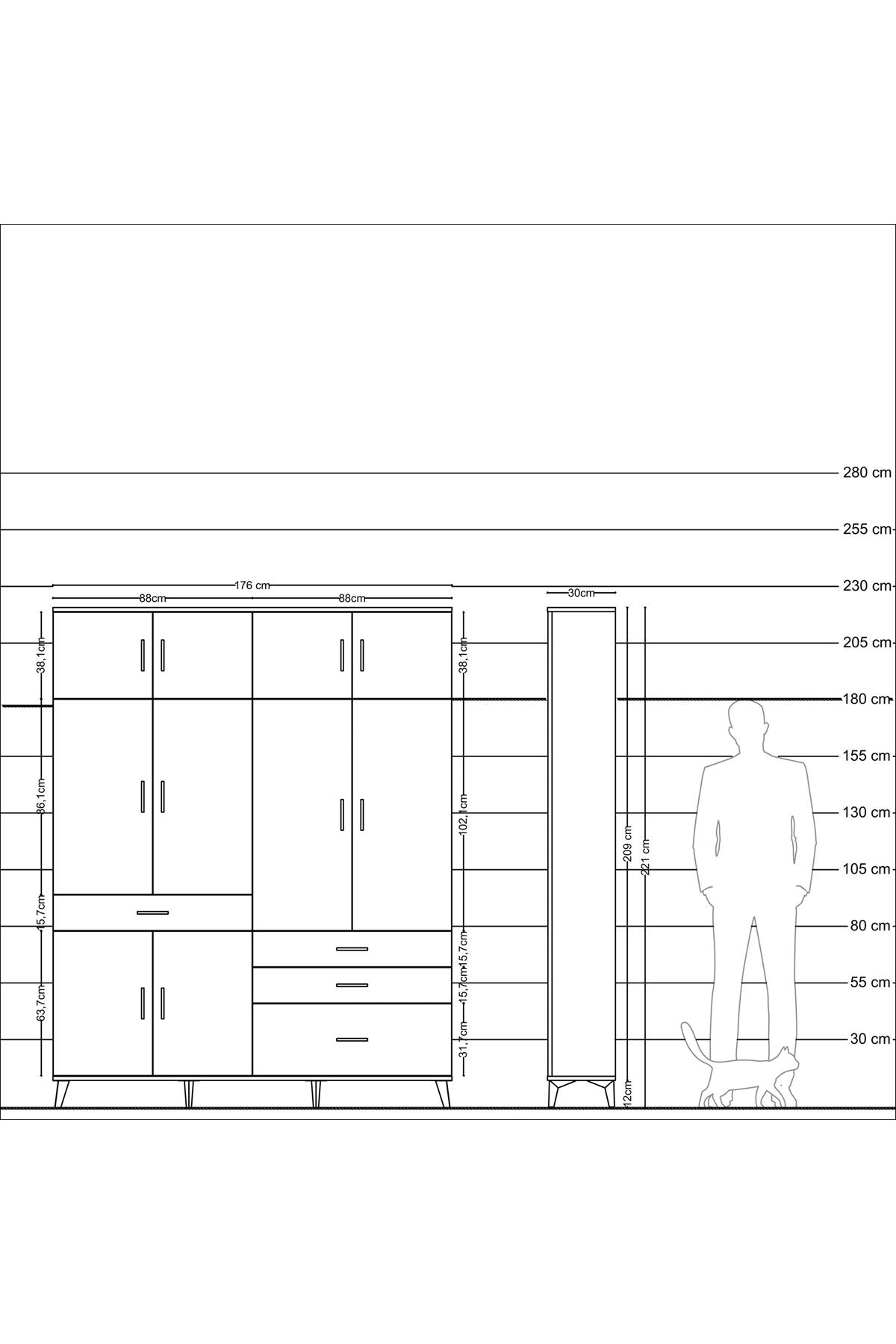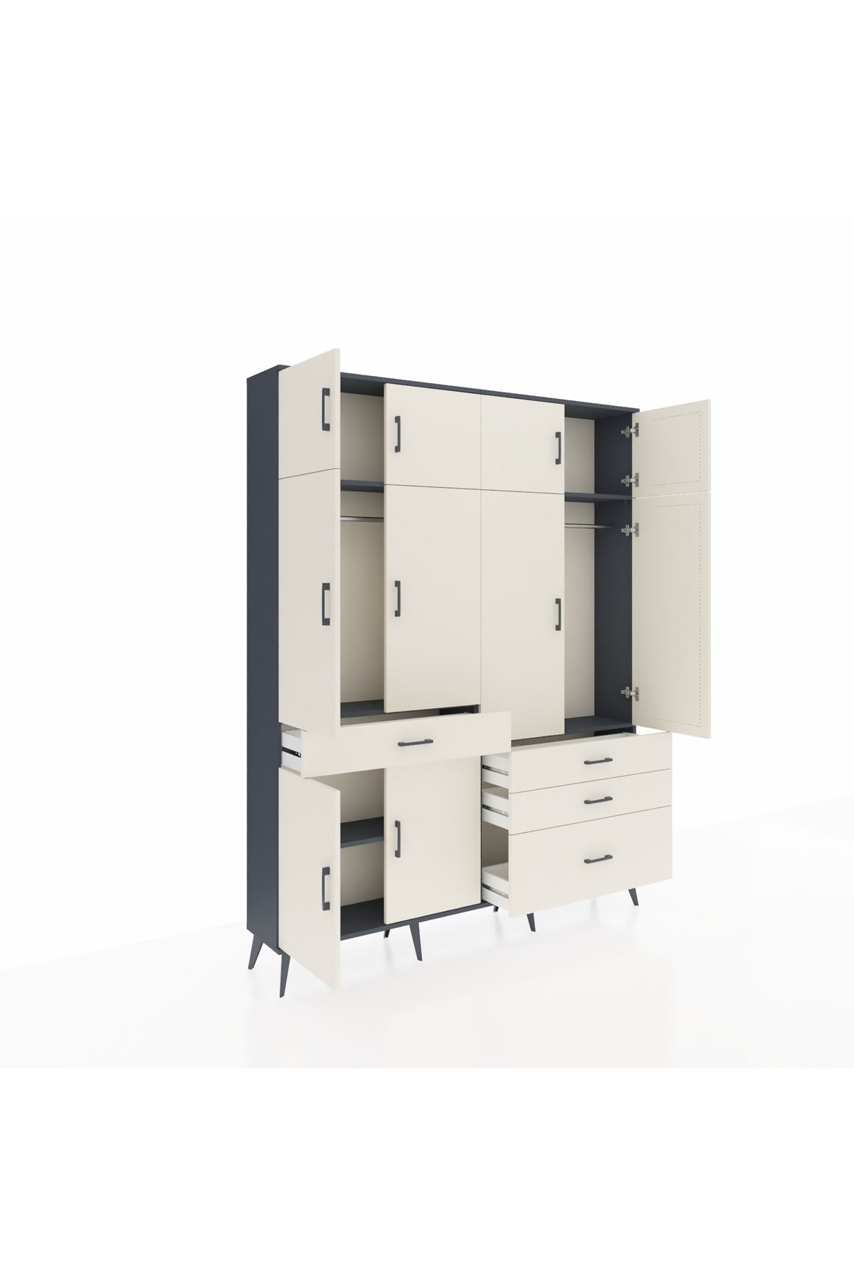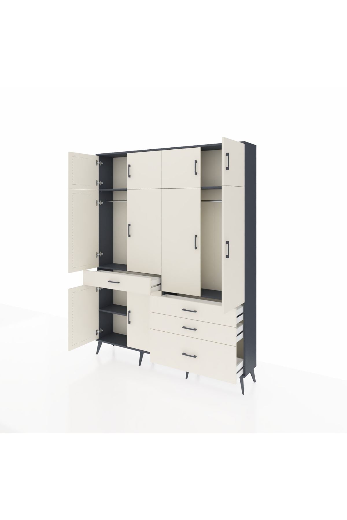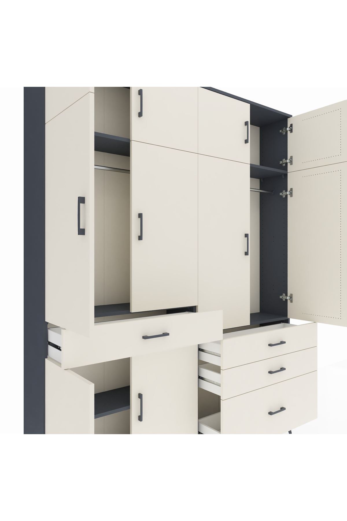 Arges Gardrop: Şık ve kullanışlı gardırop, antrasit ve aytaşı renkleriyle evinize modern bir dokunuş katıyor. 5 raf, 4 çekmece ve 2 askılık ile geniş depolama alanı sunar. Ölçüler: 176x30x221 cm.