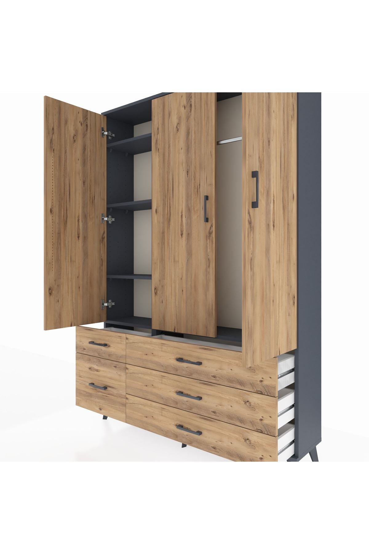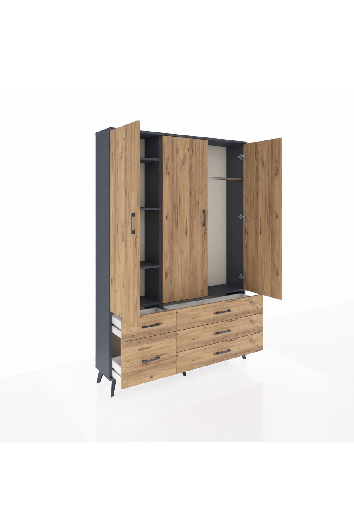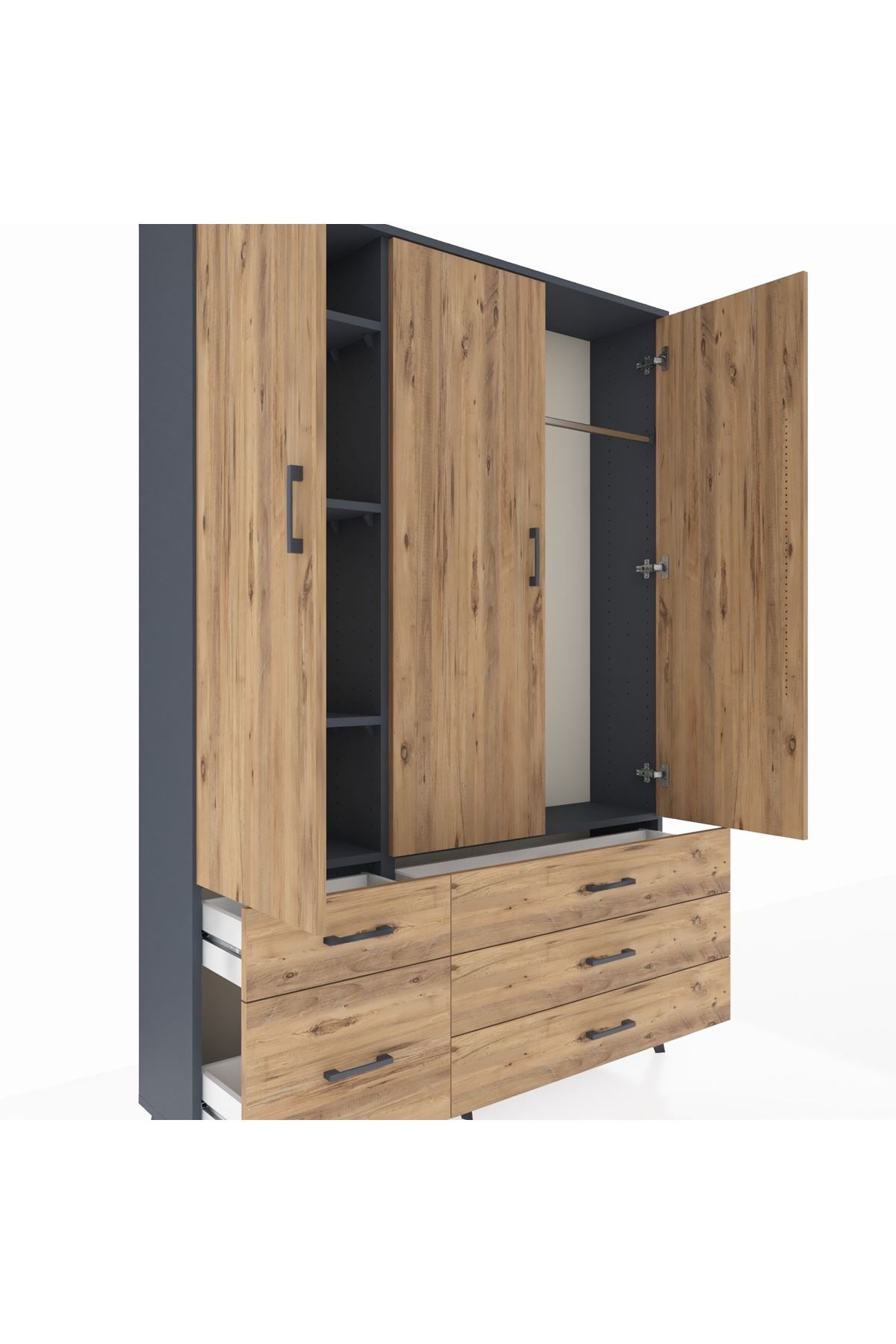 ✨ Arges Gardrop ile evinize düzen ve şıklık katın! Antrasit gövdesi ve Atlas Çam kapaklarıyla modern ve doğal bir görünüm sunan bu gardırop, eşyalarınızı düzenli bir şekilde saklamanız için ideal bir çözüm.