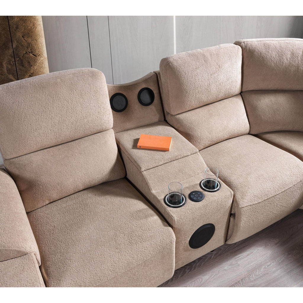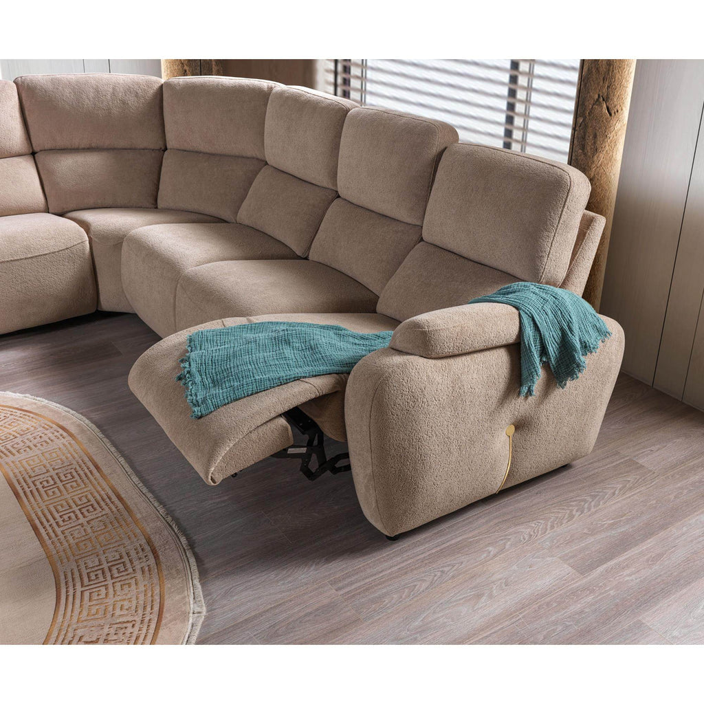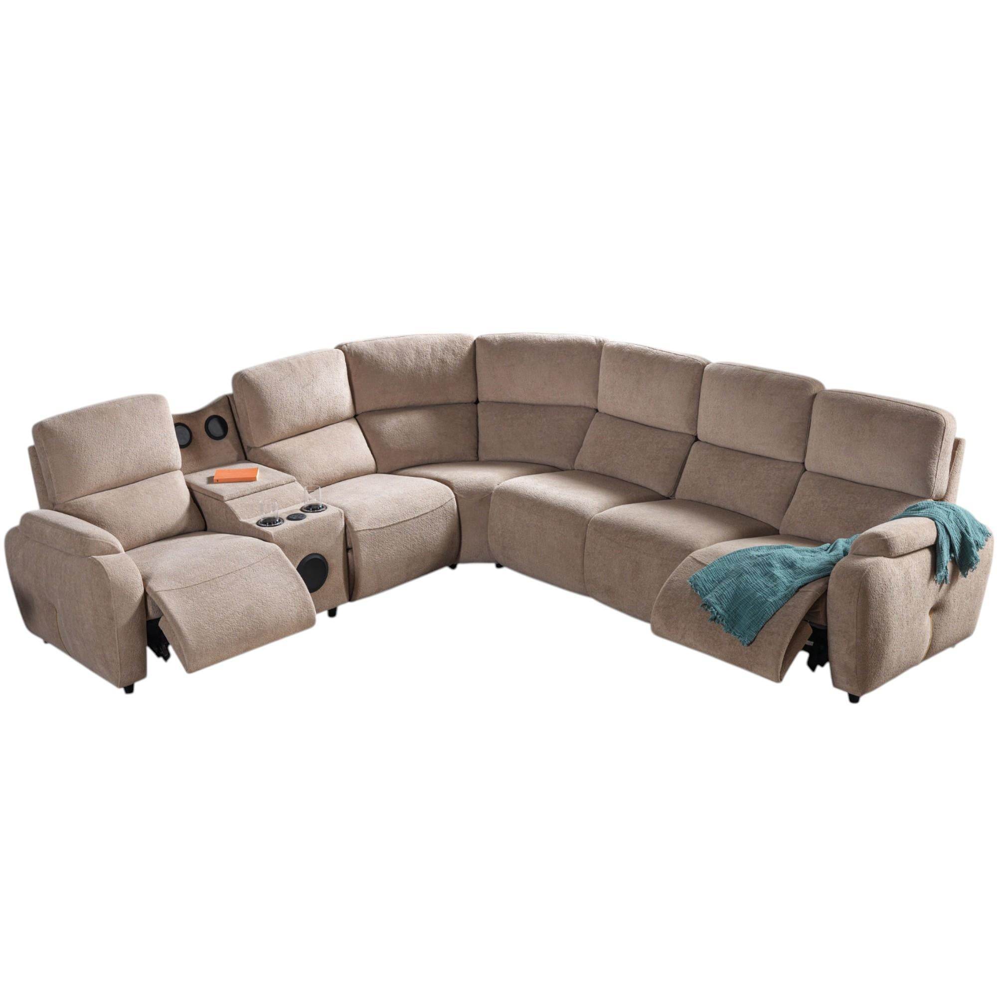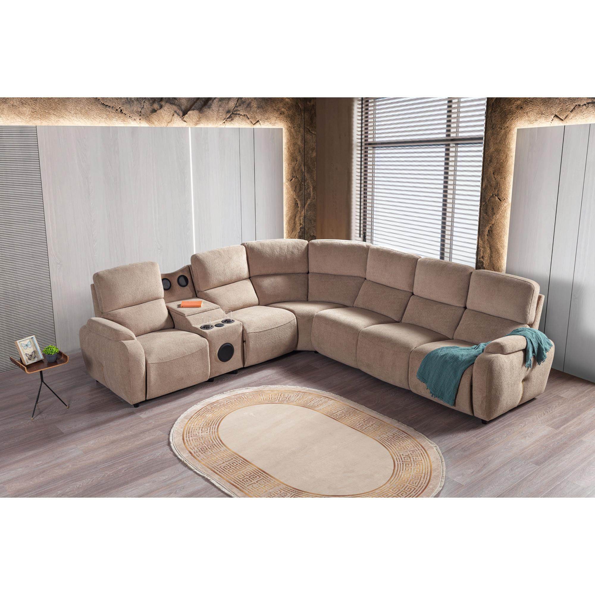 Bu ürün, kullanıcı ihtiyaçlarına yönelik modüler bir tasarıma sahip bir köşe koltuk takımıdır. Sağ ve sol dış tarafta bulunan motorlu açılır-kapanır mekanizmalar, rahatlık ve konfor açısından ürünü öne çıkarıyor. Ara modülde yer alan müzik sistemi ve kapaklı tepsi gibi ek özellikler, ürünün modern ve kullanışlı bir yapıya sahip olduğunu gösteriyor.