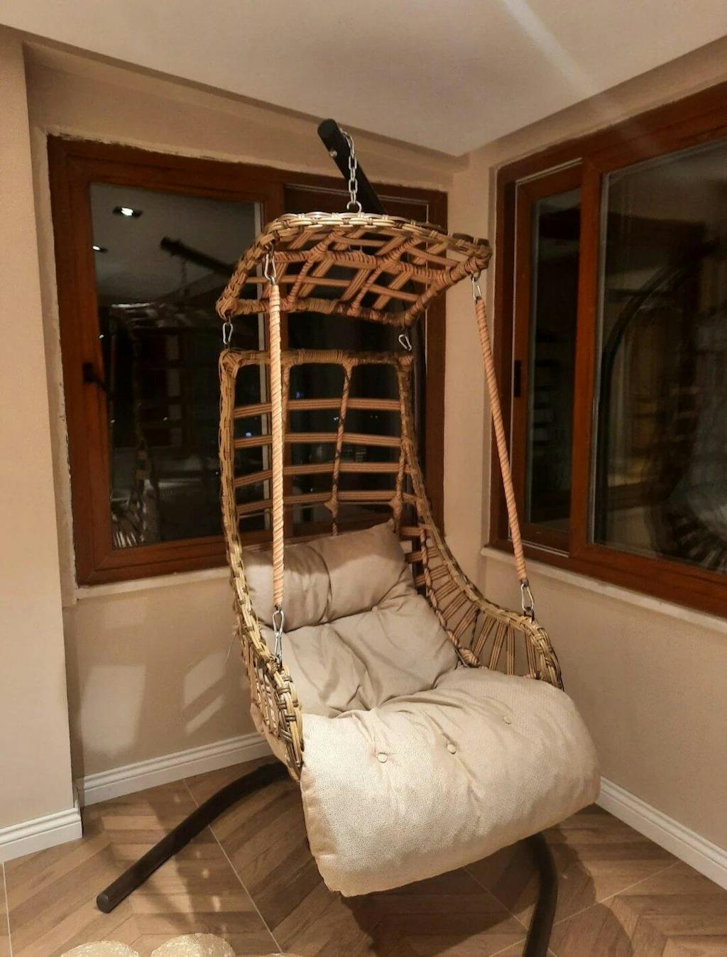 Malzeme: Rattan Salıncak Sepeti, Su Kaydırıcı Kumaş Minder, Zincirli Çelik Askı,