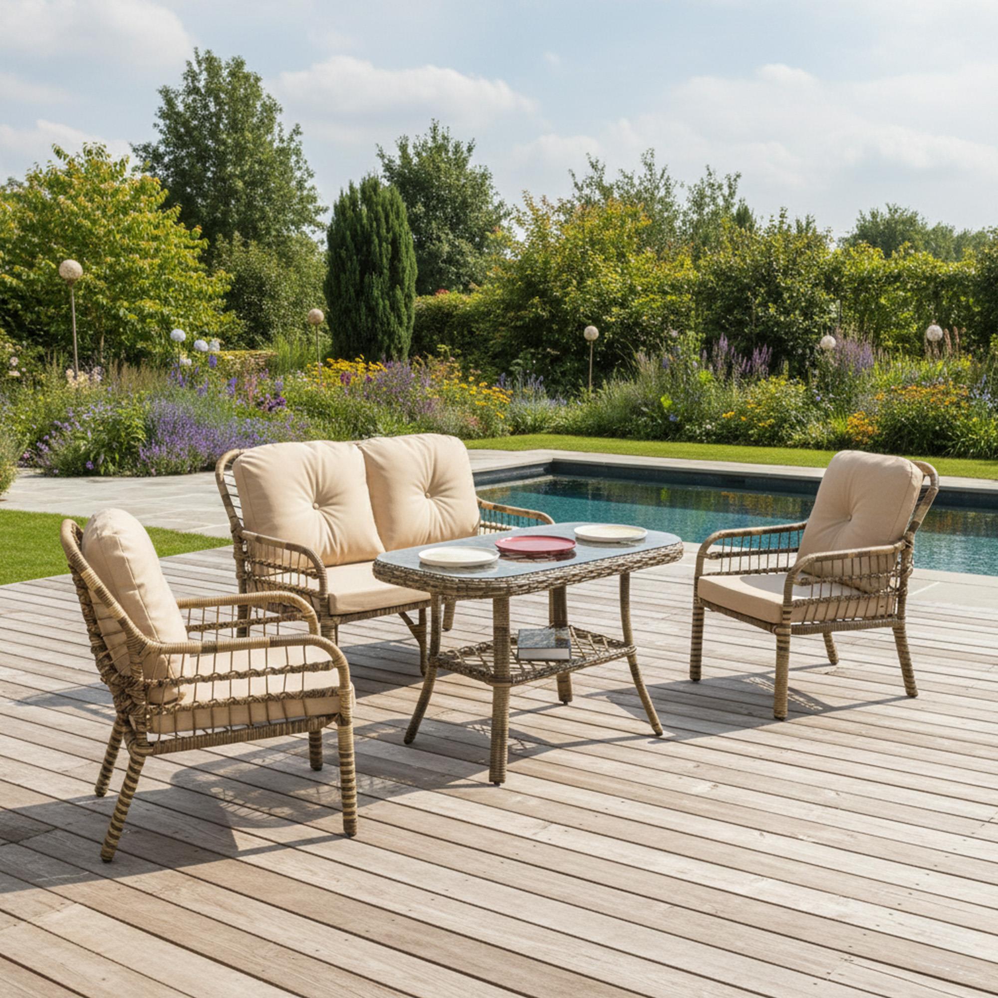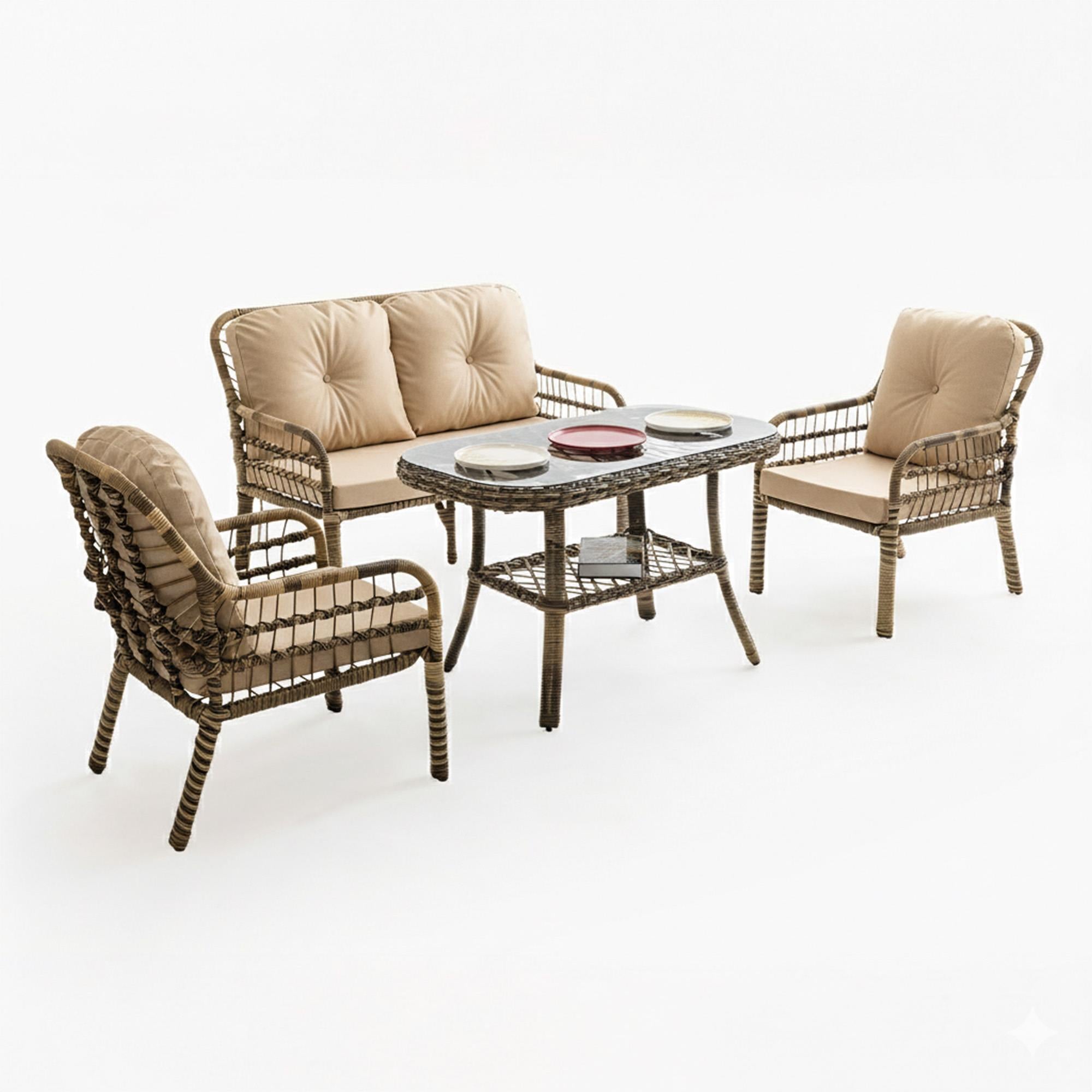 Capri Swing Pisa İkili Rattan Bahçe Balkon Oturma Grubu, balkon ve bahçe kullanımı için tasarlanmış, 1 adet ikili koltuk, 2 adet tekli koltuk ve 1 adet sehpadan oluşan konforlu bir dış mekan oturma takımıdır. Win-Tech sentetik rattan örgüsü, sağlam metal iskeleti ve su itici minderleri ile dış mekan koşullarına uyum sağlayan bu takım, hem günlük kullanım hem de misafir ağırlamak için ideal bir oturma alanı sunar. Not: Minder rengi ve modeli değişebilir. Capri Swing Pisa İkili Rattan Oturma Grubu, açık alanlarda konforlu ve estetik bir oturma alanı oluşturmak için tasarlanmıştır. Klasik plastik dış mekan mobilyalarına kıyasla rattan örgü yapısı ve metal iskeleti sayesinde daha uzun ömürlü ve dayanıklıdır. Takım kaç parçadan oluşur? Minderler suya dayanıklı mı? Dış mekanda sürekli kullanıma uygun mu?Öne Çıkan Özellikler