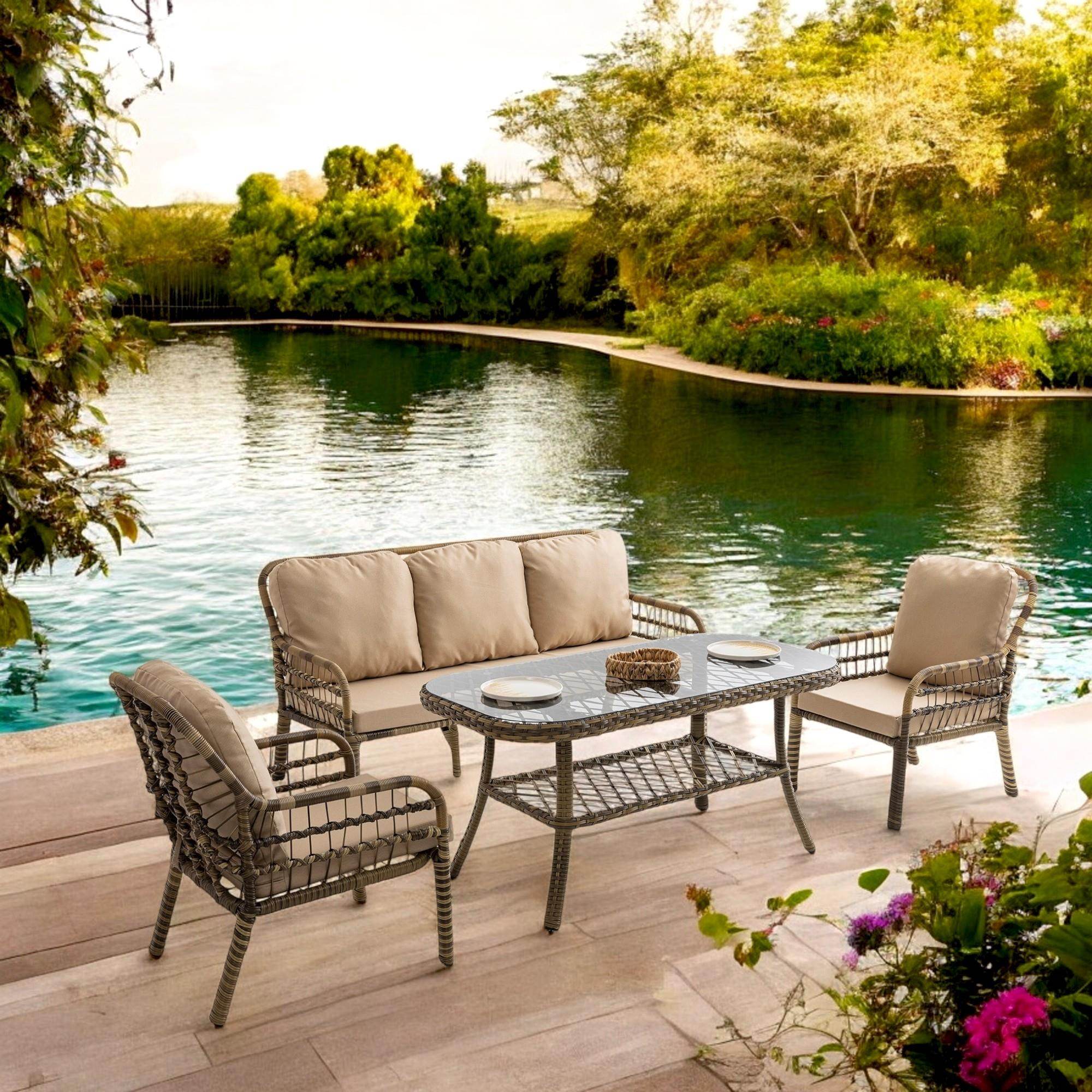Özel Tasarım: Capri Swing Pisa Üçlü Rattan bahçe balkon oturma grubu, şıklığı ve konforu bir araya getirerek açık hava yaşamınıza yeni bir boyut katıyor. Birinci sınıf win-tech sentetik rattan malzeme kullanılan bahçe mobilya takımı, özel işçilik ile ustaca elde örülerek üretilmiştir. 4 kişilik masalı takım, doğal rattan malzemesi ile naturel bir görünüm sağlarken, aynı zamanda açık kahve tonları ile bahçenize modern bir hava katıyor.
