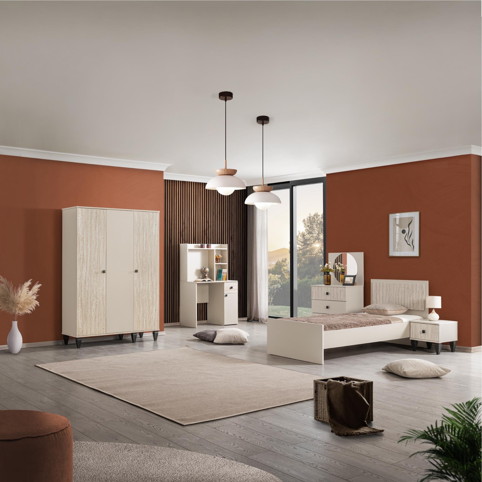 - Tam Set Konforu: Karyola, komodin, şifonyer ve dolap ile eksiksiz bir genç odası çözümü sağlar.
