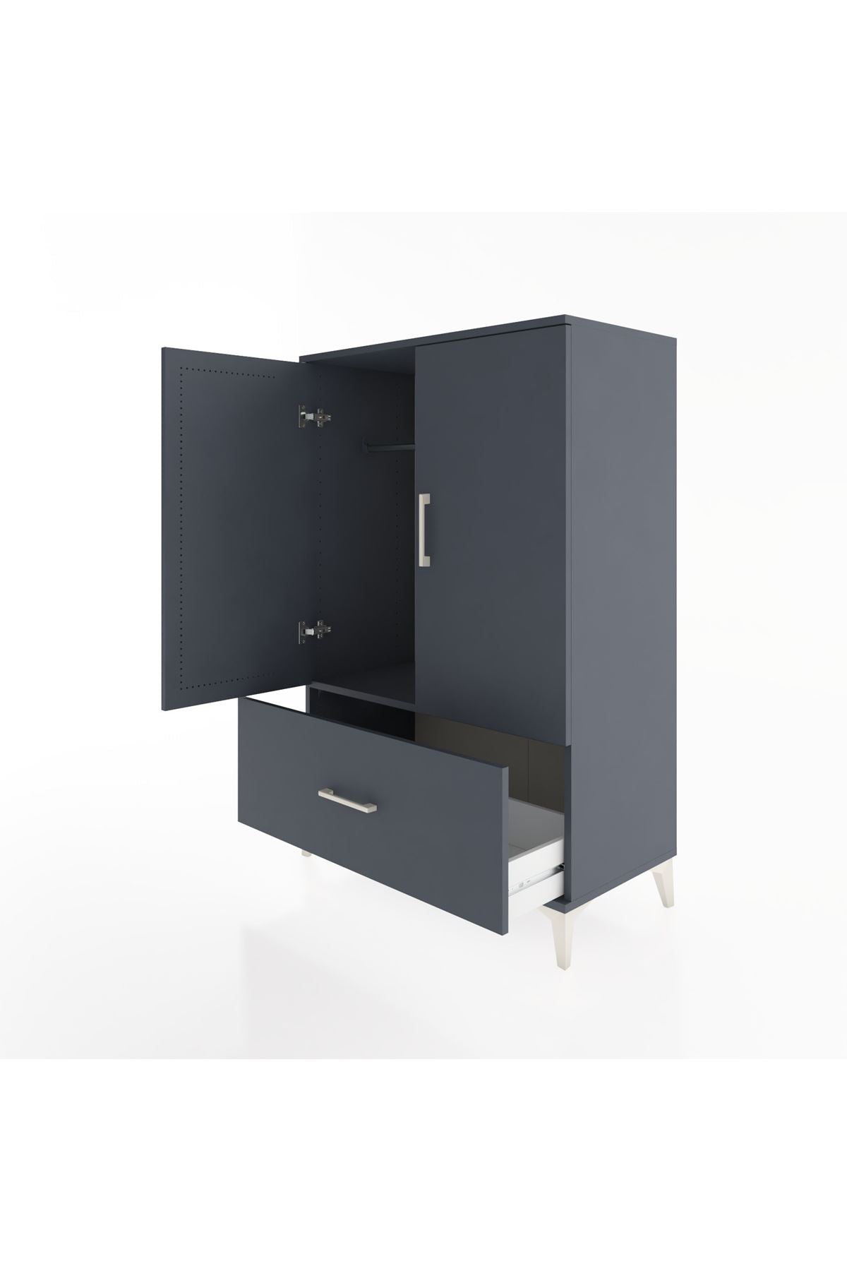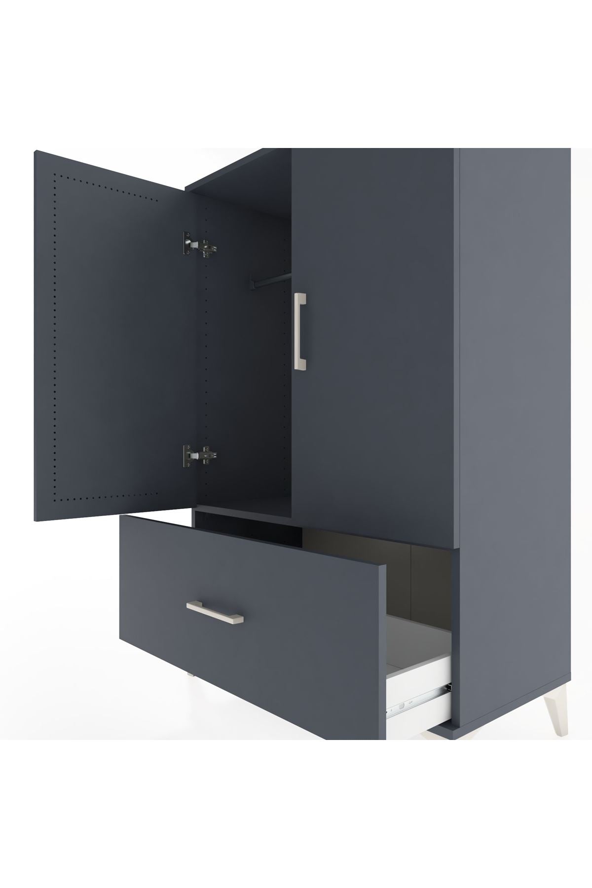 ✨ Hyperion Dolap ile evinize modern bir dokunuş katın! Antrasit renginin asil duruşu, hem şıklığı hem de kullanışlılığı bir araya getiriyor. Tek çekmecesi, tek rafı ve askılık bölümü ile eşyalarınızı düzenlemenin en pratik yolu!