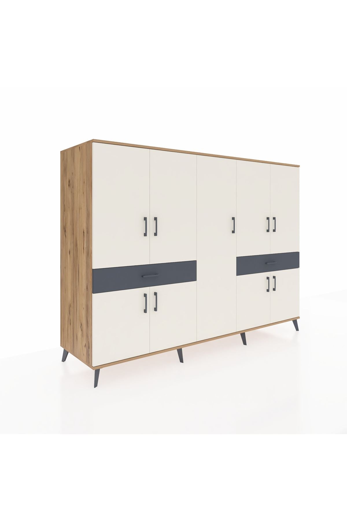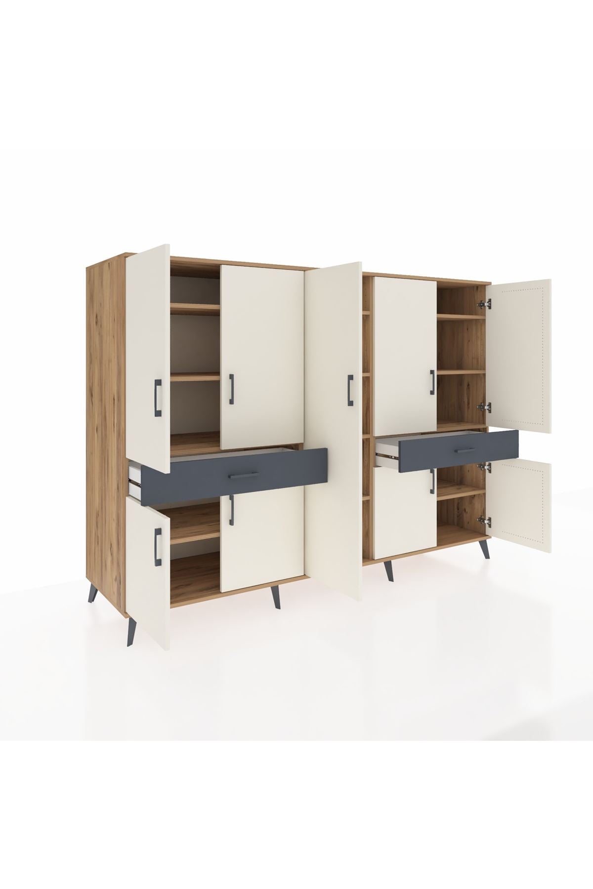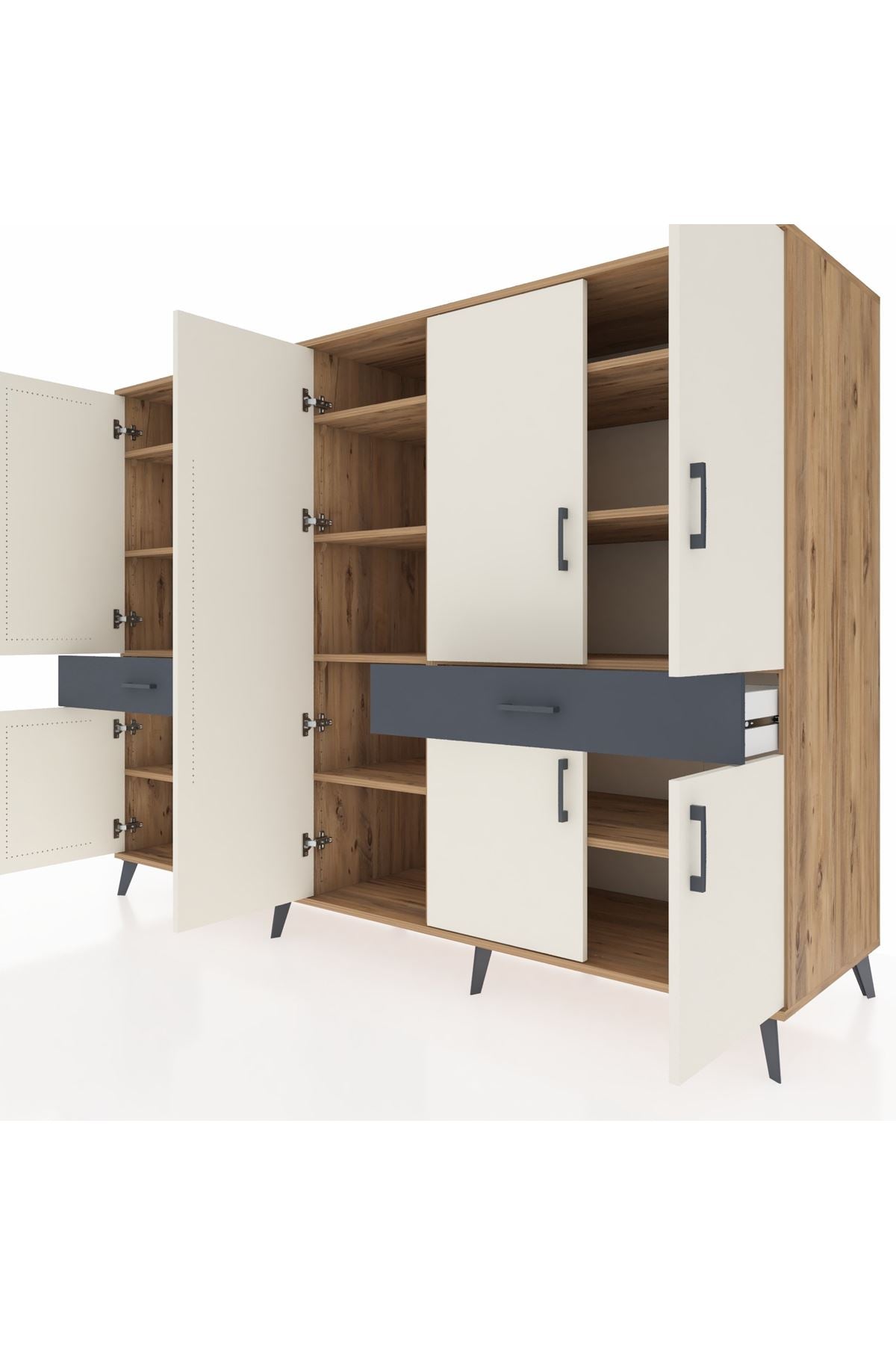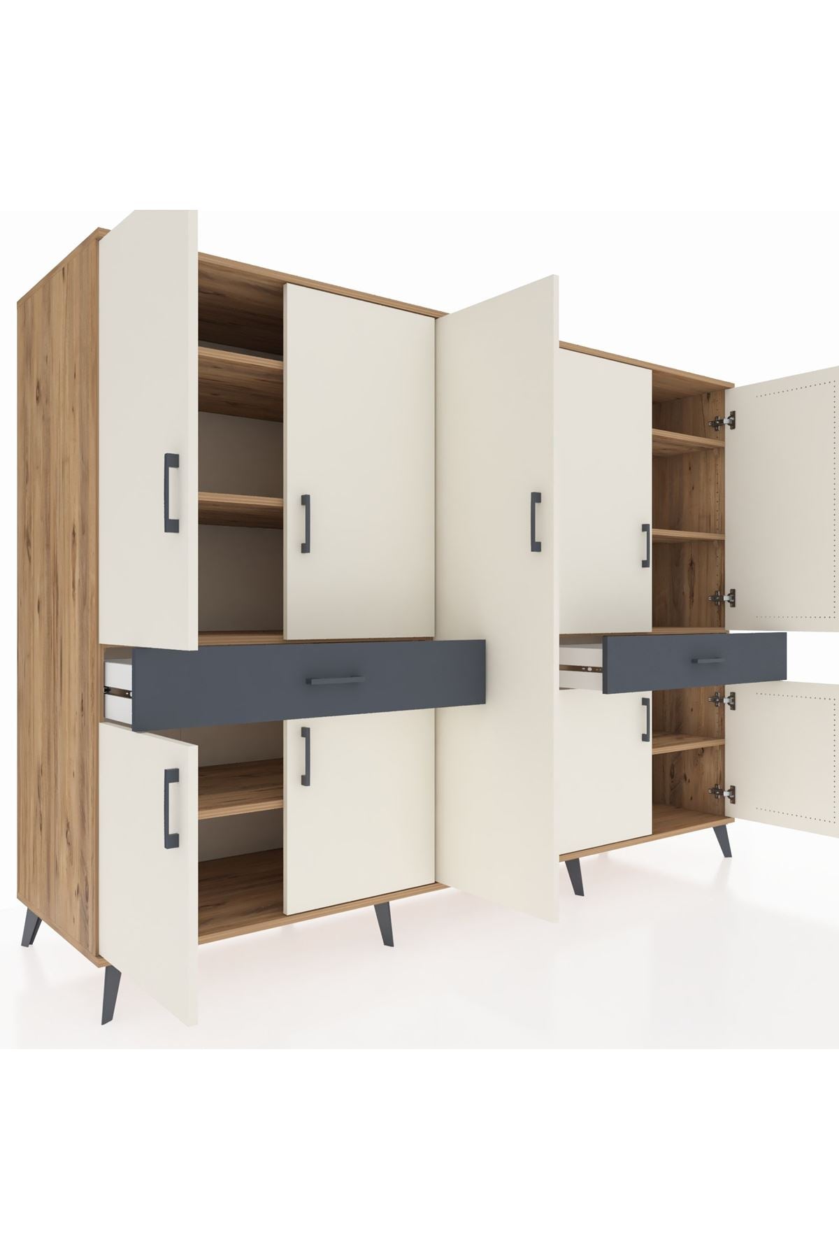 ✨ Evine düzen ve şıklık katmak isteyenler için ideal! Kronos Dolap, çam ve aytaşı/antrasit renklerinin modern uyumuyla yaşam alanlarınıza ferah bir dokunuş getiriyor. 12 rafı, 2 çekmecesi ve 8 kapaklı geniş iç hacmi ile tüm eşyalarınızı düzenli bir şekilde saklayabilirsiniz.