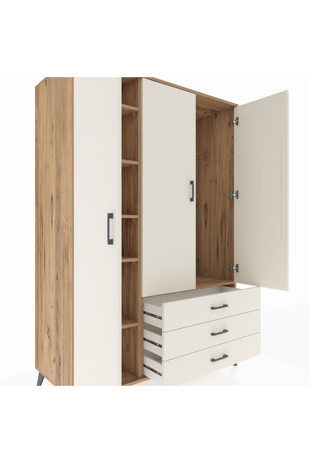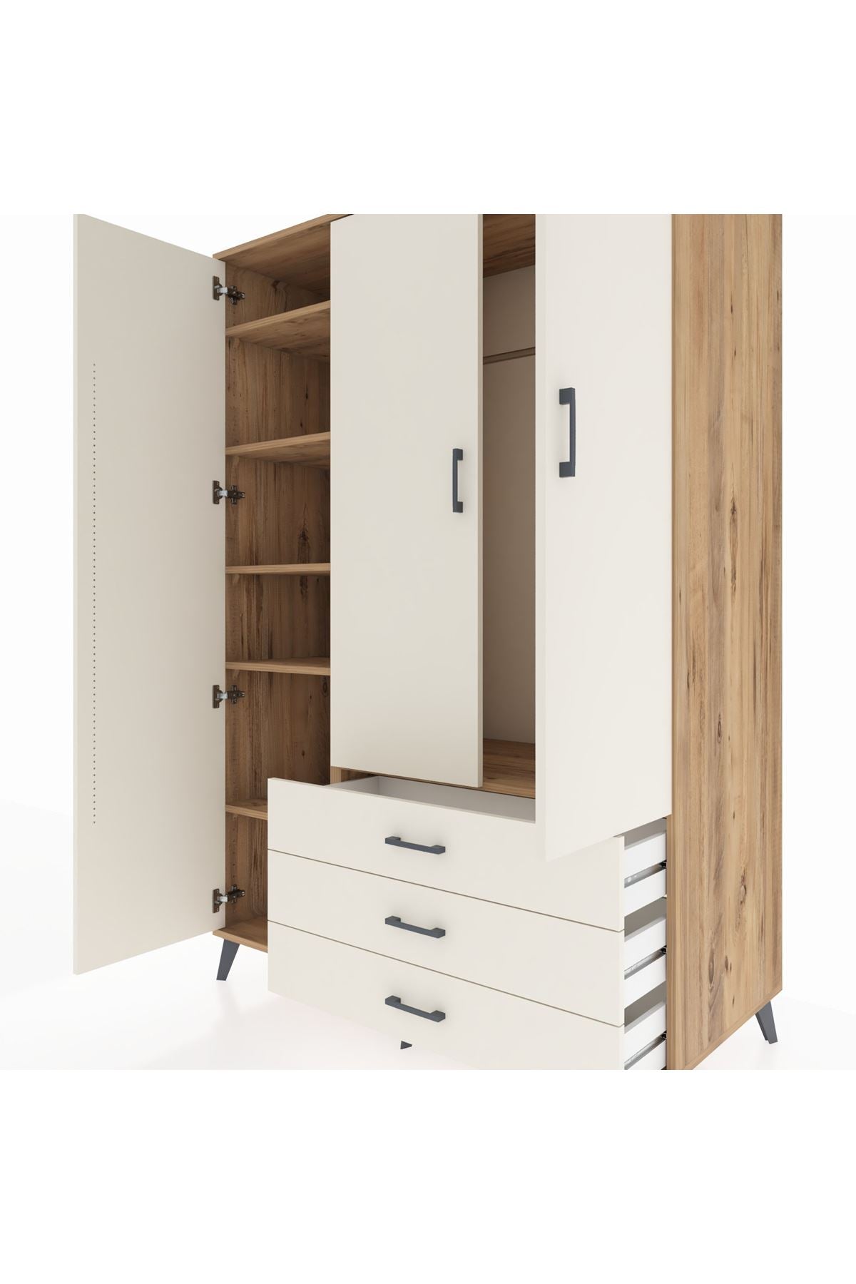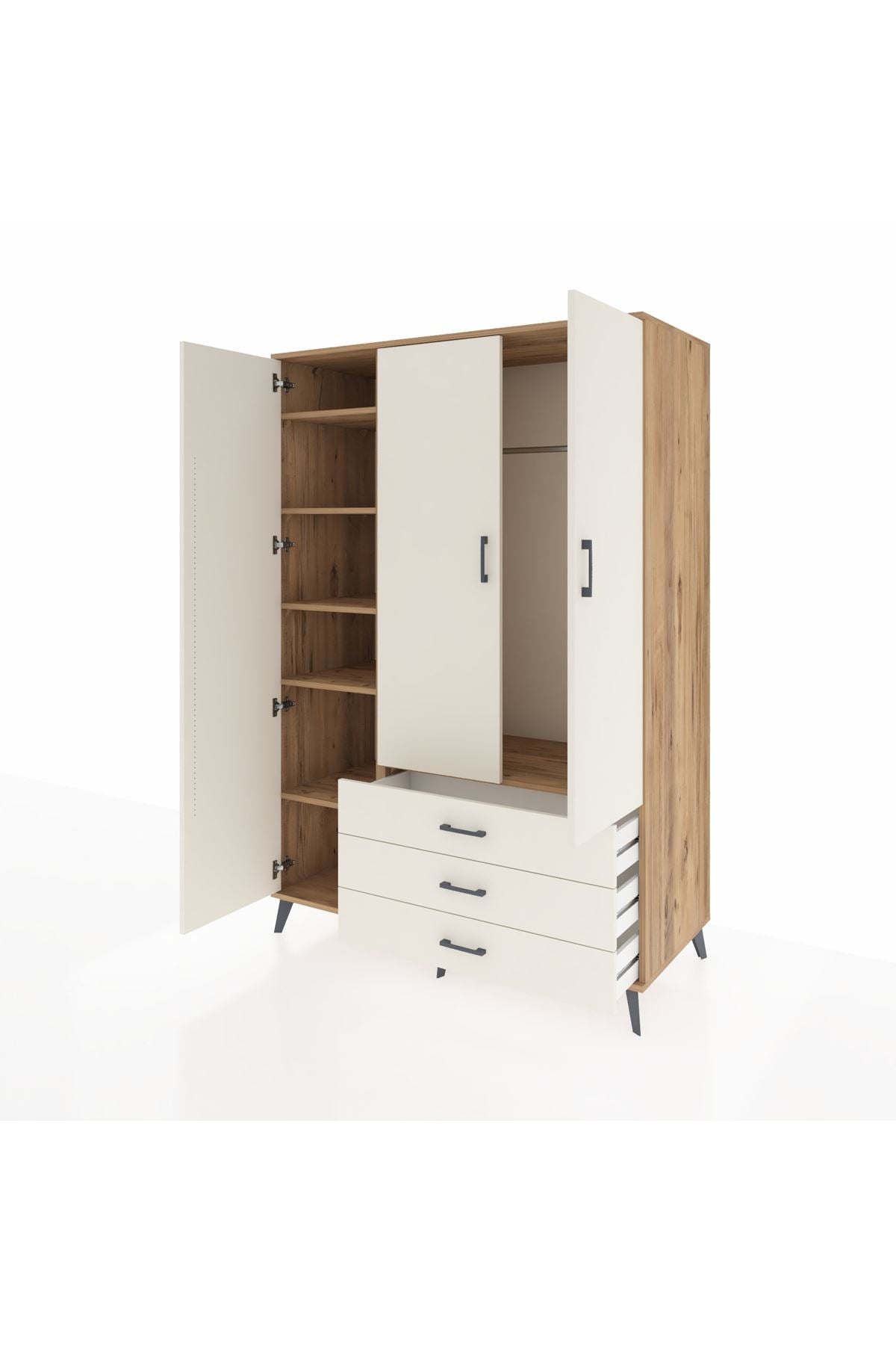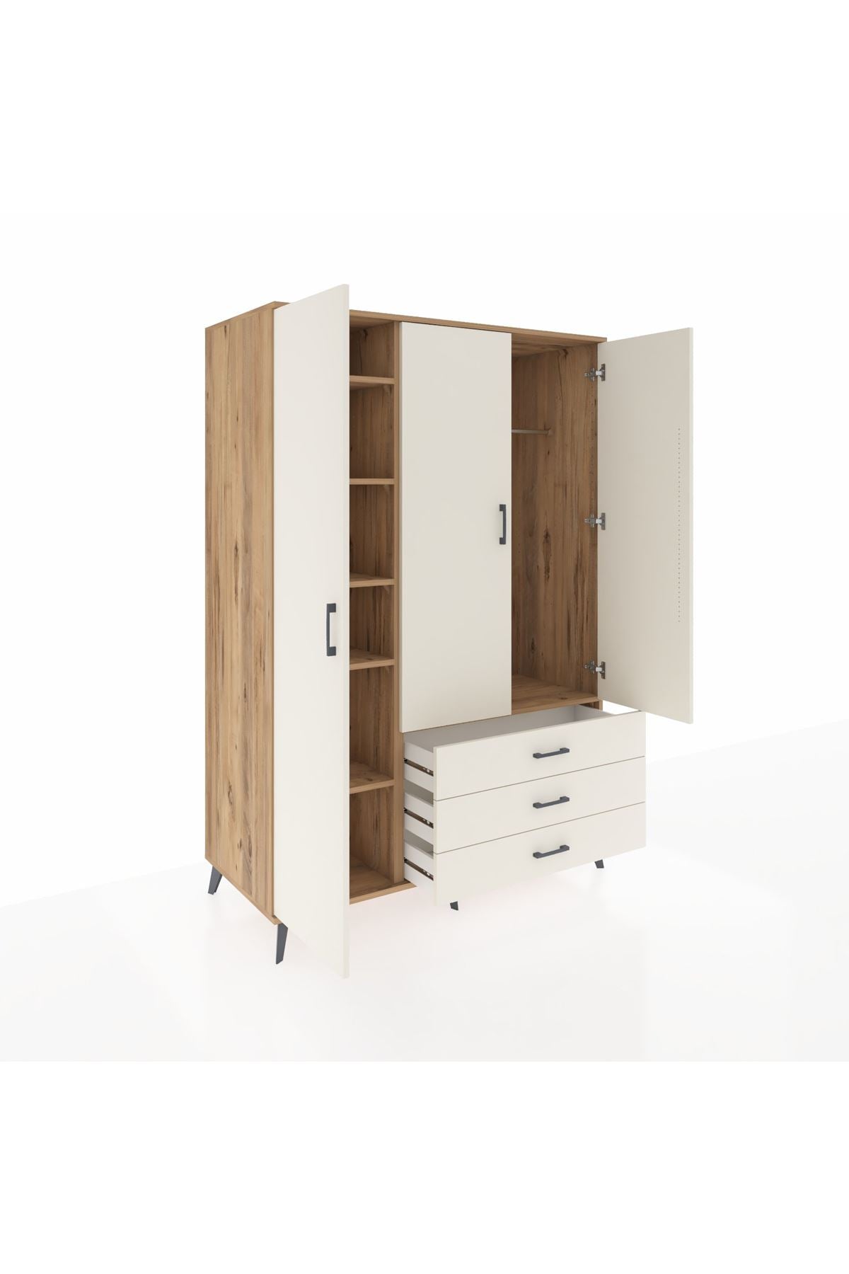 🦾 Metal ayakları sayesinde yerden yüksekliği sayesinde robot süpürge kullanımına uygundur. Metal kulplar, gardırobun modern tasarımını tamamlar. Sağlam yapısı sayesinde uzun ömürlü bir kullanım sunar.