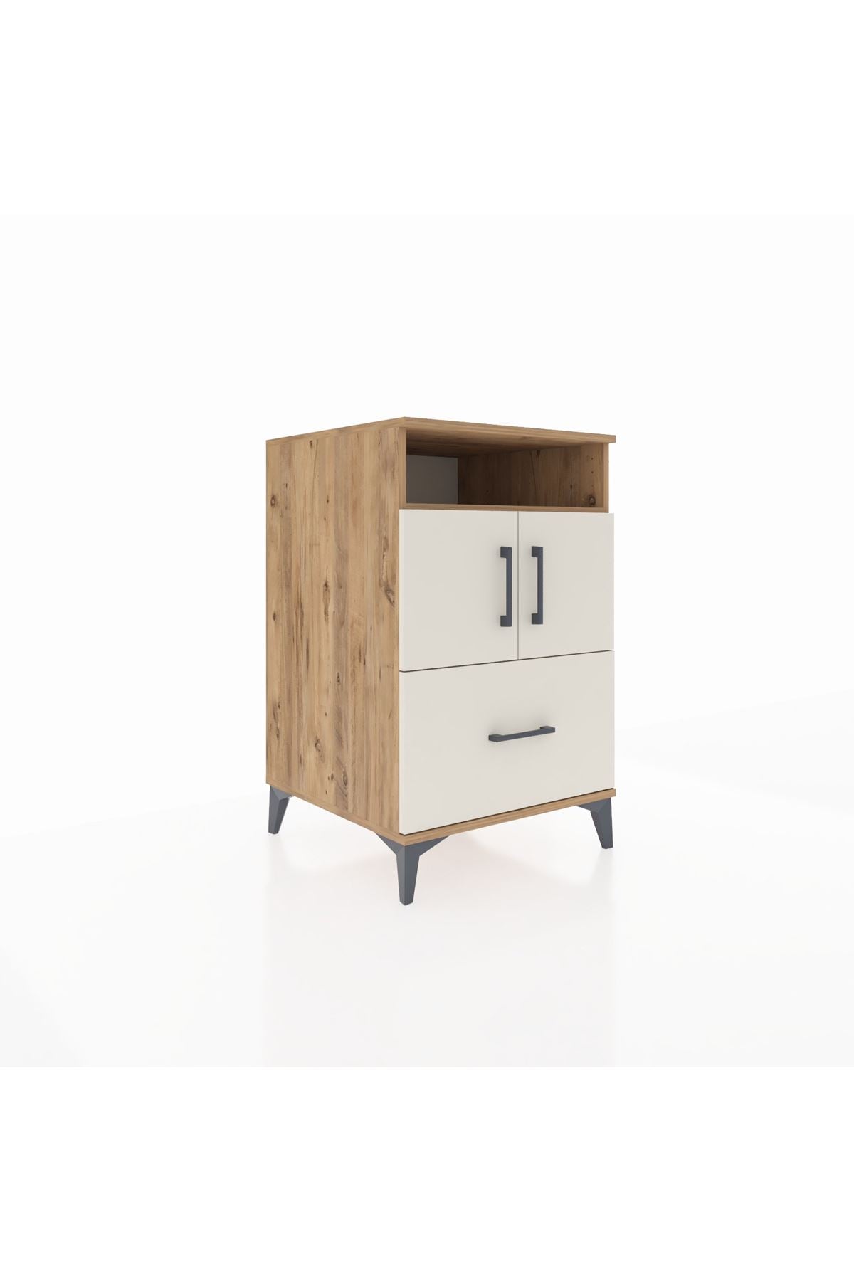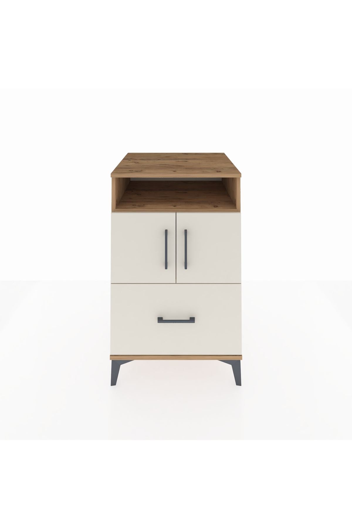 🦾 Metal ayakları sayesinde yerden yüksekliği robot süpürge kullanımına uygundur. Şık metal kulpları ve sağlam yapısıyla dikkat çeken bu komodin, yatak odanızın vazgeçilmezi olacak.