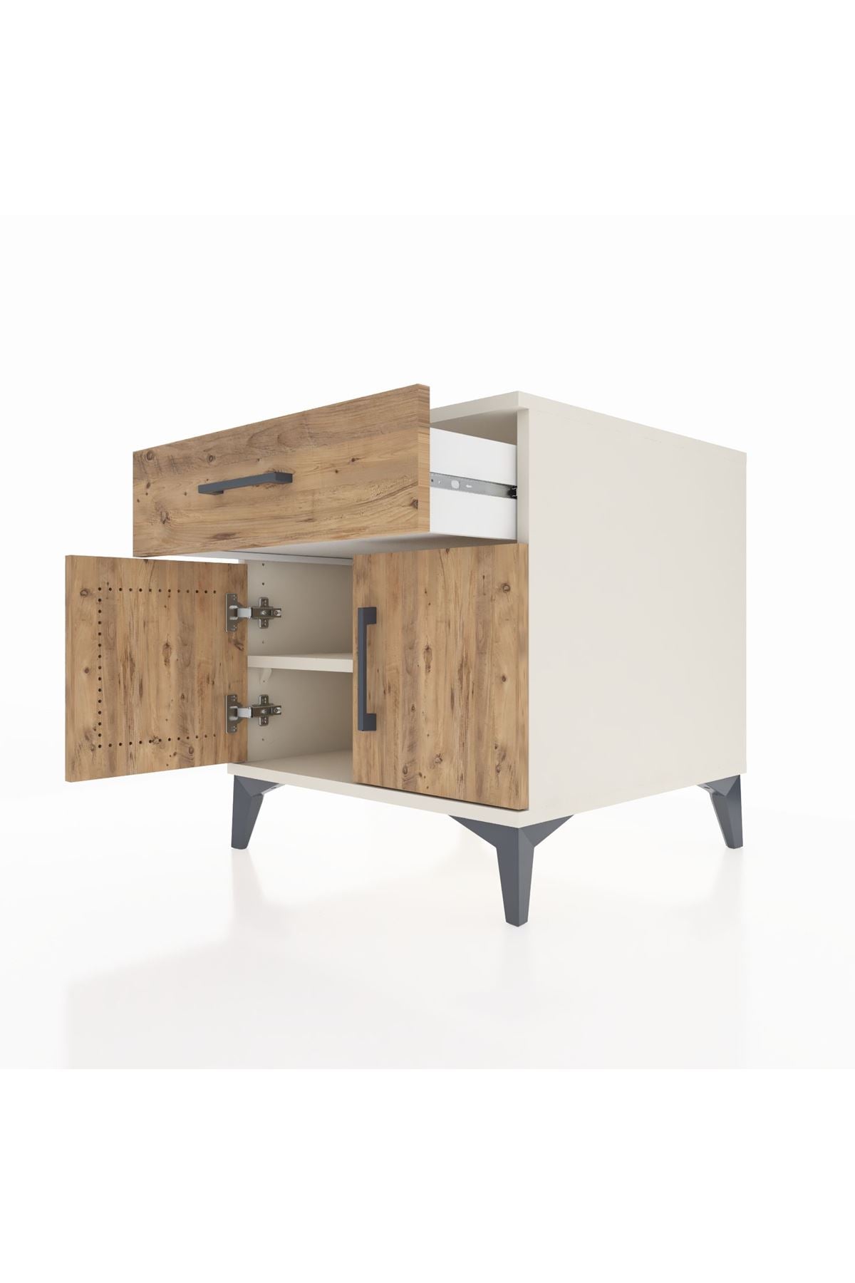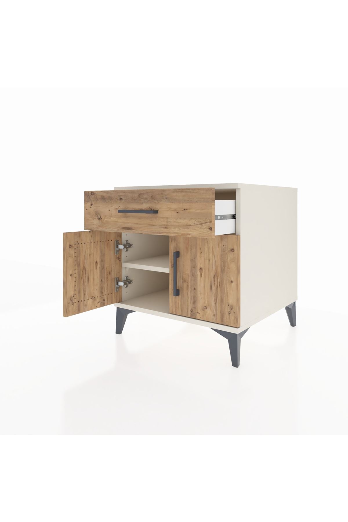 🦾 Metal ayakları ve şık metal kulpları ile sağlam bir yapıya sahip olan komodin, uzun yıllar boyunca güvenle kullanabileceğiniz bir mobilya parçasıdır. Ayakları robot süpürge kullanımına uygundur.