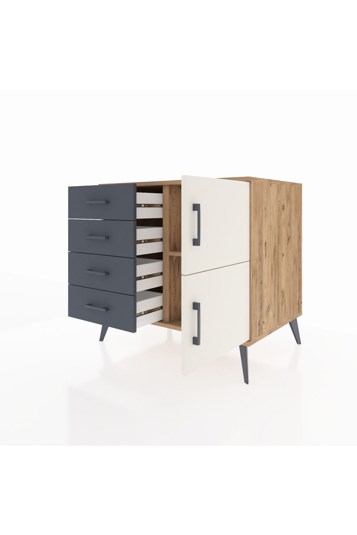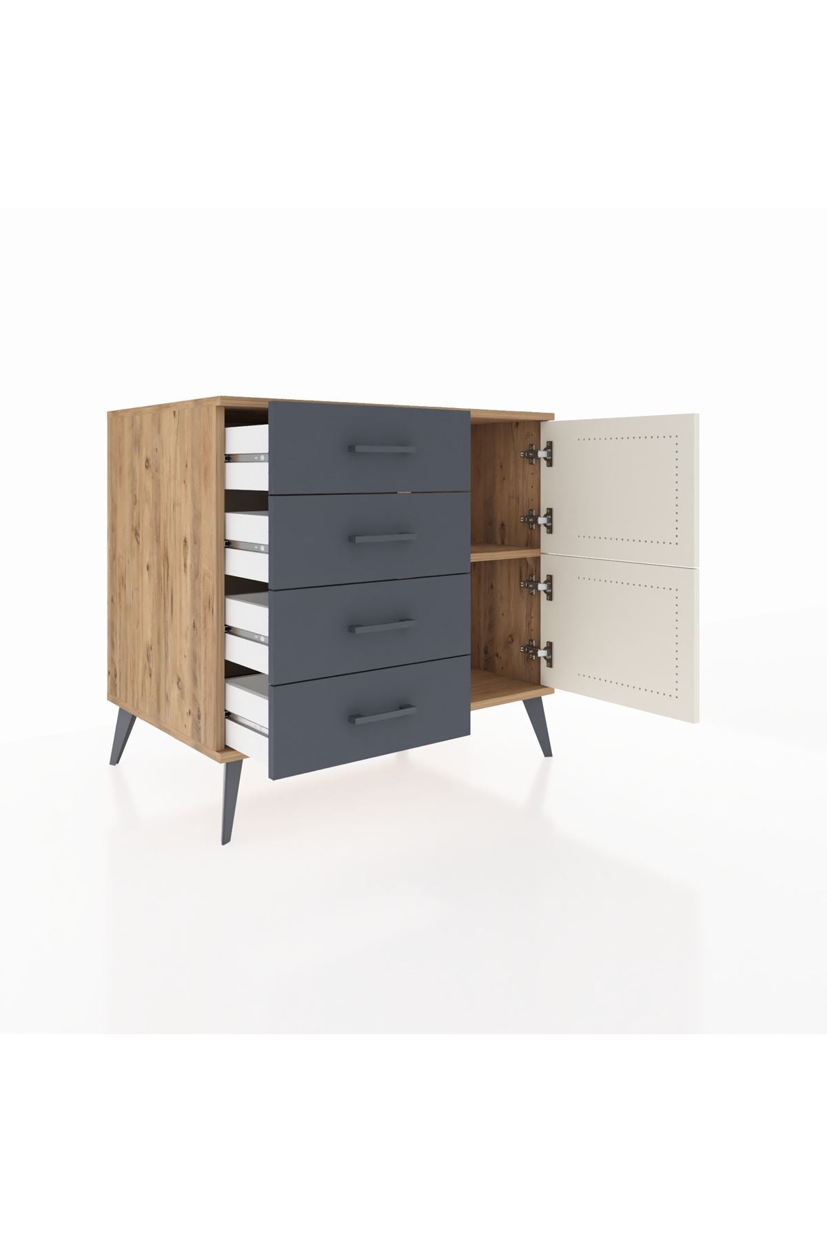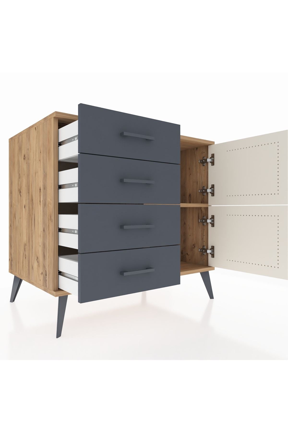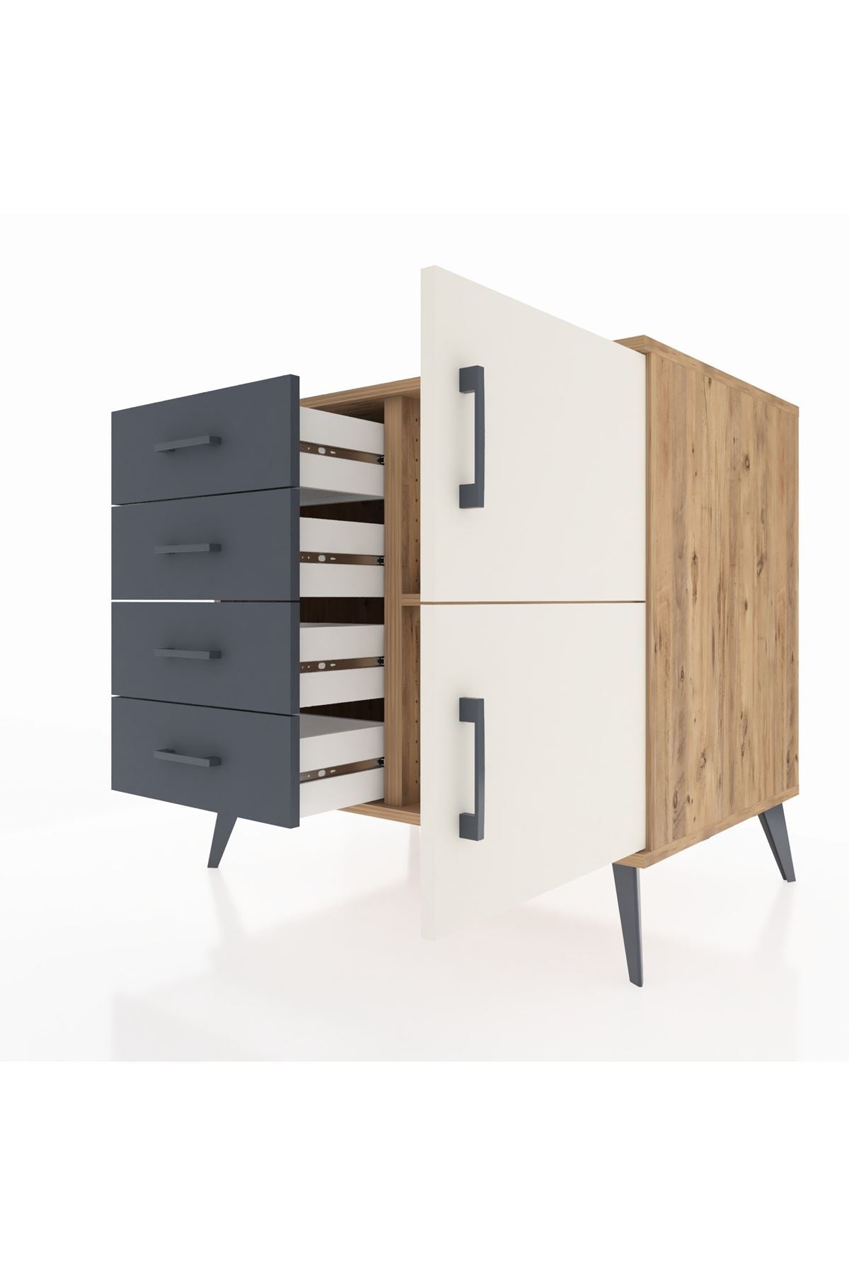 🦾 Şifonyerin metal ayakları robot süpürge kullanımına uygundur ve temizliği kolaylaştırır. Metal kulpları ise tasarıma şık bir detay katarken, ürünün dayanıklılığını artırır.