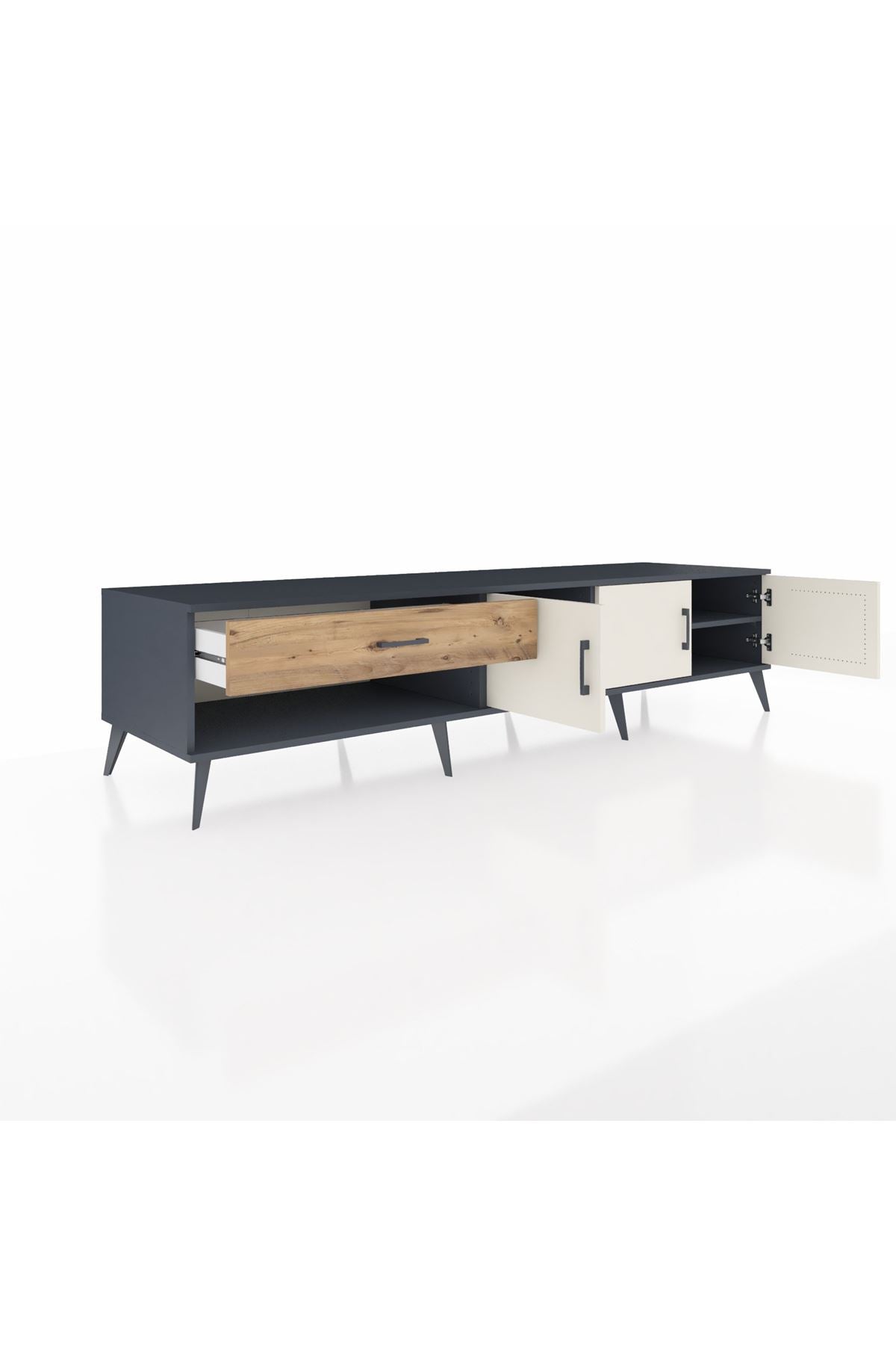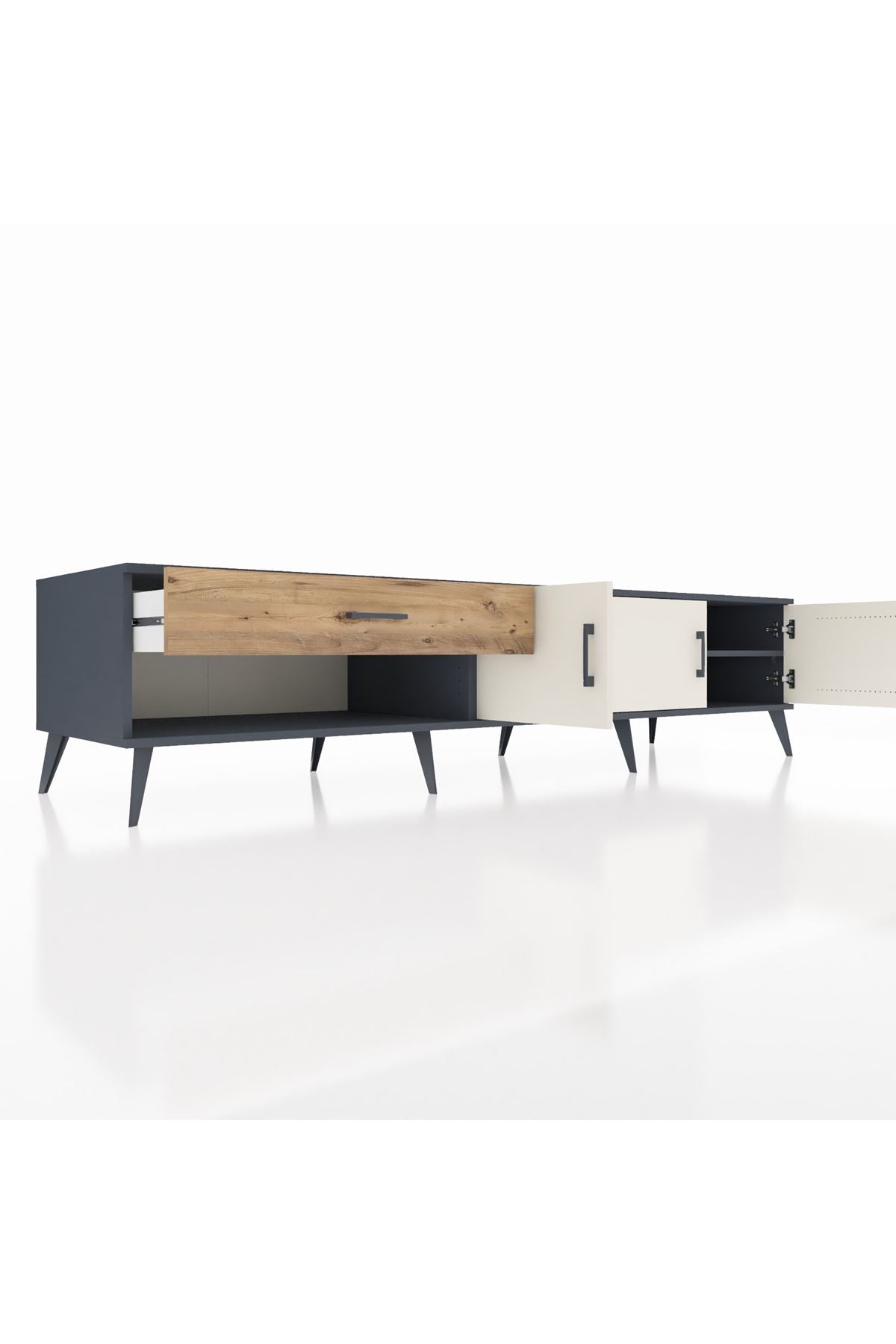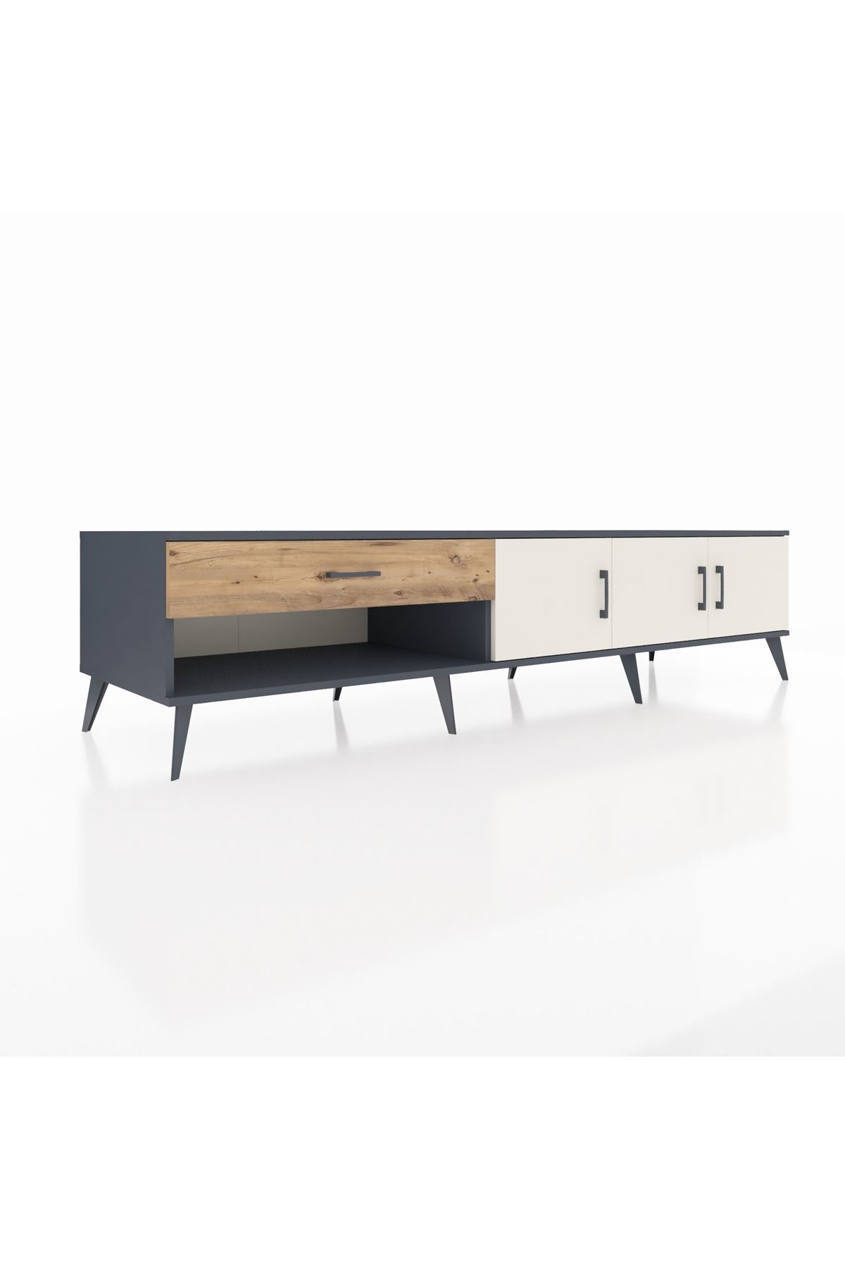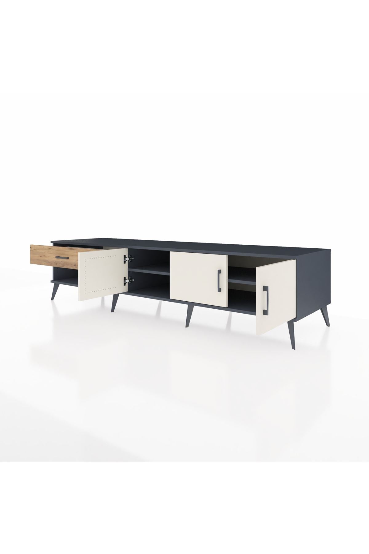 ✨ Salonunuza modern bir dokunuş katacak, şıklığı ve kullanışlılığı bir arada sunan Kronos TV Ünitesi ile tanışın! Antrasit gövdesi ve Aytaşı/Atlas Çam kapaklarıyla evinize sofistike bir hava katacak.