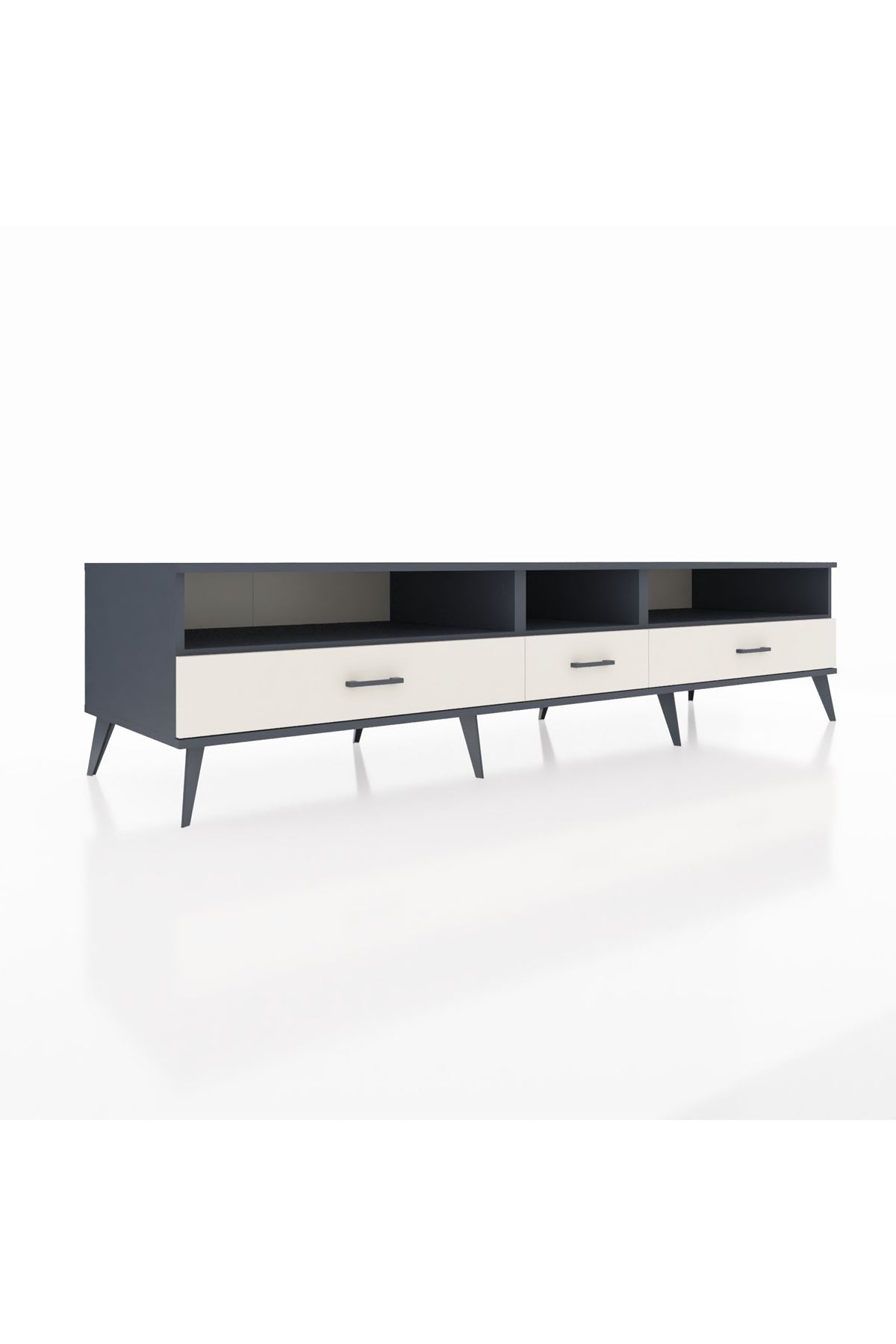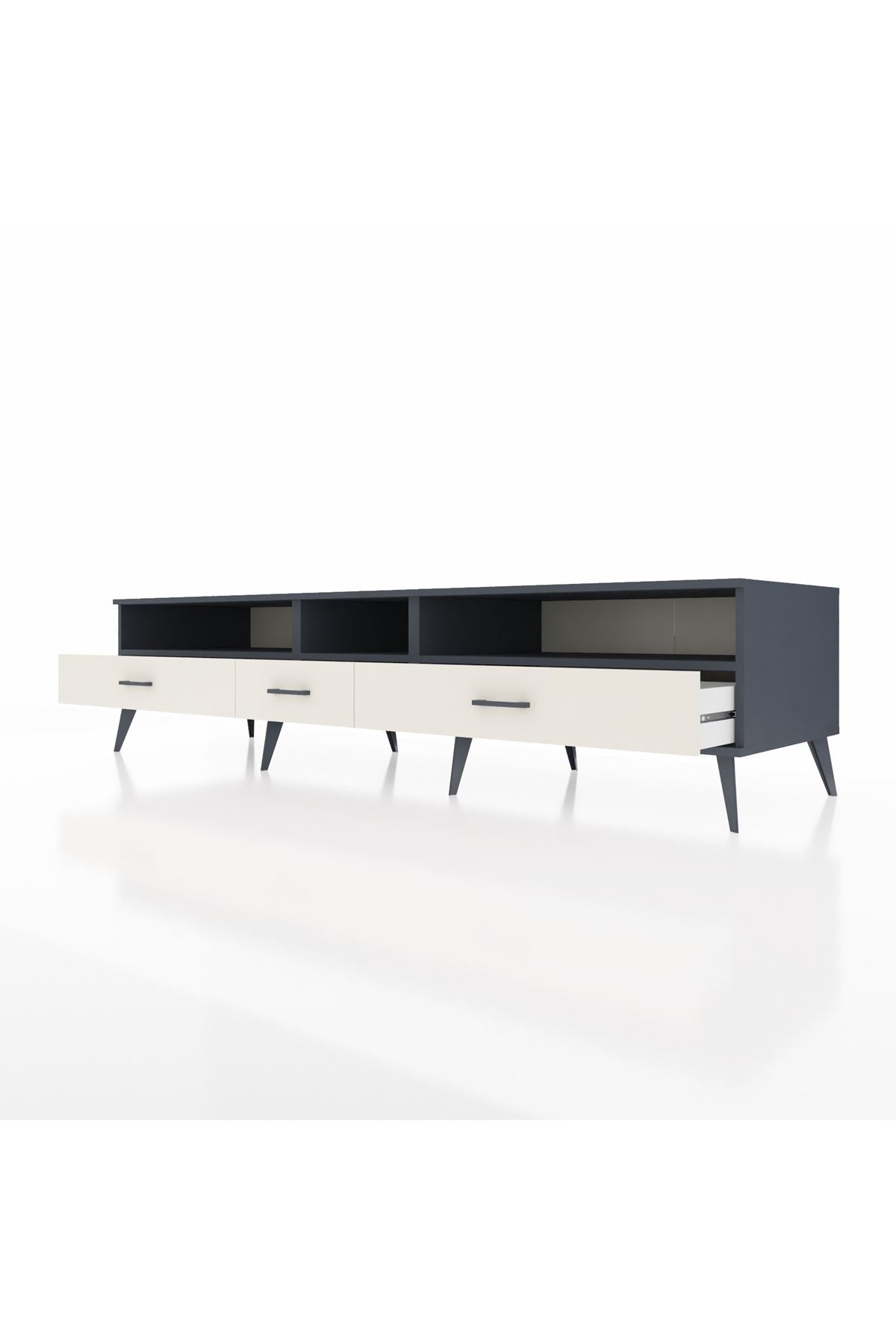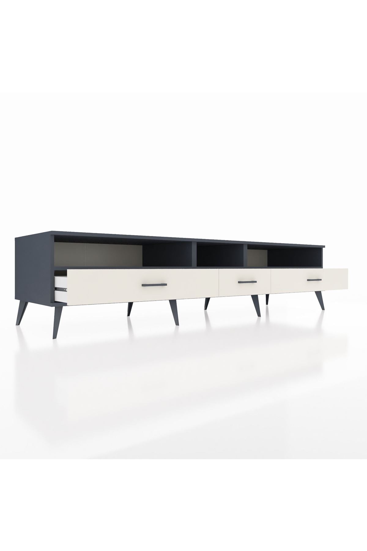 Kronos TV Ünitesi: Şık ve kullanışlı 3 raflı, 3 çekmeceli tasarım. Antrasit ve Aytaşı renklerinin uyumuyla modern bir görünüm. Ölçüler: 220x59x51 cm.
