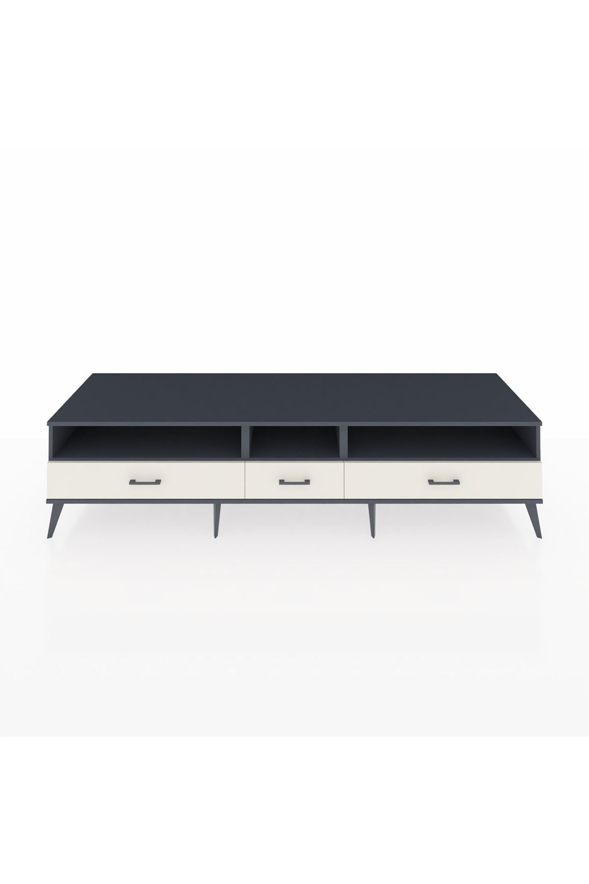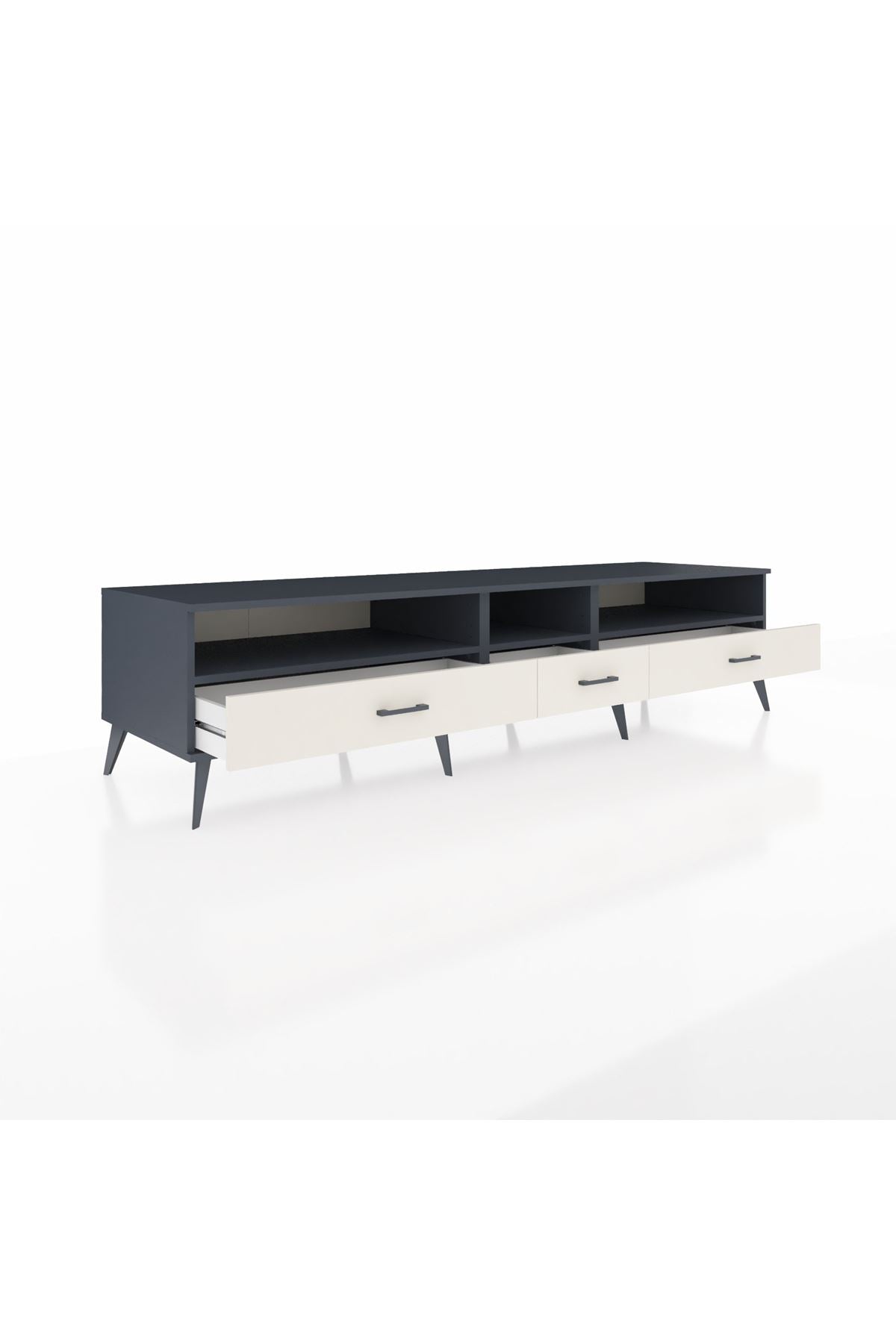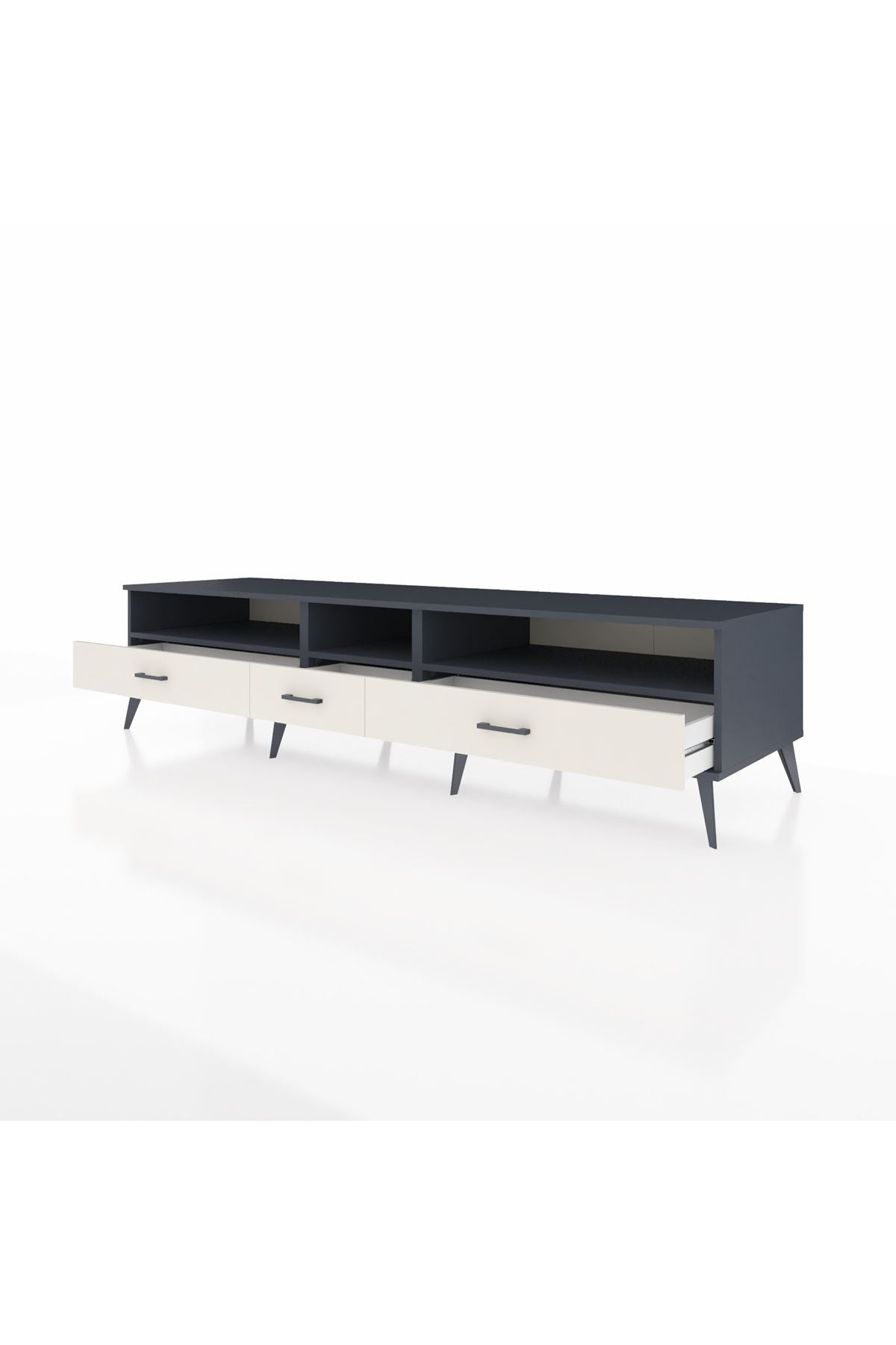 Kronos TV Ünitesi: Şık ve kullanışlı 3 raflı, 3 çekmeceli tasarım. Antrasit ve Aytaşı renklerinin uyumuyla modern bir görünüm. Ölçüler: 220x59x51 cm.
