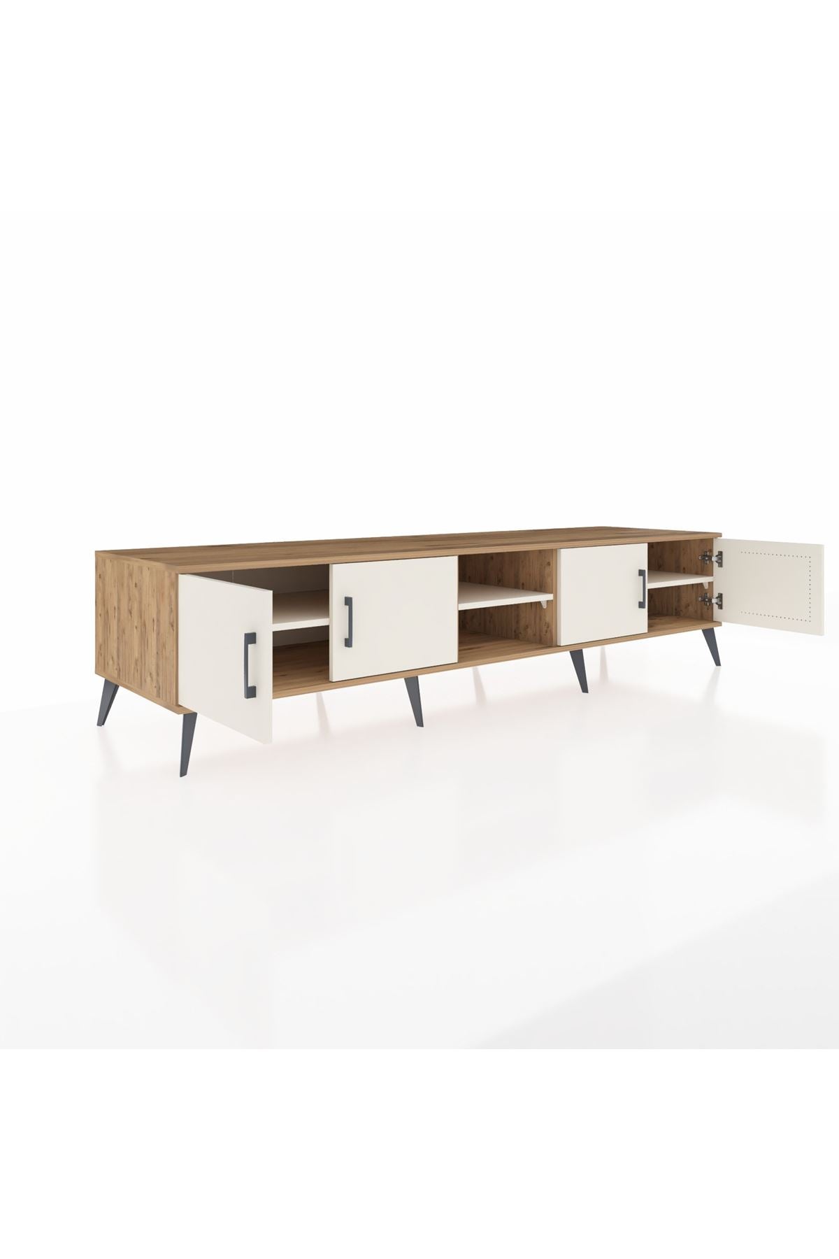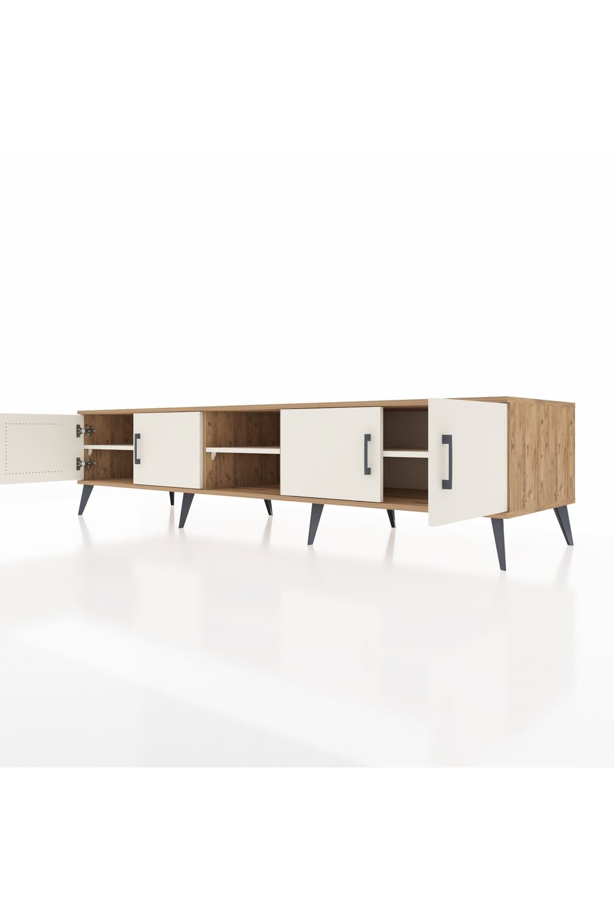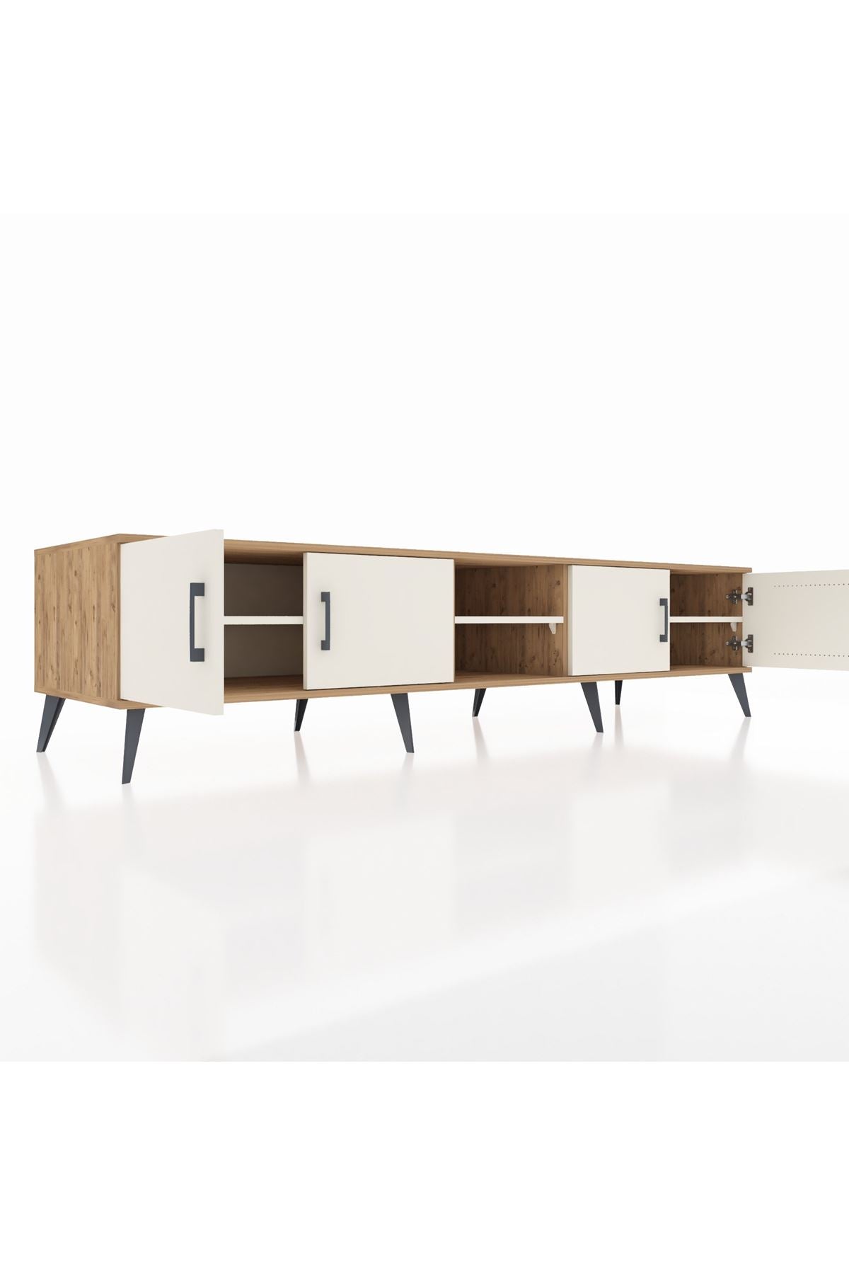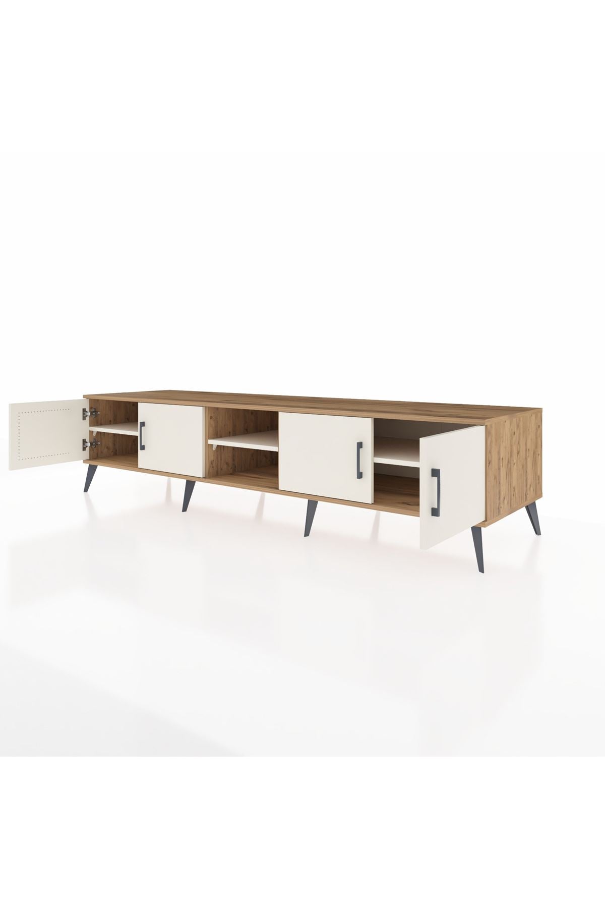 🦾 Metal ayakları sayesinde yerden yüksekte duran bu şık tasarım, robot süpürge kullanımına da uygundur. Metal kulplar, ünitenin modern görünümünü tamamlar ve sağlamlığı artırır.