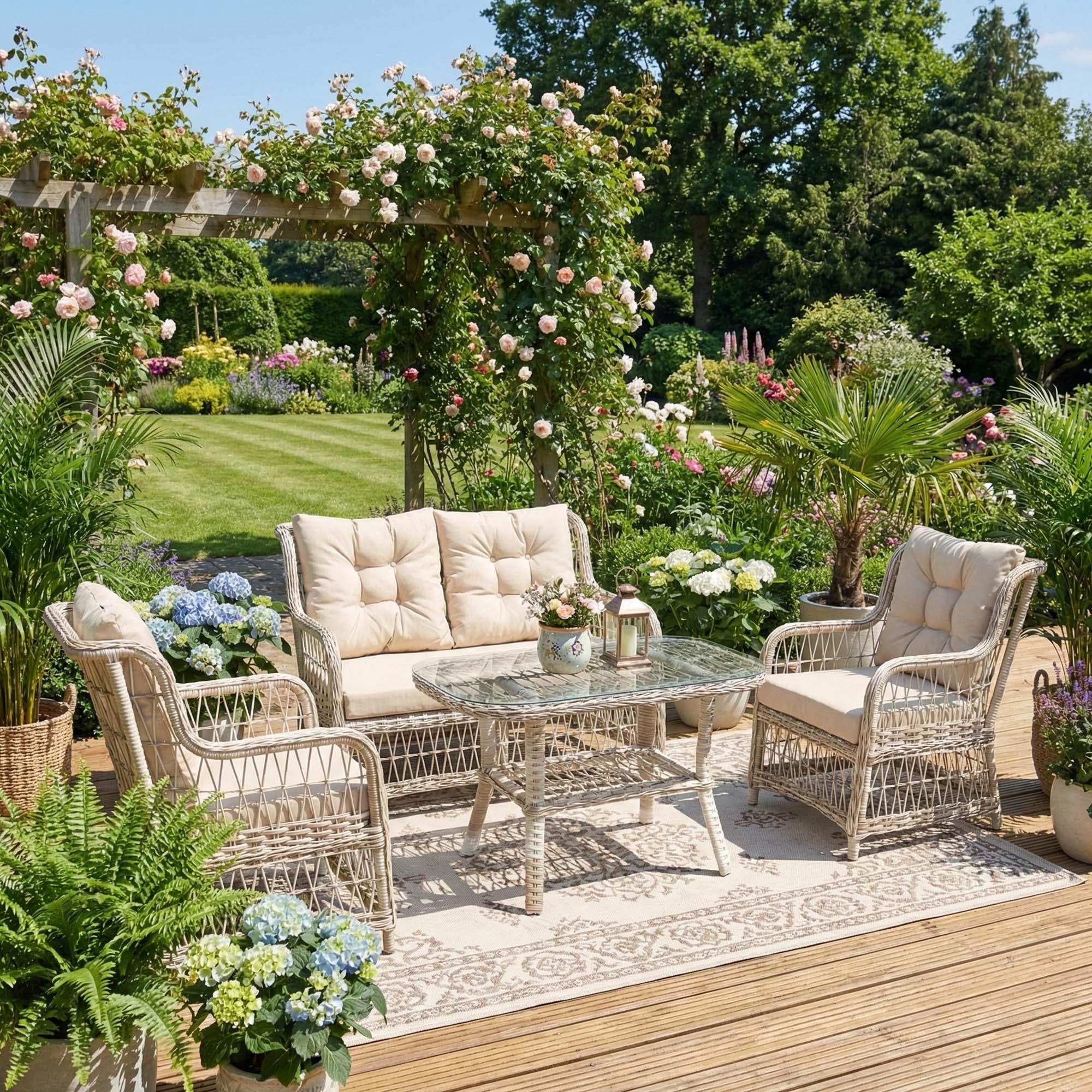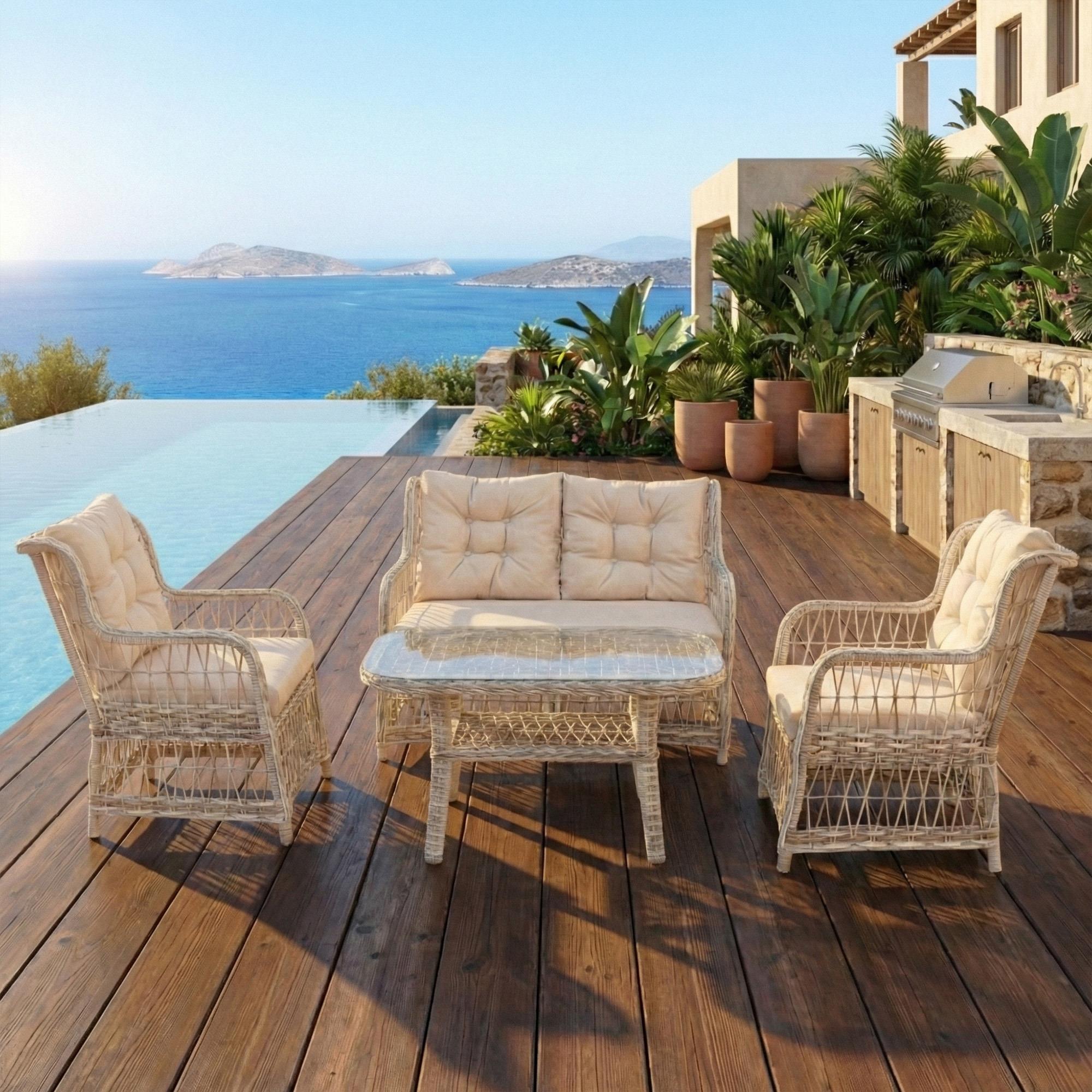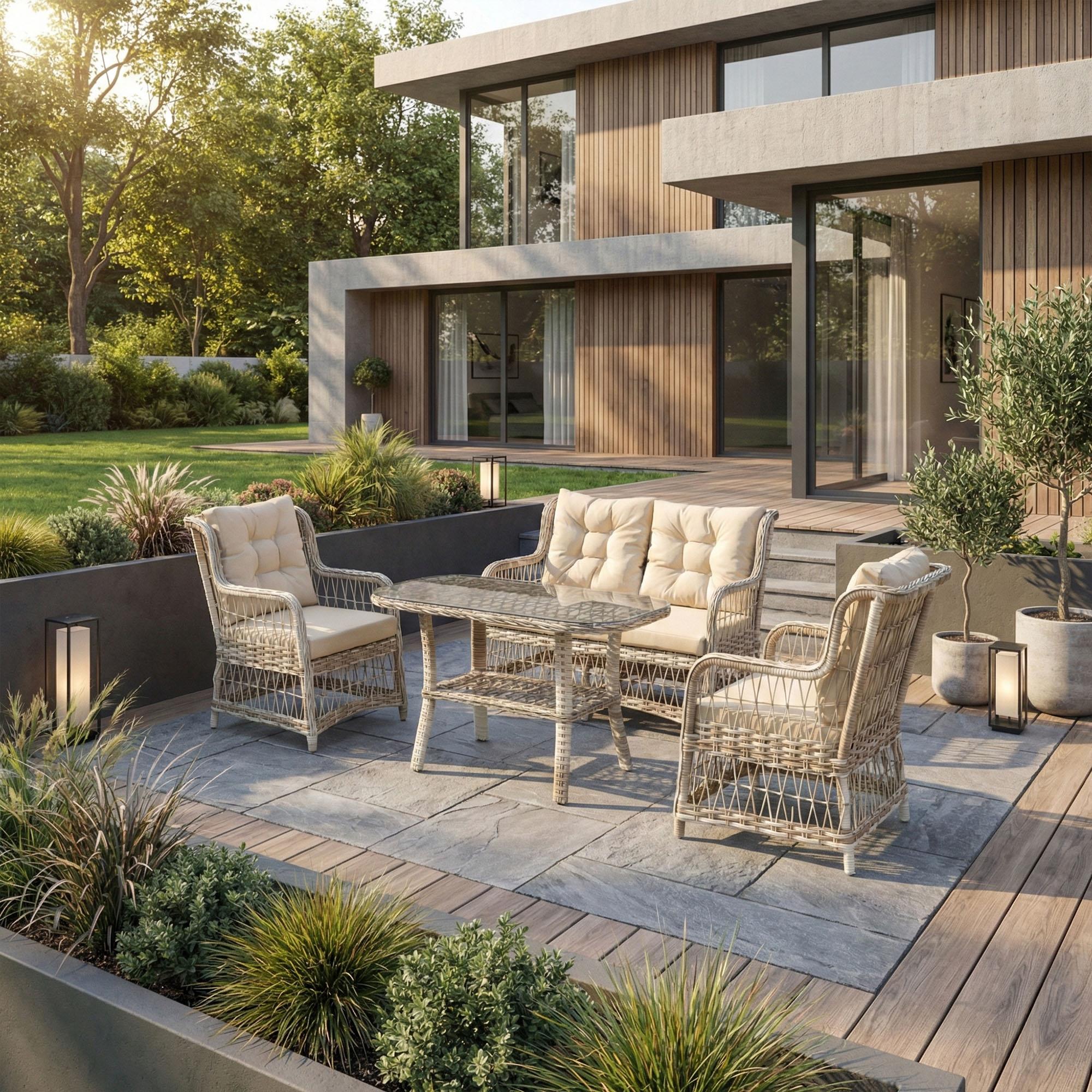 LaVida Bahçe Oturma Takımı, alüminyum iskelet ve rattan örgü yapısıyla balkon ve bahçe kullanımına uygun, dayanıklı ve konforlu bir dış mekan oturma takımıdır.