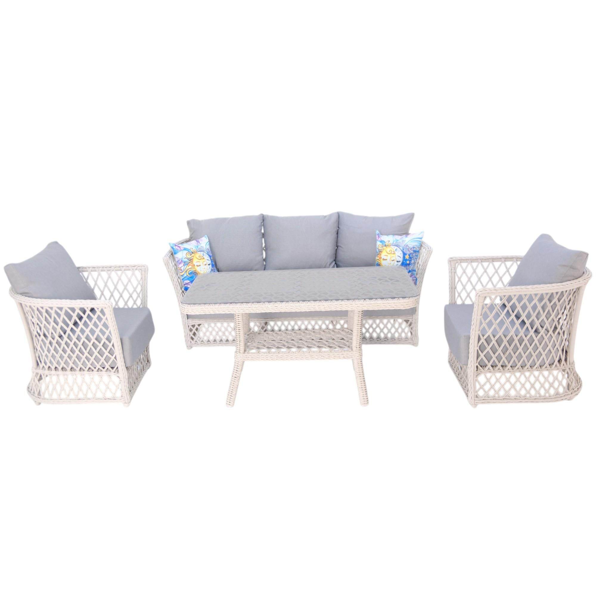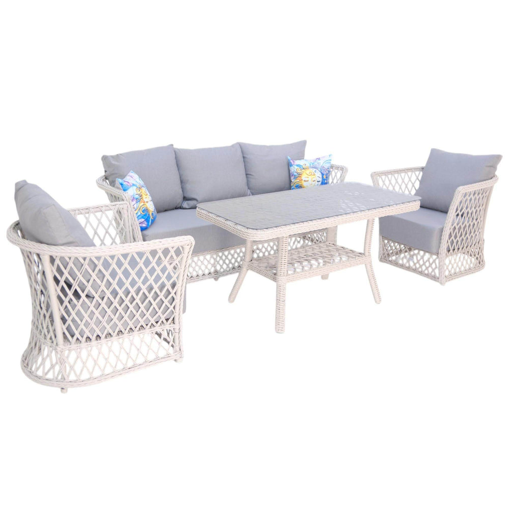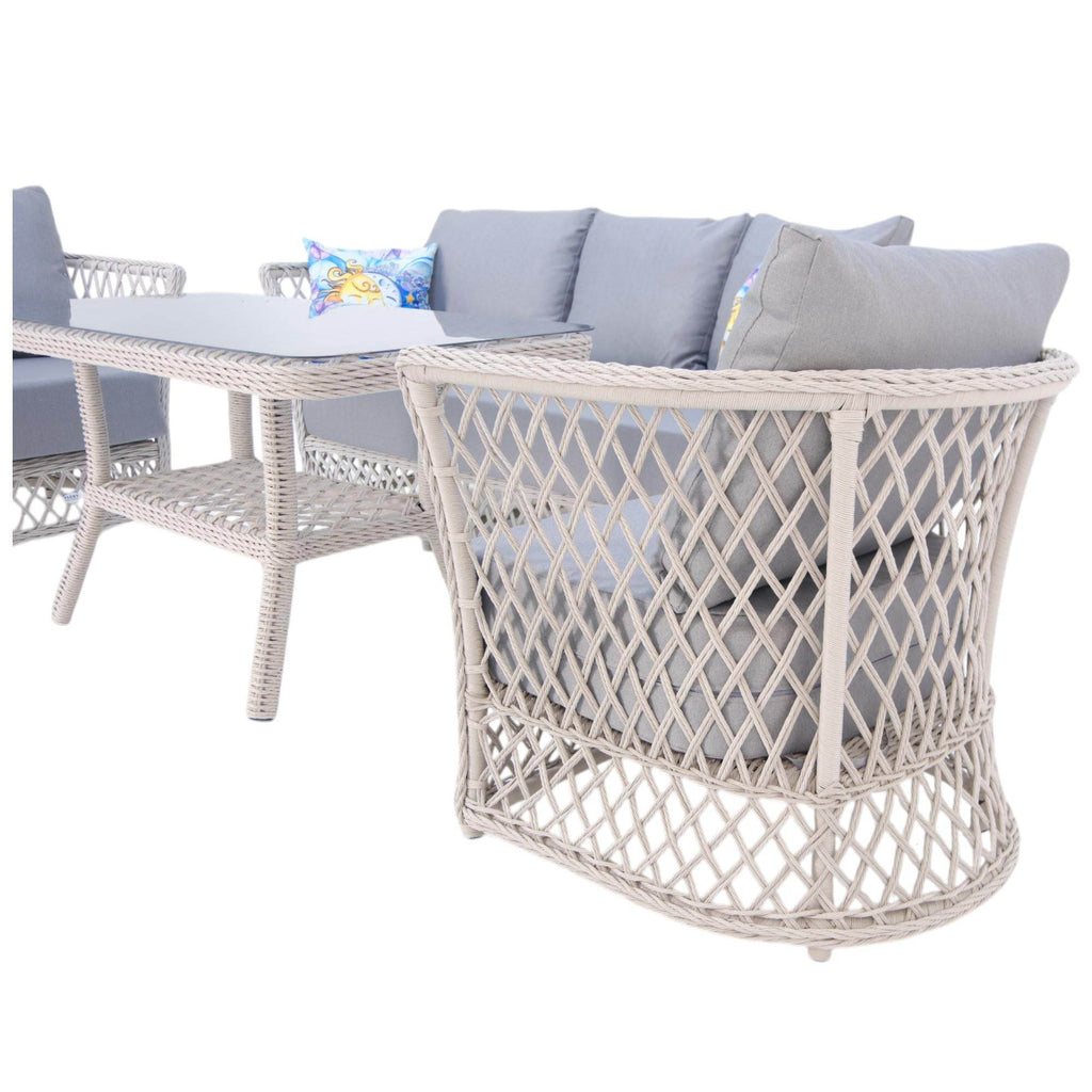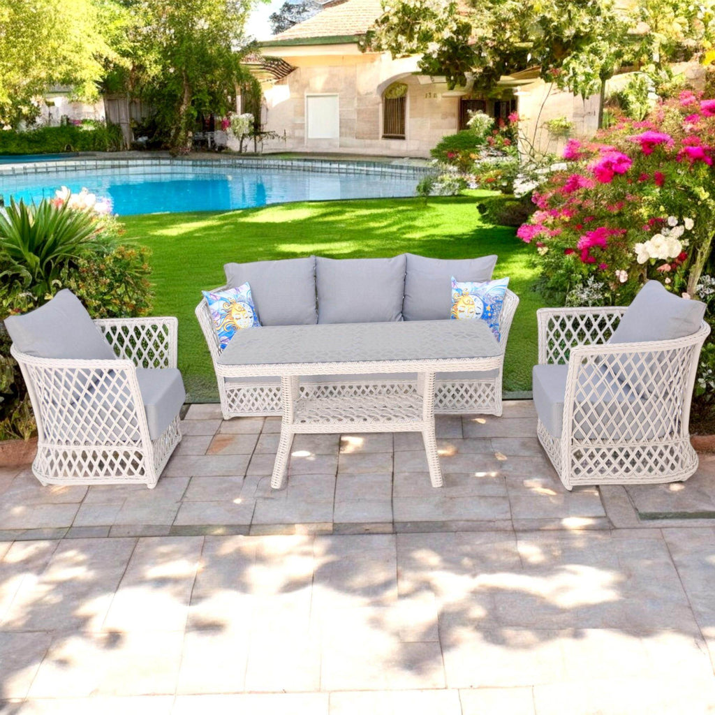 Neris Bahçe Oturma Grubu, geniş oturum alanı ve ergonomik yapısıyla konforu ön planda tutuyor. Üçlü bahçe takımı olarak, bir adet üçlü koltuk, iki adet tekli koltuk ve geniş yüzeyli bir masa ile tamamlanan bu set, bahçe, balkon, teras veya havuz kenarında keyifli anlar yaşamanız için ideal. Gri tonlarındaki dolgulu minderler, oturum süresini uzatırken nefes alabilen ve kolay temizlenebilir kumaşı ile hem estetik hem de hijyenik bir kullanım sunar.