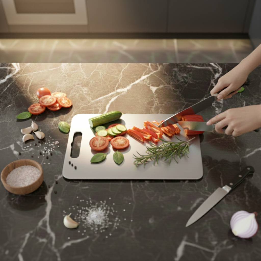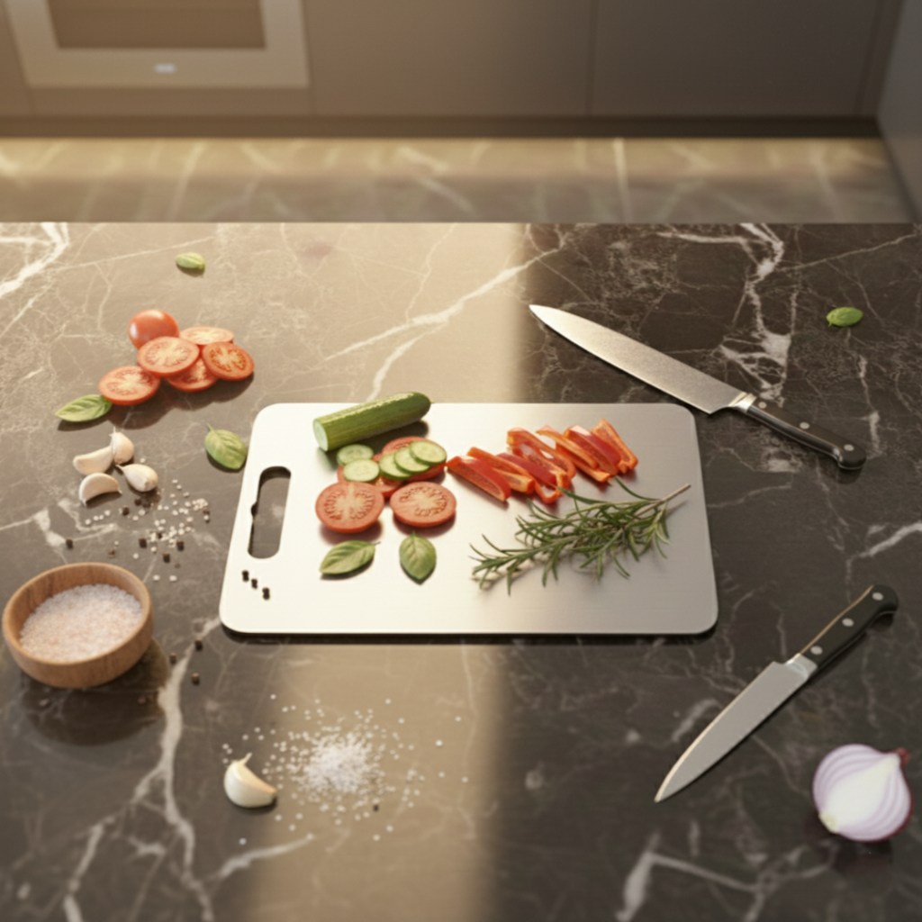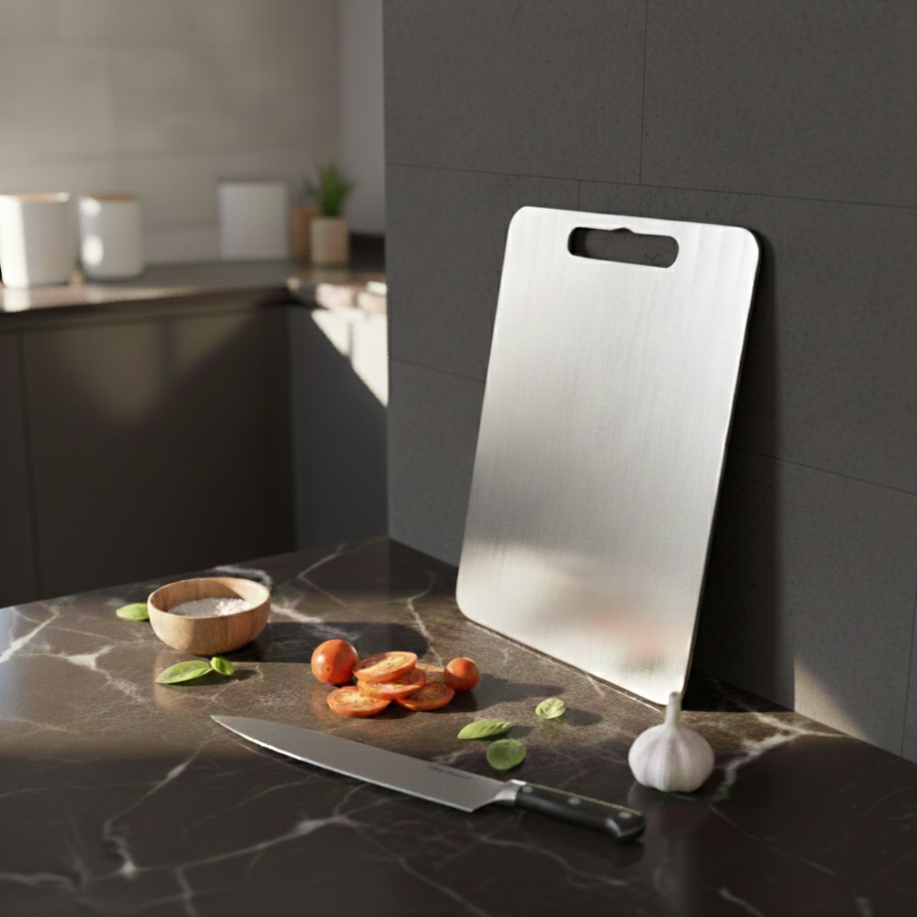 Chalybes paslanmaz çelik kesme tahtası, mutfakta hijyenik, dayanıklı ve uzun ömürlü bir hazırlık yüzeyi arayan kullanıcılar için tasarlanmıştır. 32 x 21 cm ölçüsü sayesinde günlük mutfak kullanımına uygundur, tezgah üzerinde fazla yer kaplamadan pratik bir çalışma alanı sunar. Paslanmaz çelik yüzeyi sayesinde ahşap ve plastik kesme tahtalarına kıyasla daha hijyenik ve uzun ömürlü bir kullanım sunar. Bulaşık makinesinde yıkanabilir mi? Hangi gıdalar için uygundur? Yüzeyde koku kalır mı?Öne Çıkan Özellikler