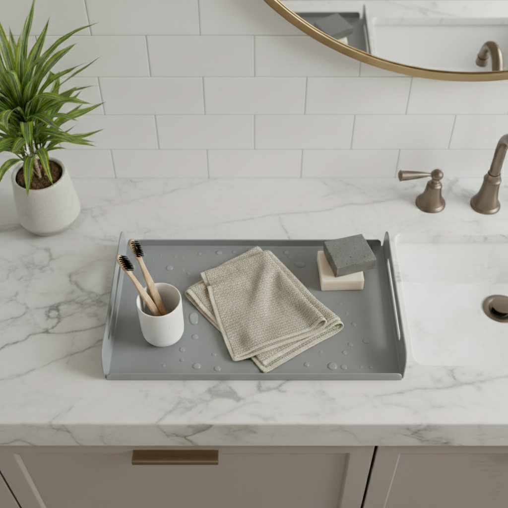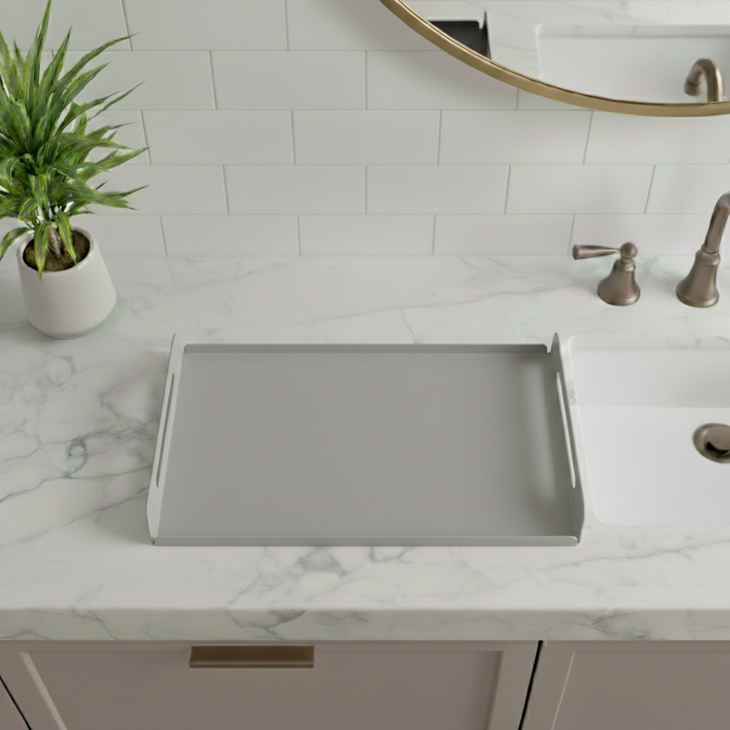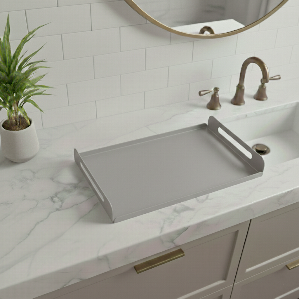 Premium Açık Gri Galvaniz Banyo Düzenleyici Tepsi, lavabo üstünde kişisel bakım ürünlerinizi tek bir alanda toplamak ve düzenli bir görünüm oluşturmak için tasarlanmış tezgah üstü bir düzenleyicidir. Banyo ve mutfakta düzen arayan, ürünlerini dağınıklık oluşturmadan sergilemek isteyen kullanıcılar için uygundur; galvaniz kaplama metal yapısı sayesinde neme ve su sıçramalarına karşı dayanıklı, uzun ömürlü bir kullanım sunar. Lavabo üstünde sık kullanılan ürünleri bir arada tutarak düzen sağlar; farklı alanlarda da pratik bir düzenleyici olarak kullanılabilir. Plastik tepsilere kıyasla daha dayanıklı bir gövde sunar; düzenleyici kenar formu sayesinde ürünleri daha güvenli bir şekilde bir arada tutmaya yardımcı olur. Bu tepsi suya dayanıklı mı? Temizliği nasıl yapılır? Sadece banyoda mı kullanılır?Öne Çıkan Özellikler