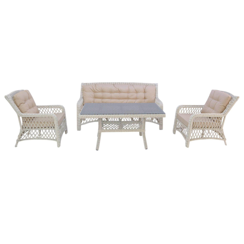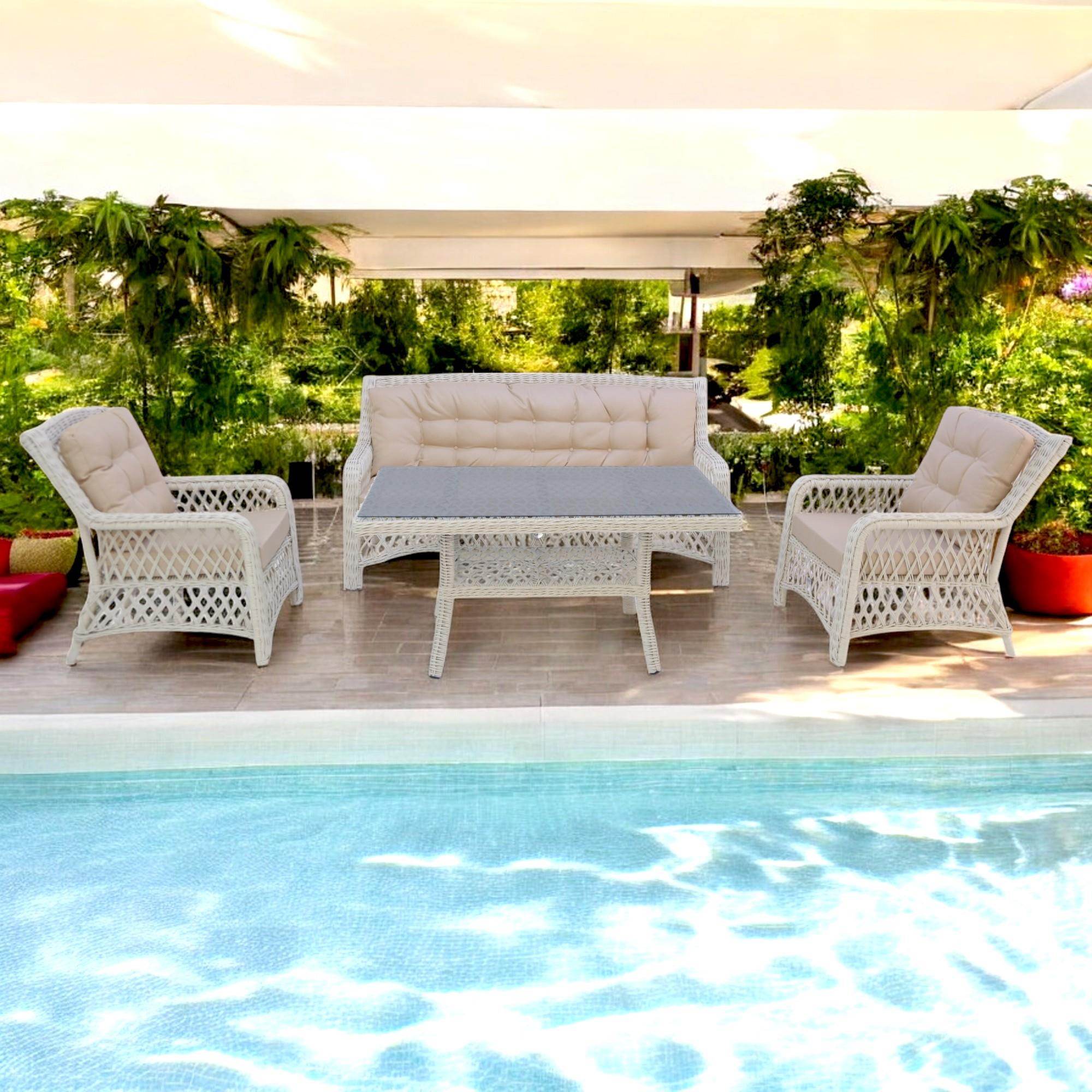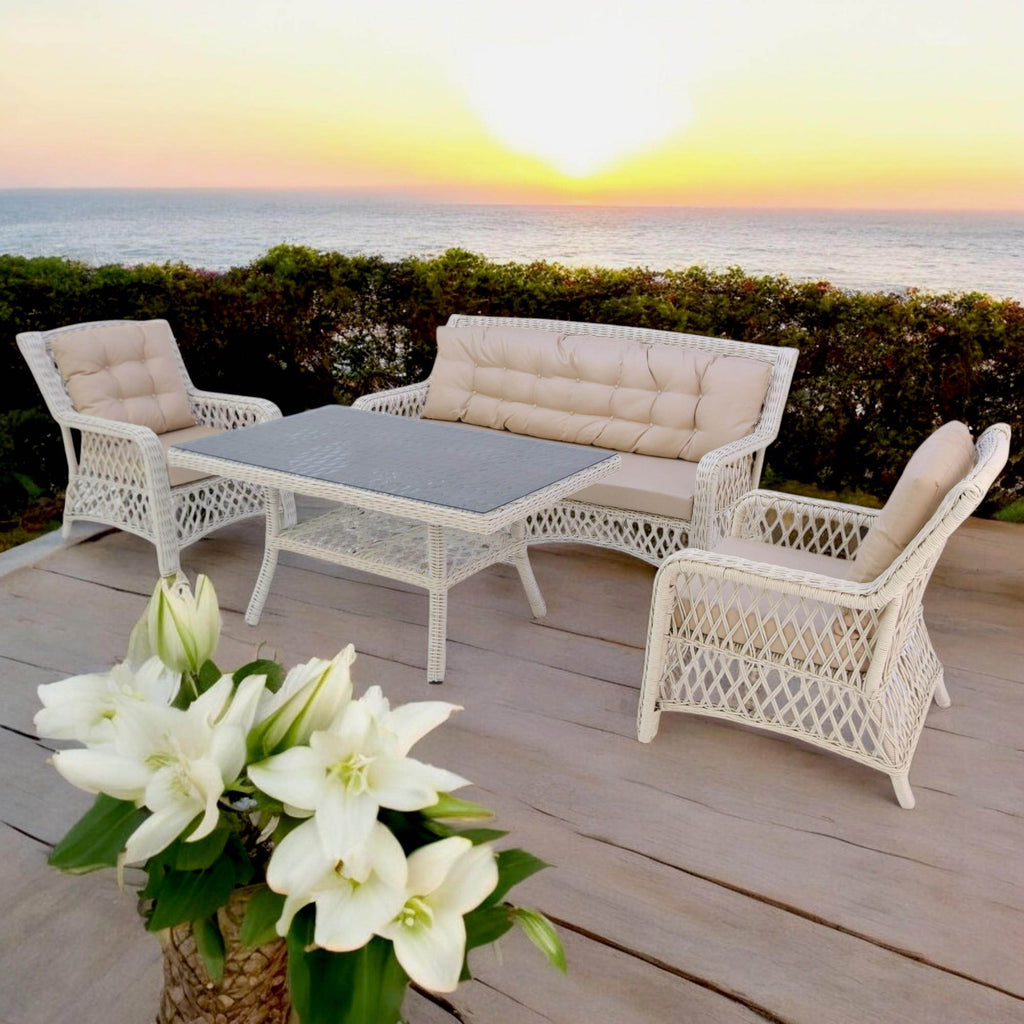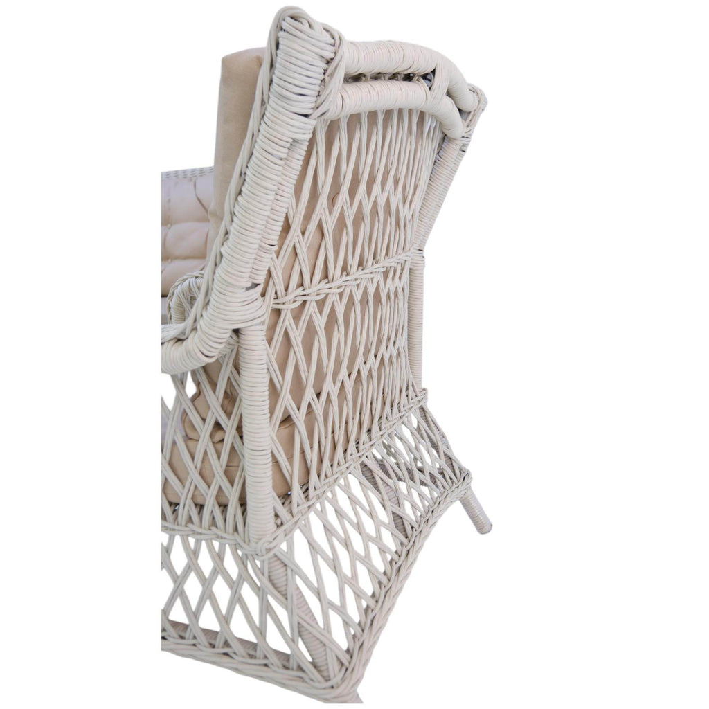 - Krem tonlarındaki minderler ve beyaz rattan iskelet, ferah bir ortam oluşturur ve her dekorasyona uyum sağlar.