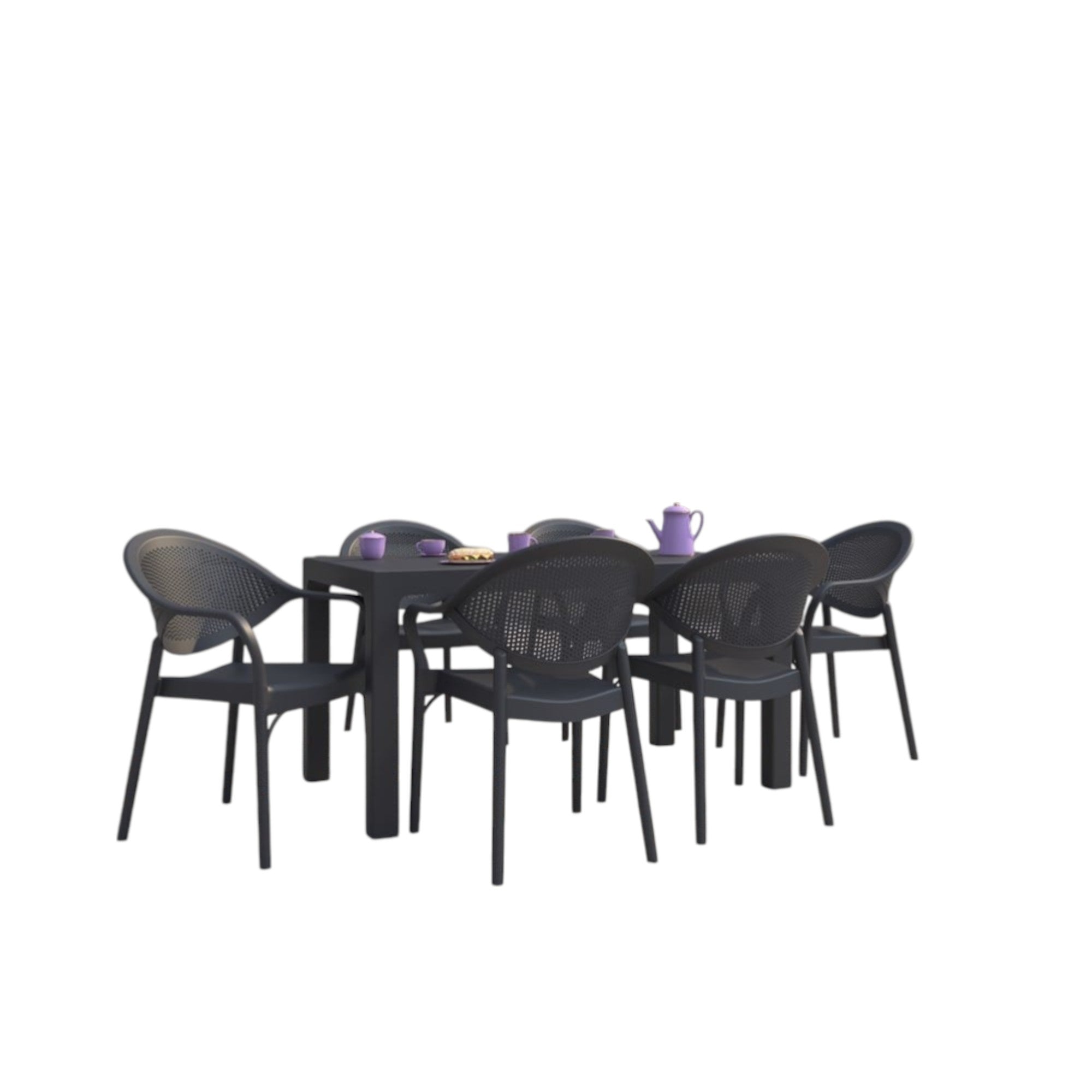 Rehome Arizona 80x140 Masalı 6 Sandalyeli Plastik Bahçe Masa Takımı (Antrasit), dış mekânda yemek yeme ve misafir ağırlama ihtiyacı dikkate alınarak tasarlanmış 6 kişilik bir bahçe masa-sandalye seti çözümüdür.