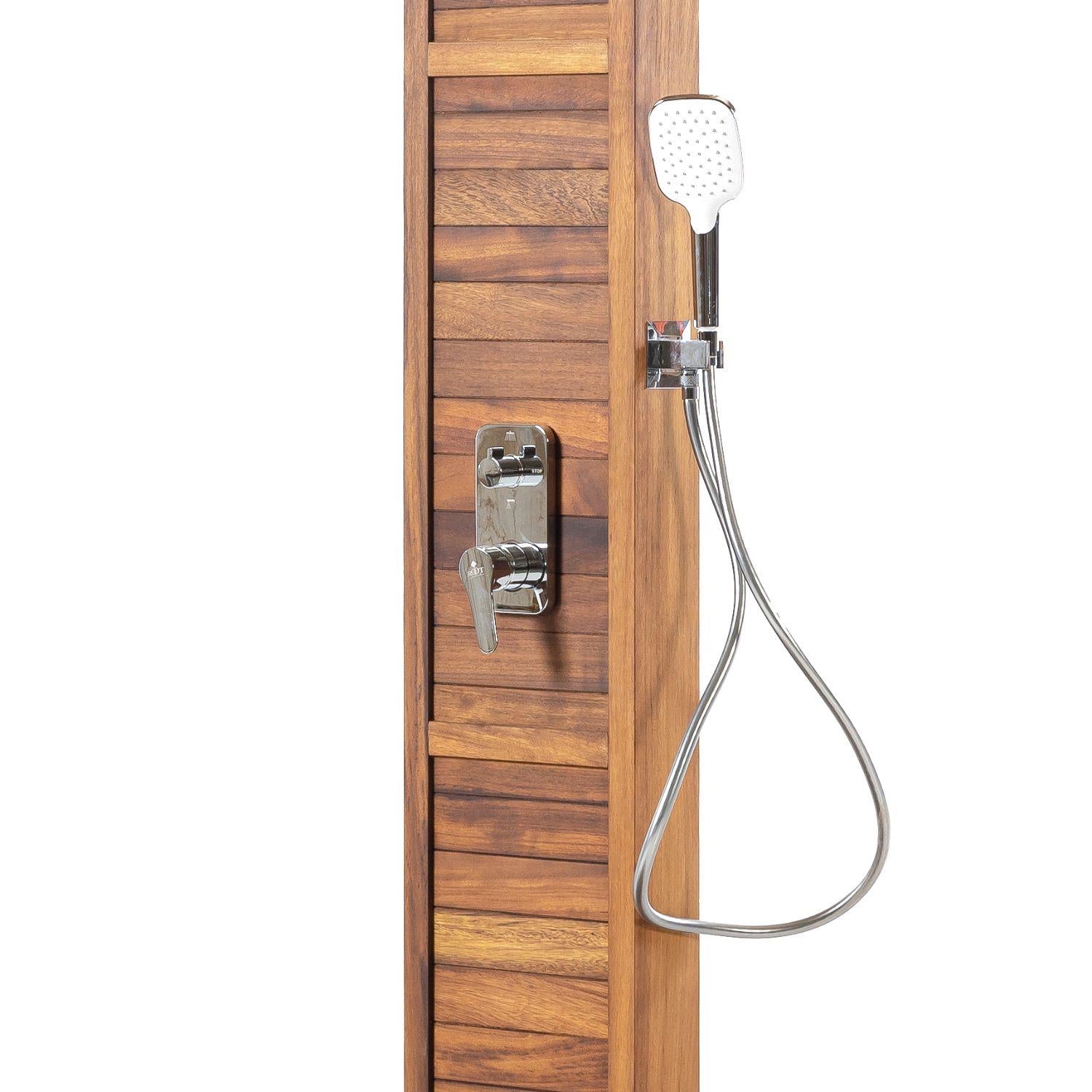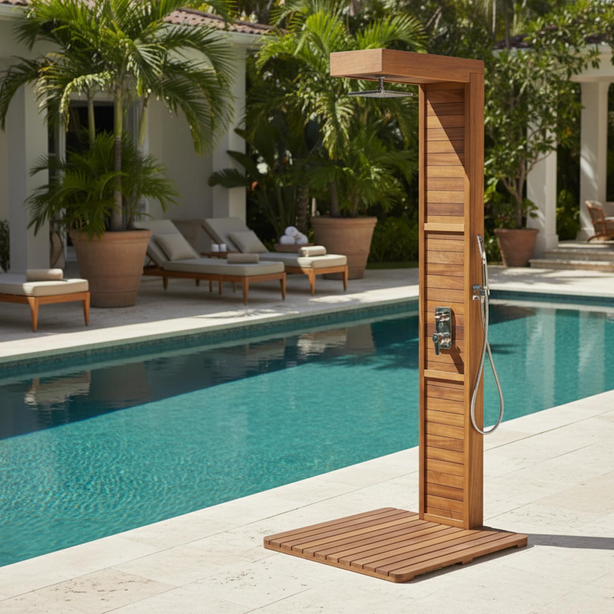 İroko’nun doğal damarları ve fırın kurutma işlemi, UV dayanımlı havuz duşu arayanlar için uzun ömürlü renk koruması sunar. Tek hortum bağlantılı tasarım, taşınabilir bahçe duşu veya karavan dış duş senaryolarında bile kolay kurulum imkânı tanır. Böylece dış mekan duş seti, duş kulesi, dış mekan duş sistemleri ya da duş paneli ahşap arayışlarınızın hepsine tek çözüm getirir.