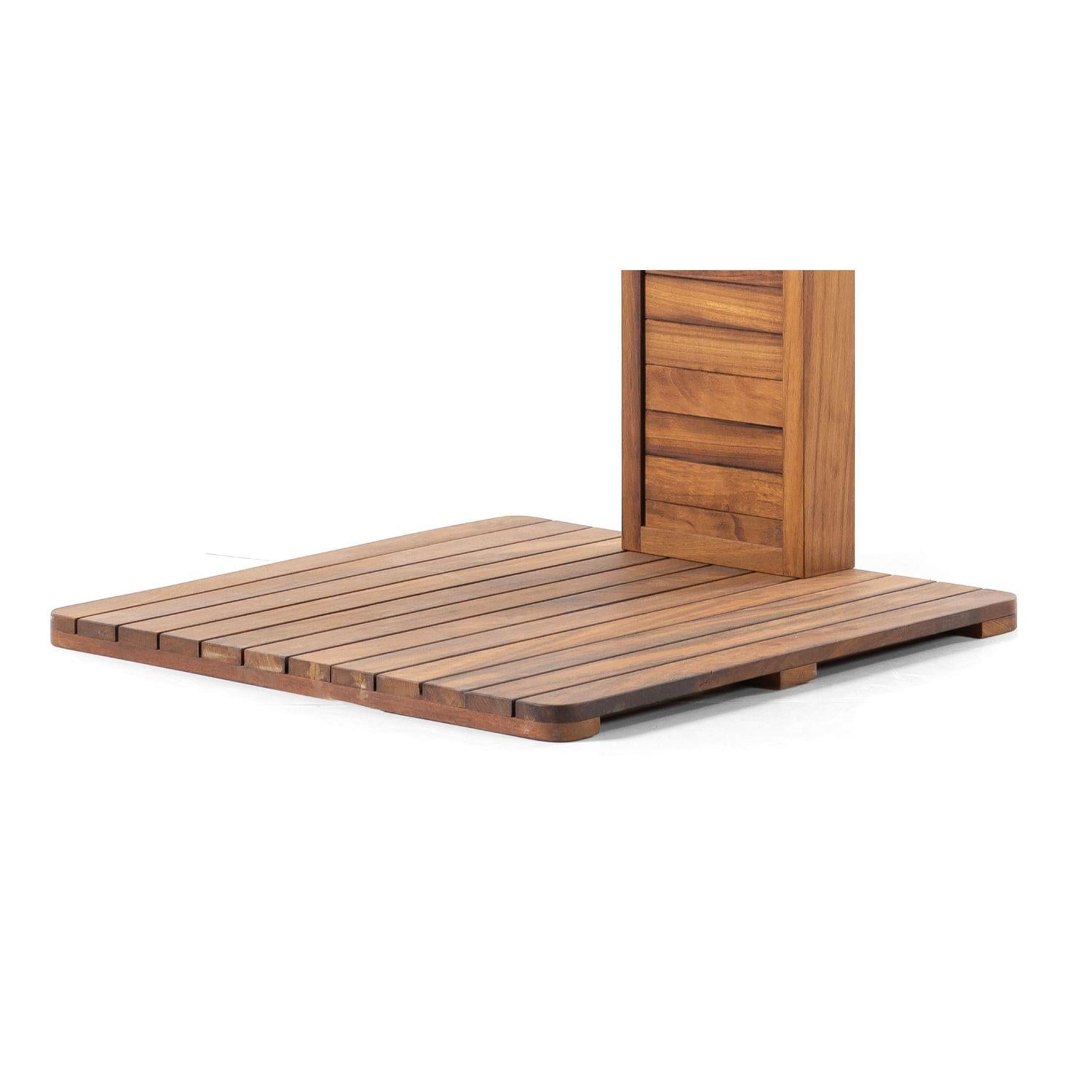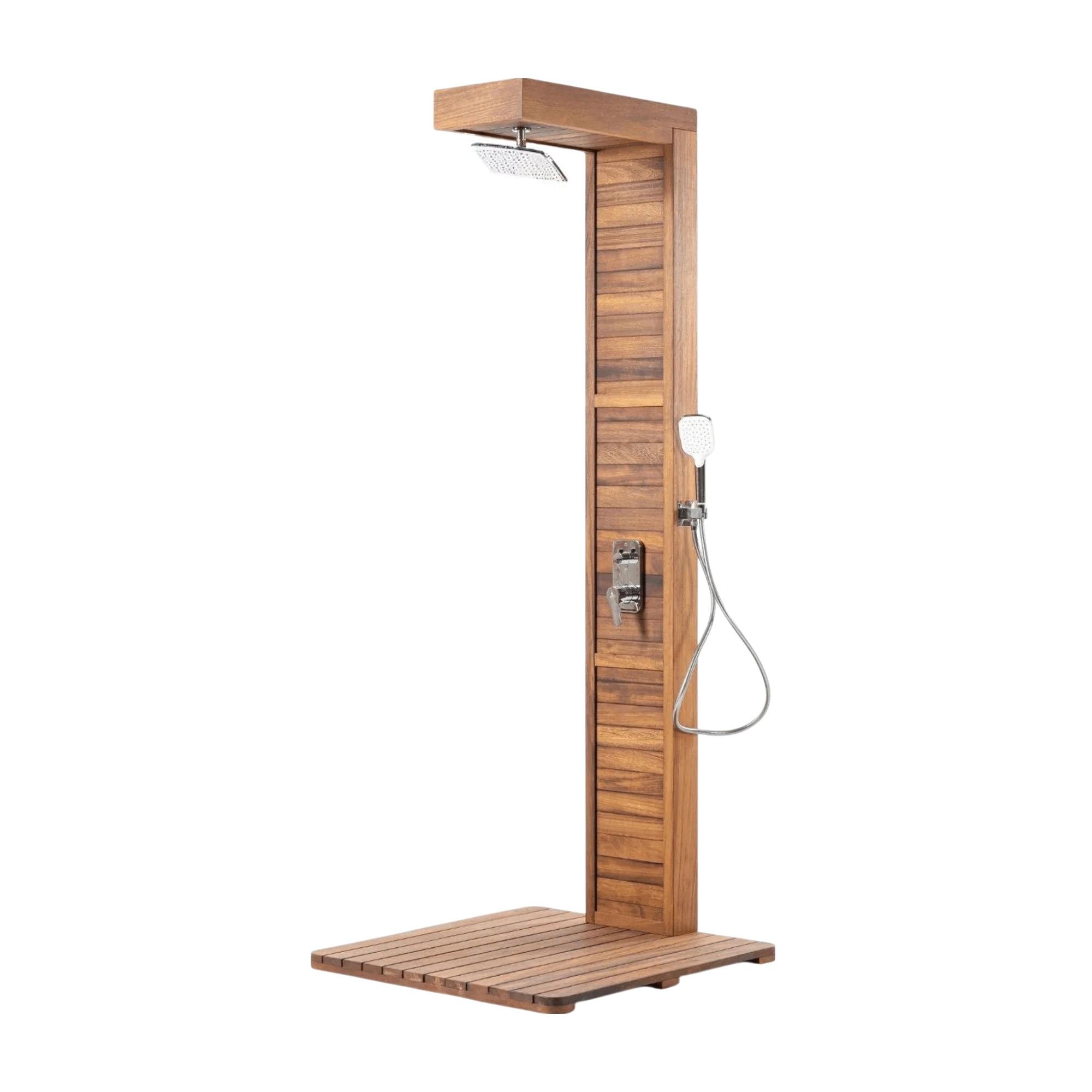 Eiffel’in modern, minimalist duş kolonu silueti; iroko ahşabın sıcak tonlarıyla paslanmaz çelik detayları birleştirerek hem bahçe duşu hem de lüks havuz duşu ortamlarında estetik bir odak noktası yaratır. 90 × 90 cm kare platform, geniş yağmurlama başlıklı dış mekan duş deneyimi sunarken kaymaz ızgara zeminiyle vücut kum duşu sonrası güvenli kullanım sağlar. İster villa terasında ister plaj duşu alanında olsun, Eiffel; açık hava duşu ihtiyacınızı zarif hatlarıyla karşılayan bir duş kulesidir.