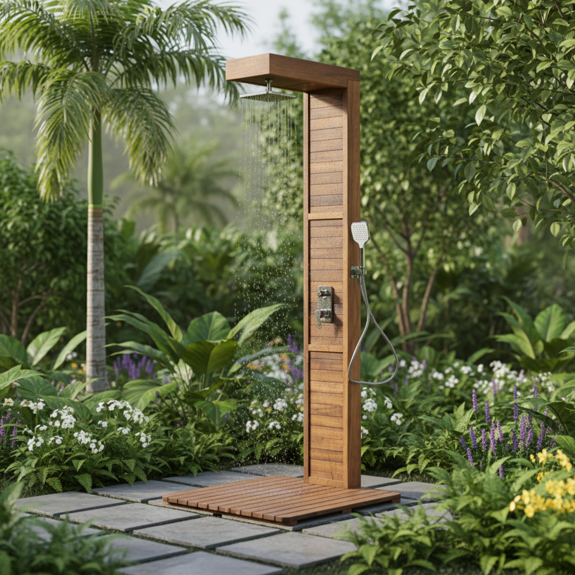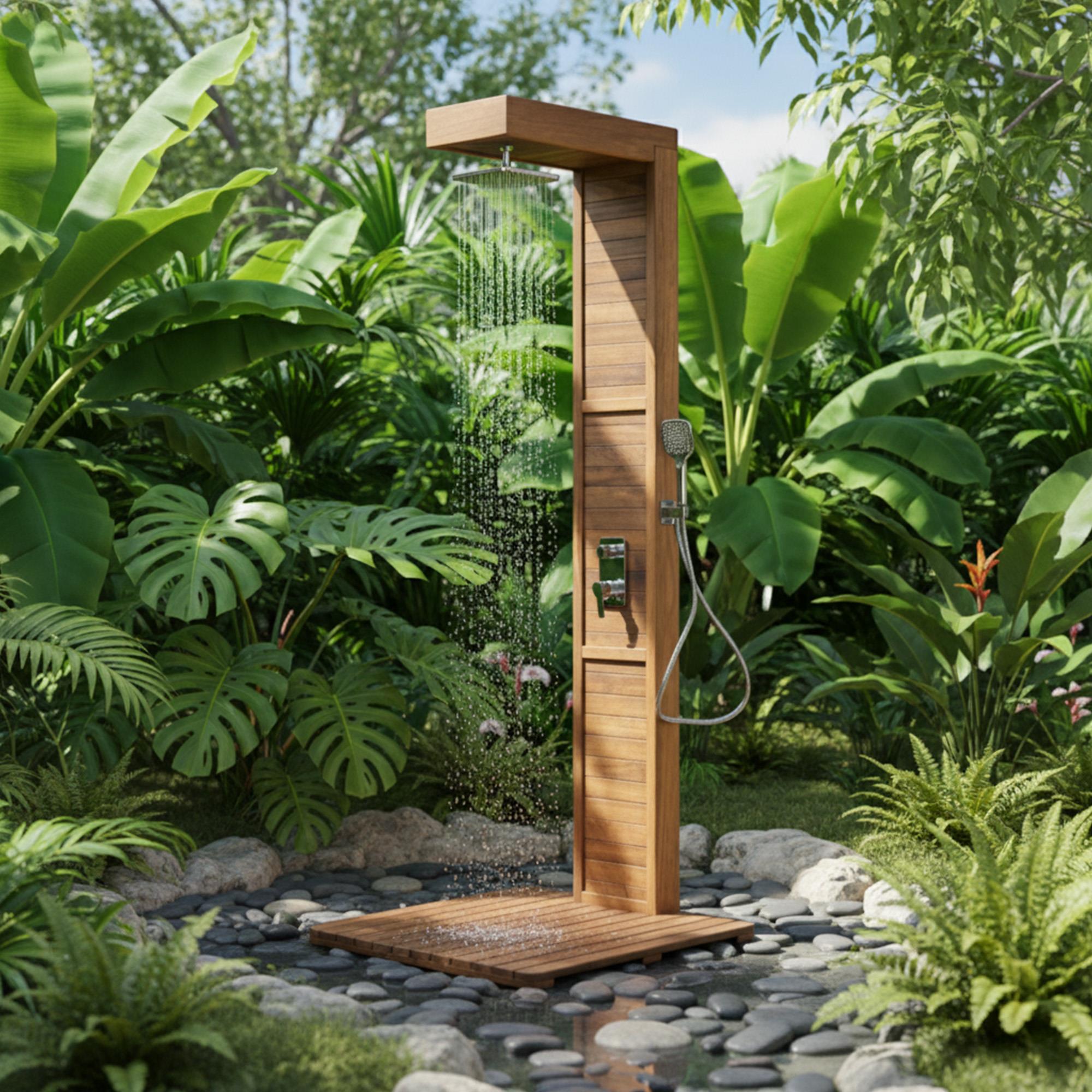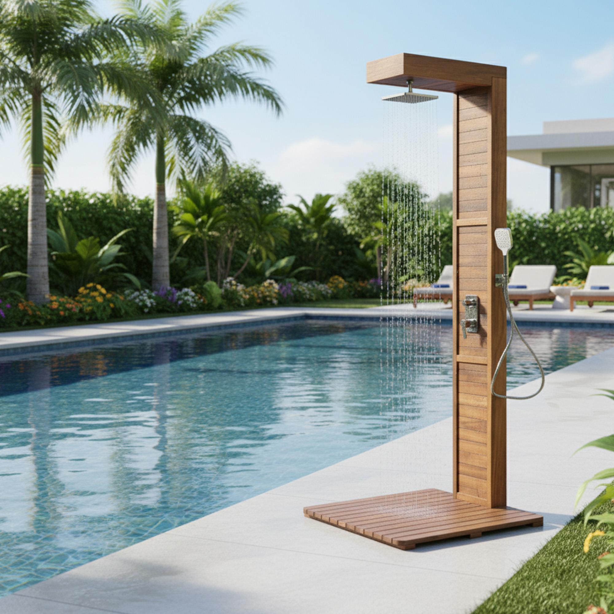 Havuz kenarında ferah havuz duşu, yazlık bahçede şık duş kolonu veya sahil işletmelerinde dayanıklı plaj duşu… Eiffel Bahçe Duşu, tropik iroko gövdesi ve paslanmaz armatürüyle dört mevsim dış mekâna meydan okur.