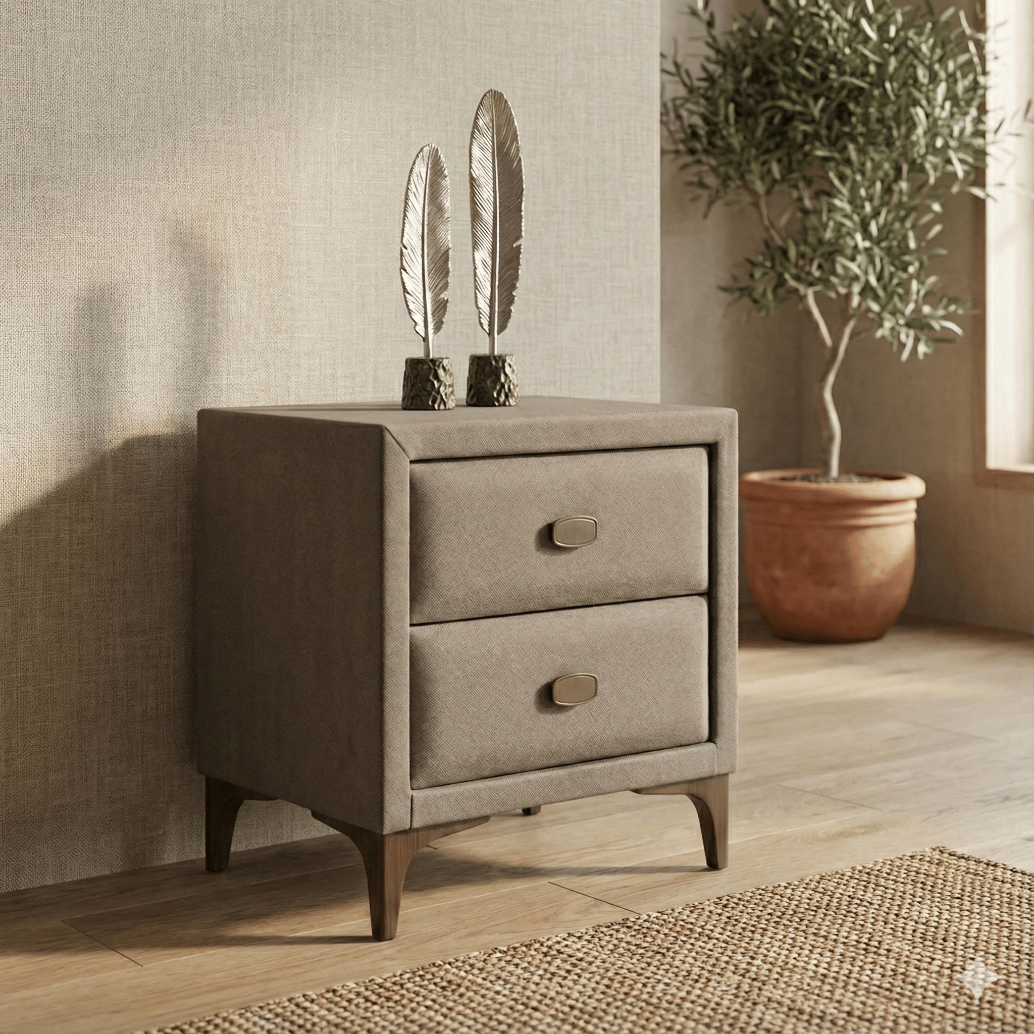 Ürün Açıklaması: Yatak odanızın zarafetini tamamlayacak, estetik ve fonksiyonelliği bir araya getiren bu özel tasarım komodin ile tanışın. Rehome Fumat Baza Başlık Yatak Seti ile kusursuz bir uyum sağlamak üzere tasarlanan bu ürün, kumaş dokusu ve modern çizgileriyle yatak odanıza sofistike bir hava katar.