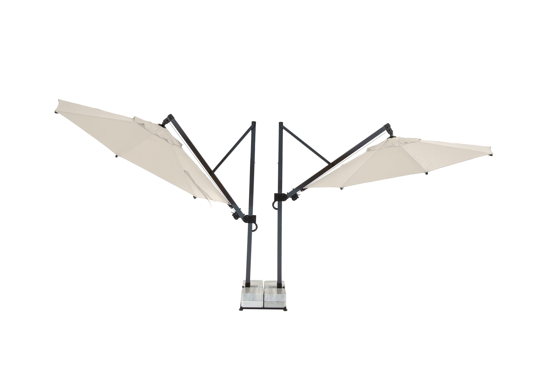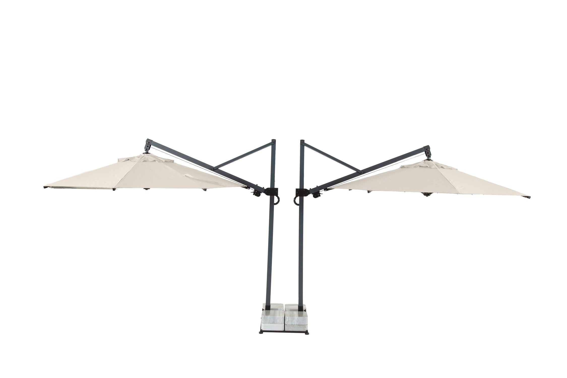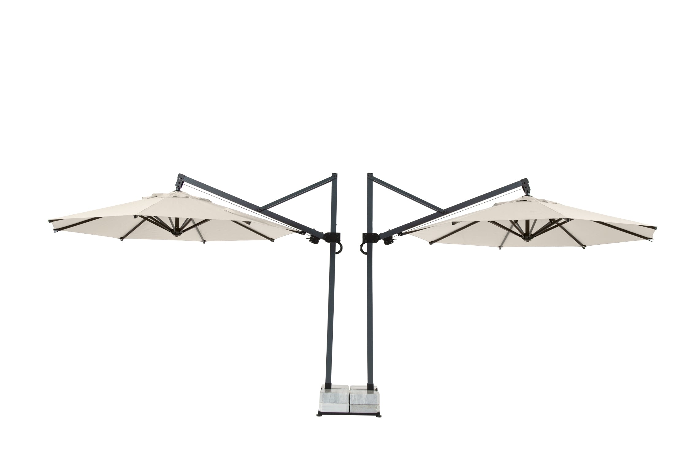 İki adet 350 cm çapında yuvarlak gölge alanını tek ayak üzerinde birleştiren bu yapı, masa ve servis düzenini bölmeden maksimum kapasite sağlar. Tekerleksiz sabit ayak sistemi sayesinde kalıcı kurulumlarda üstün denge ve güvenli kullanım sunar.