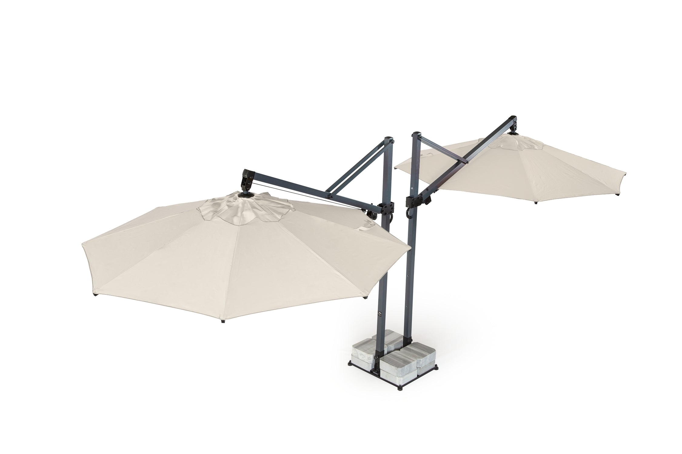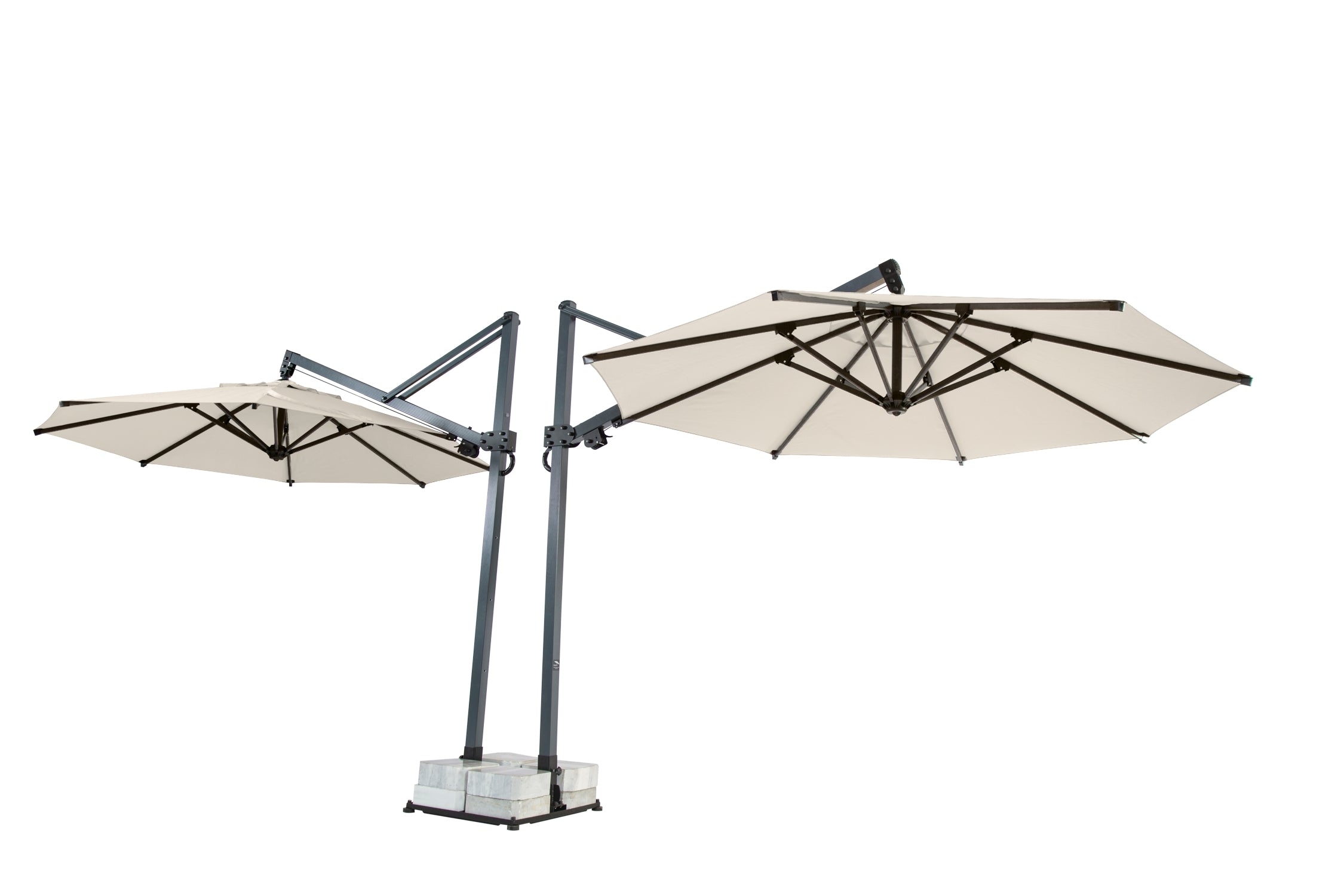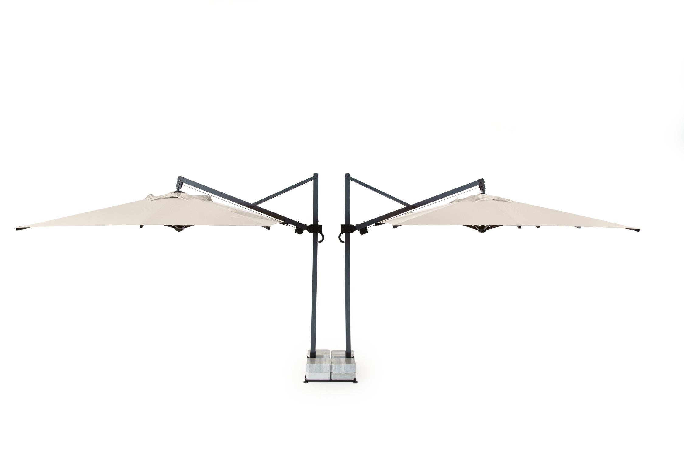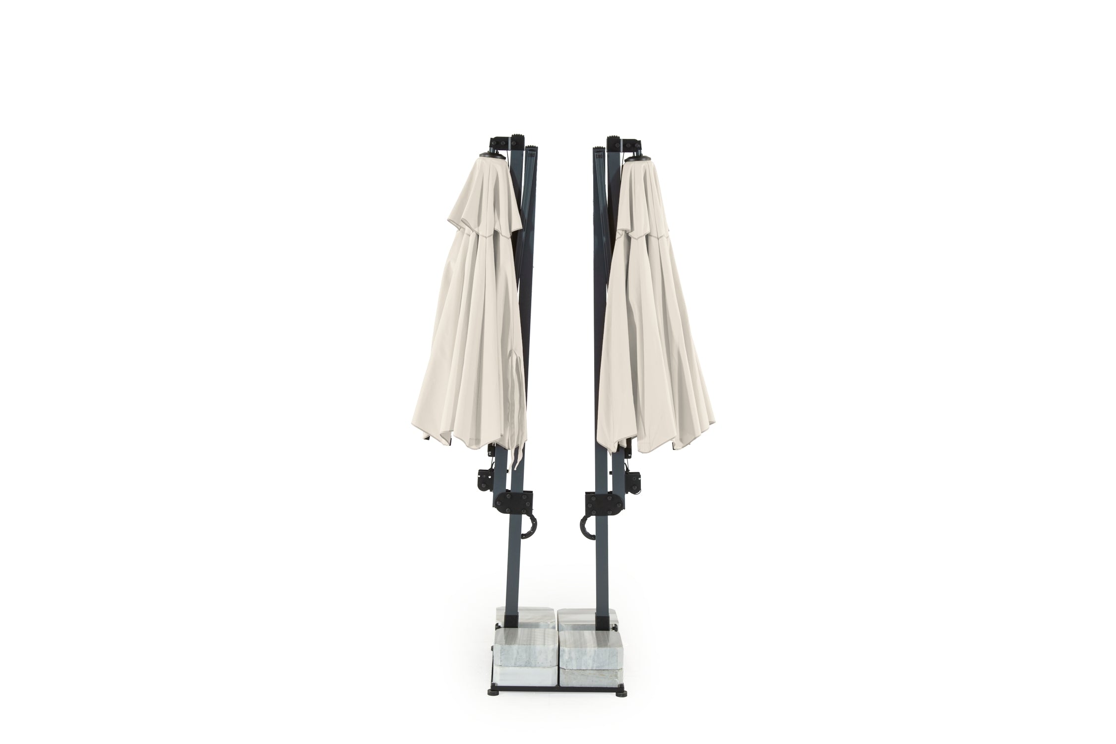 İki adet 350 cm çapında yuvarlak gölge alanını tek ayak üzerinde birleştiren bu yapı, masa ve servis düzenini bölmeden maksimum kapasite sağlar. Tekerleksiz sabit ayak sistemi sayesinde kalıcı kurulumlarda üstün denge ve güvenli kullanım sunar.