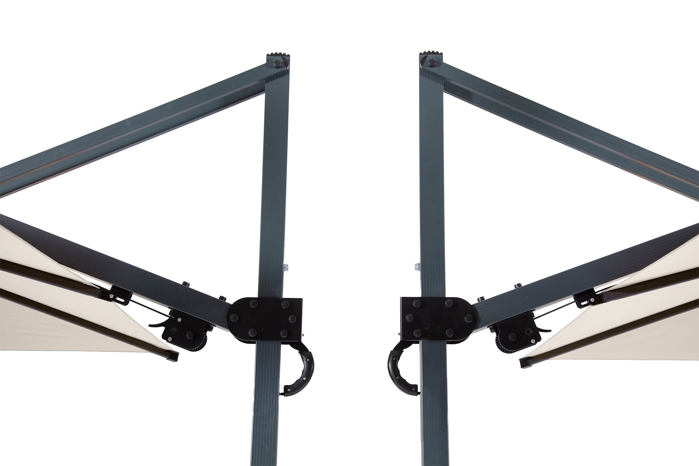- 350 cm çapında iki yuvarlak şemsiye ile dengeli ve simetrik gölge alanı