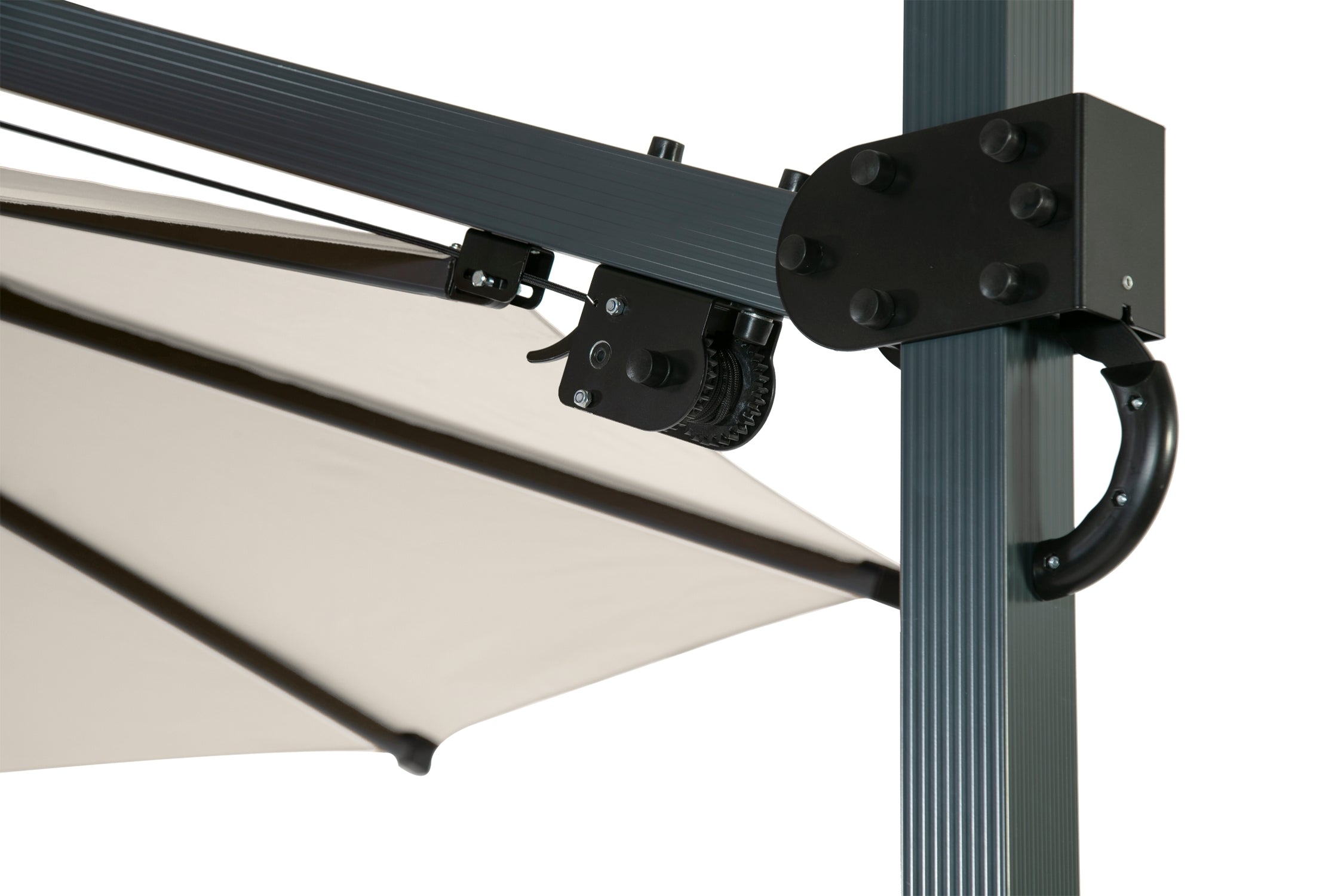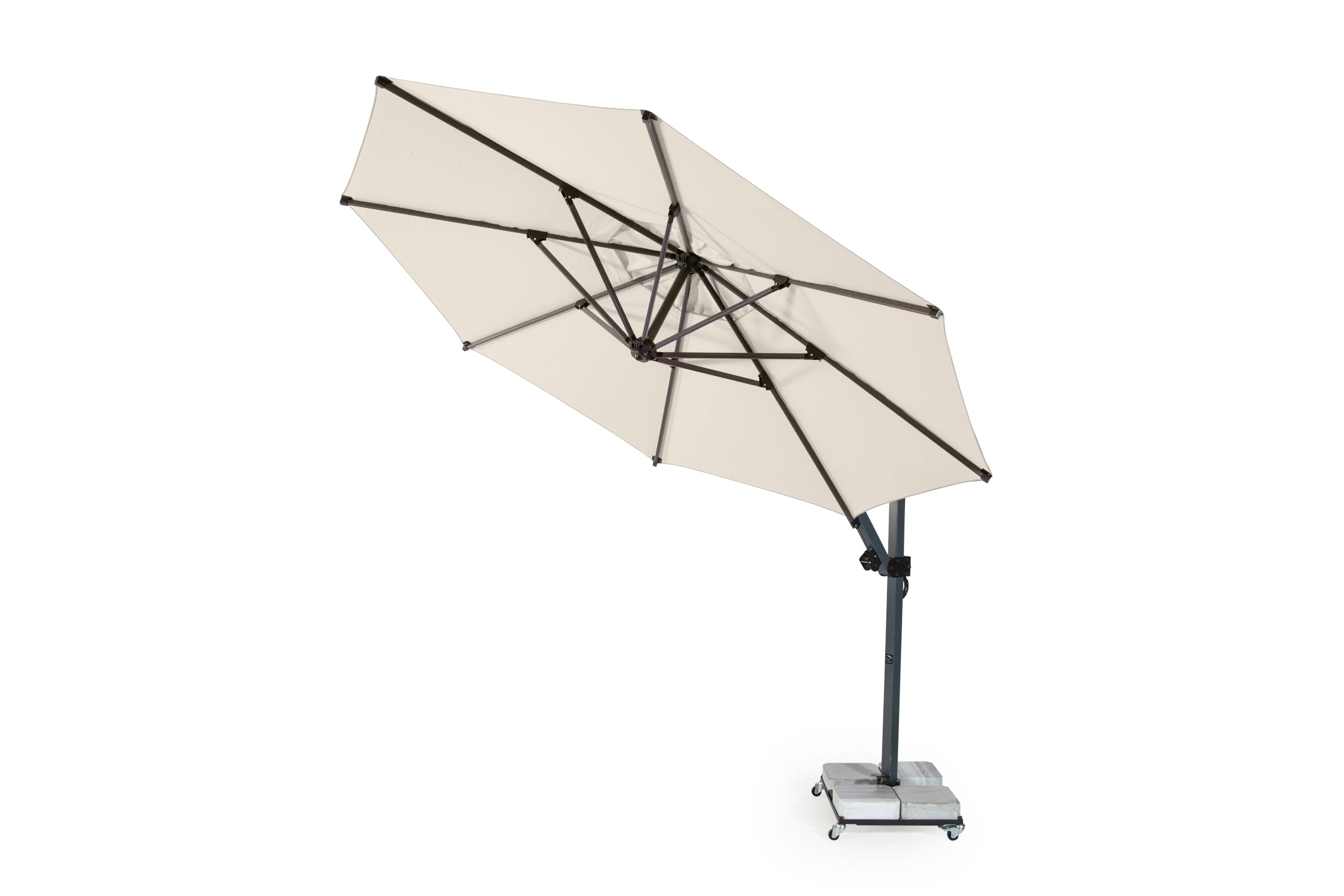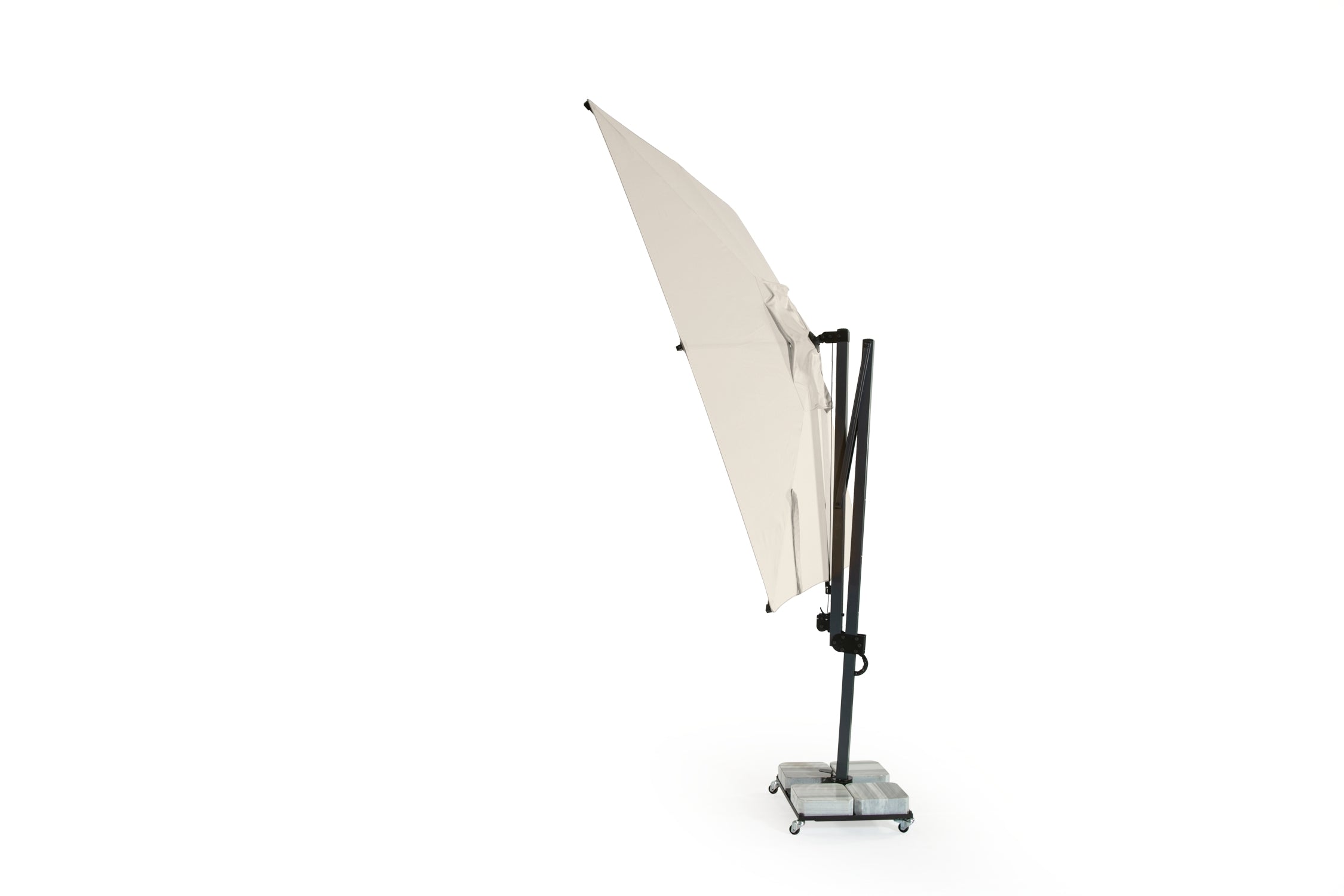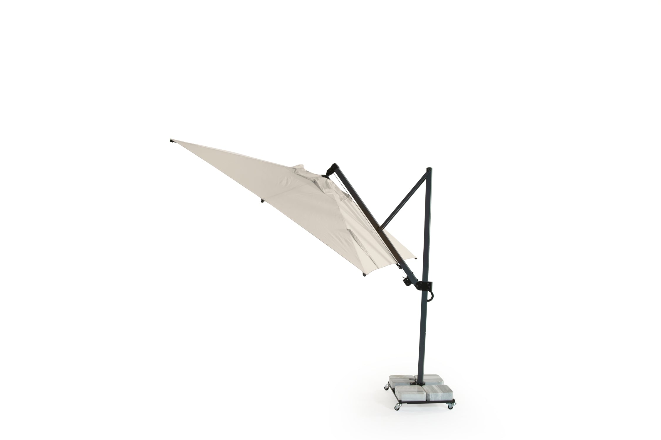 Klasik banana şemsiyelere kıyasla Banana Plus mekanizması sayesinde daha geniş açı ayarı sunar ve gün boyu gölge verimliliğini artırır.