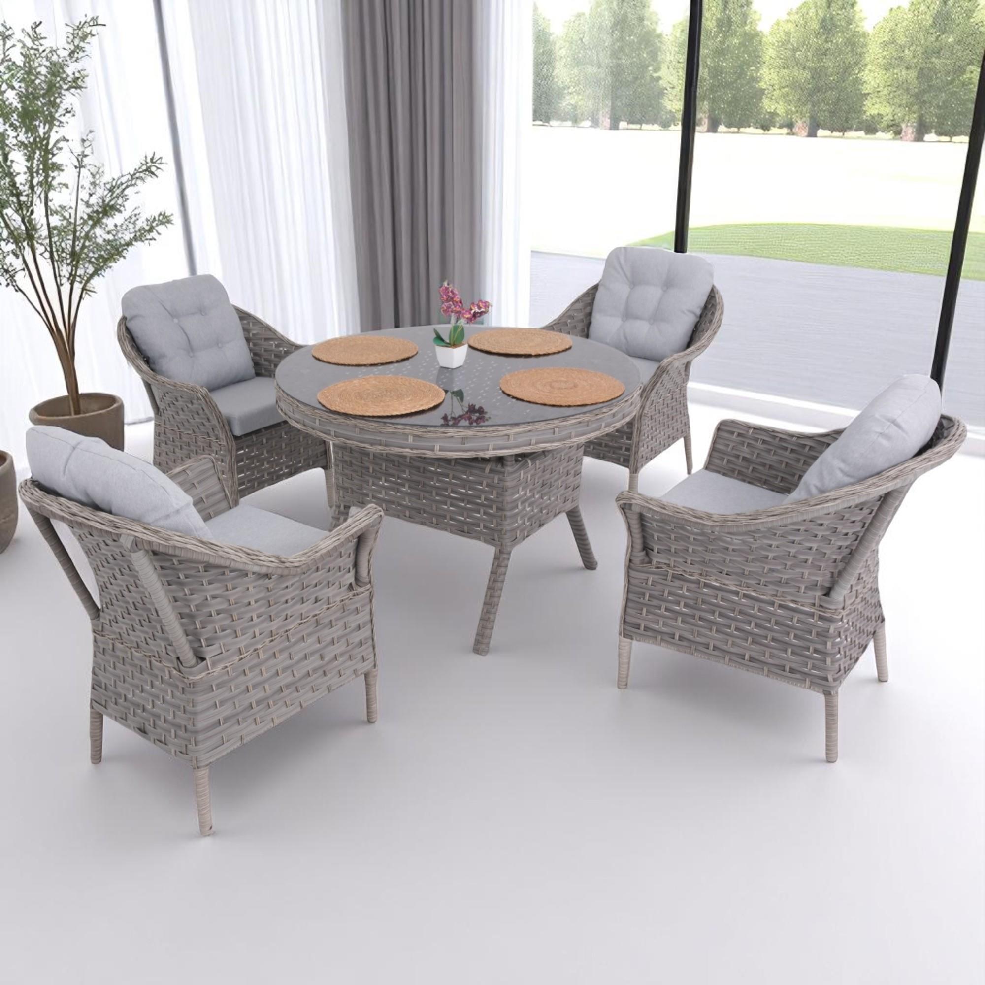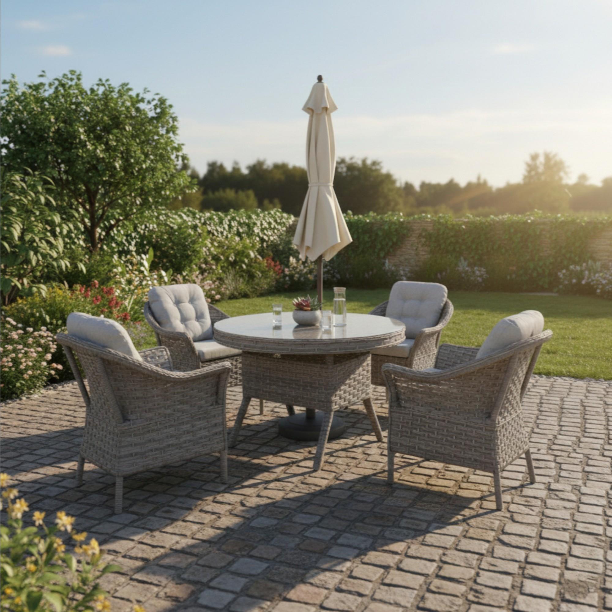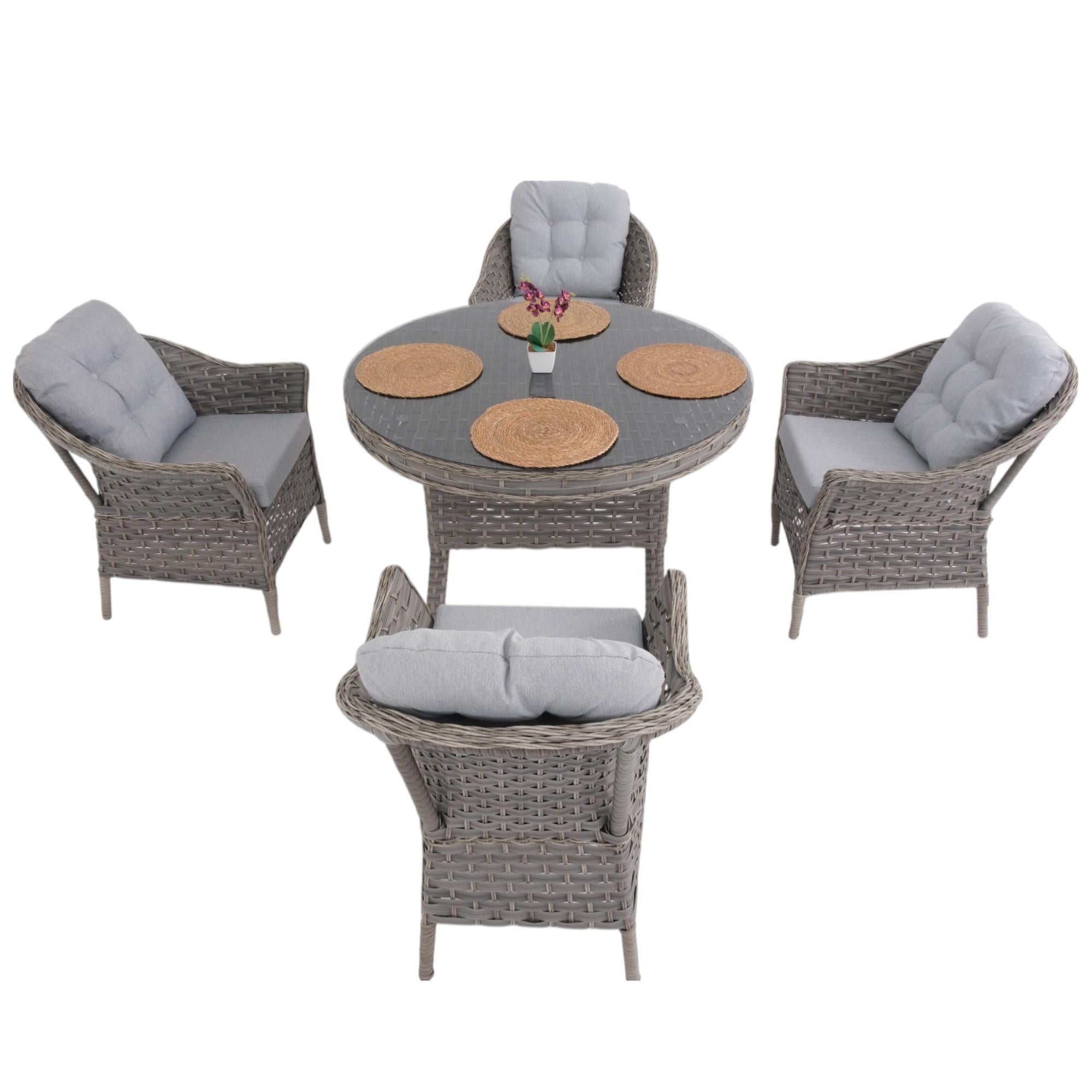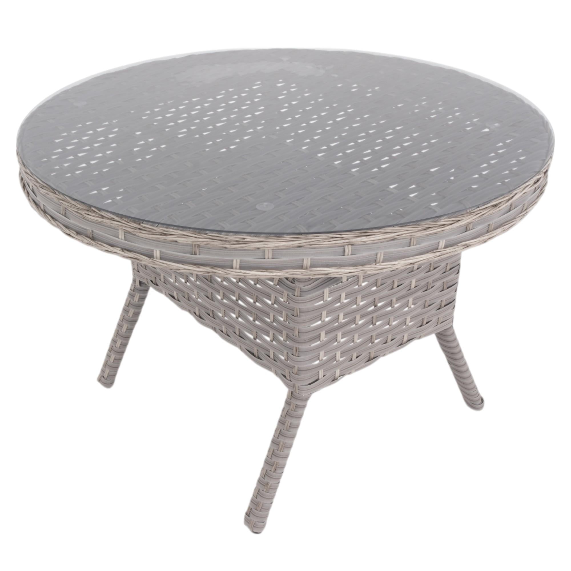 Spark 110 cm Yuvarlak Rattan Bahçe Masa Takımı 4 Kişilik, yuvarlak masa formu ve minderli sandalye yapısı ile dış mekanlarda konforlu ve dengeli bir masa düzeni sunar. Alüminyum profil iskelet üzerine uygulanan elektrostatik toz boya kaplama, orijinal rattan örme yüzey ve temperli cam masa tablası sayesinde dış mekanda kullanıma uygun, dayanıklı ve uzun ömürlü bir bahçe masa takımıdır. Yuvarlak masa formu sayesinde Spark modeli, dikdörtgen masa takımlarına kıyasla daha dengeli oturum dağılımı sağlar ve dar alanlarda daha rahat kullanım sunar. Masa yüzeyi temperli cam mı? Minderler dış mekanda kullanıma uygun mu? İskelet yapısı paslanmaya karşı dayanıklı mı? Rattan yüzey orijinal mi?Öne Çıkan Özellikler