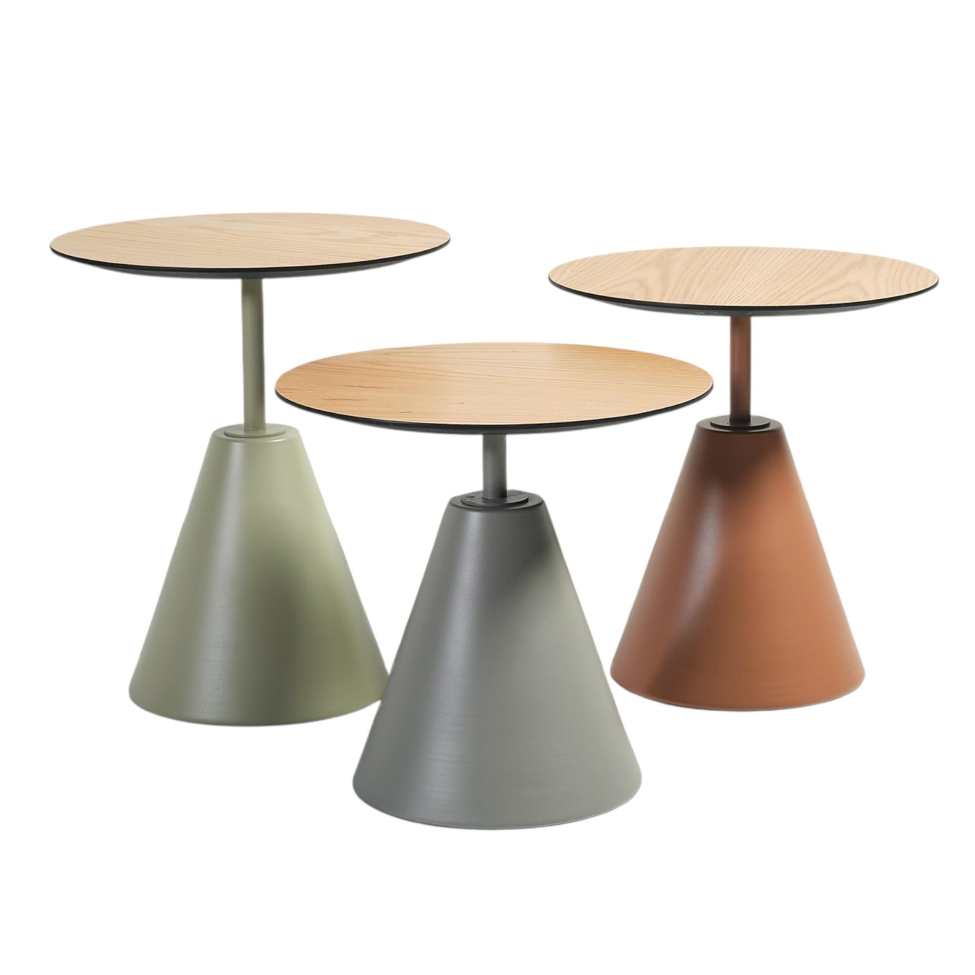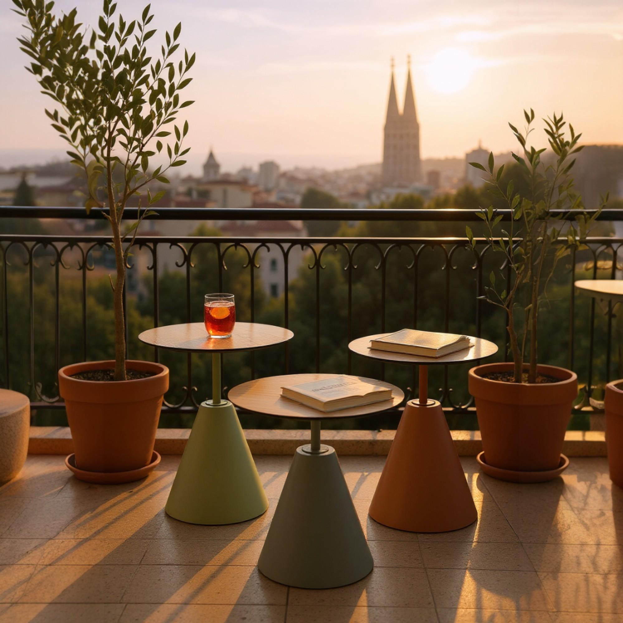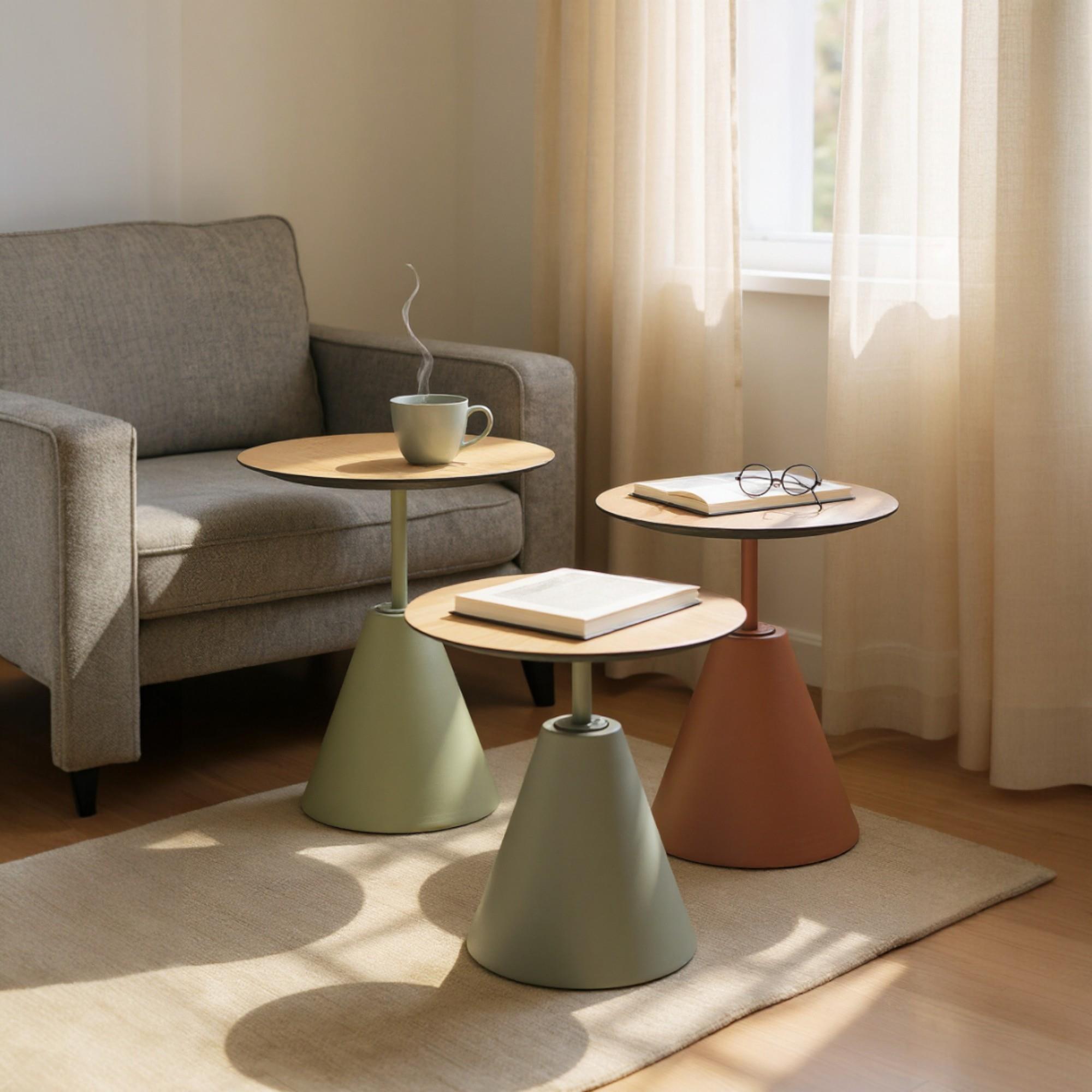 Renkli ve dikkat çekici formu ile bu üçlü sehpa modeli, klasik zigon sehpaların modern bir yorumu olarak öne çıkar. Konik ayakları ve zarif yüzey geçişleri, mantar sehpa tarzına modern bir yorum kazandırır.