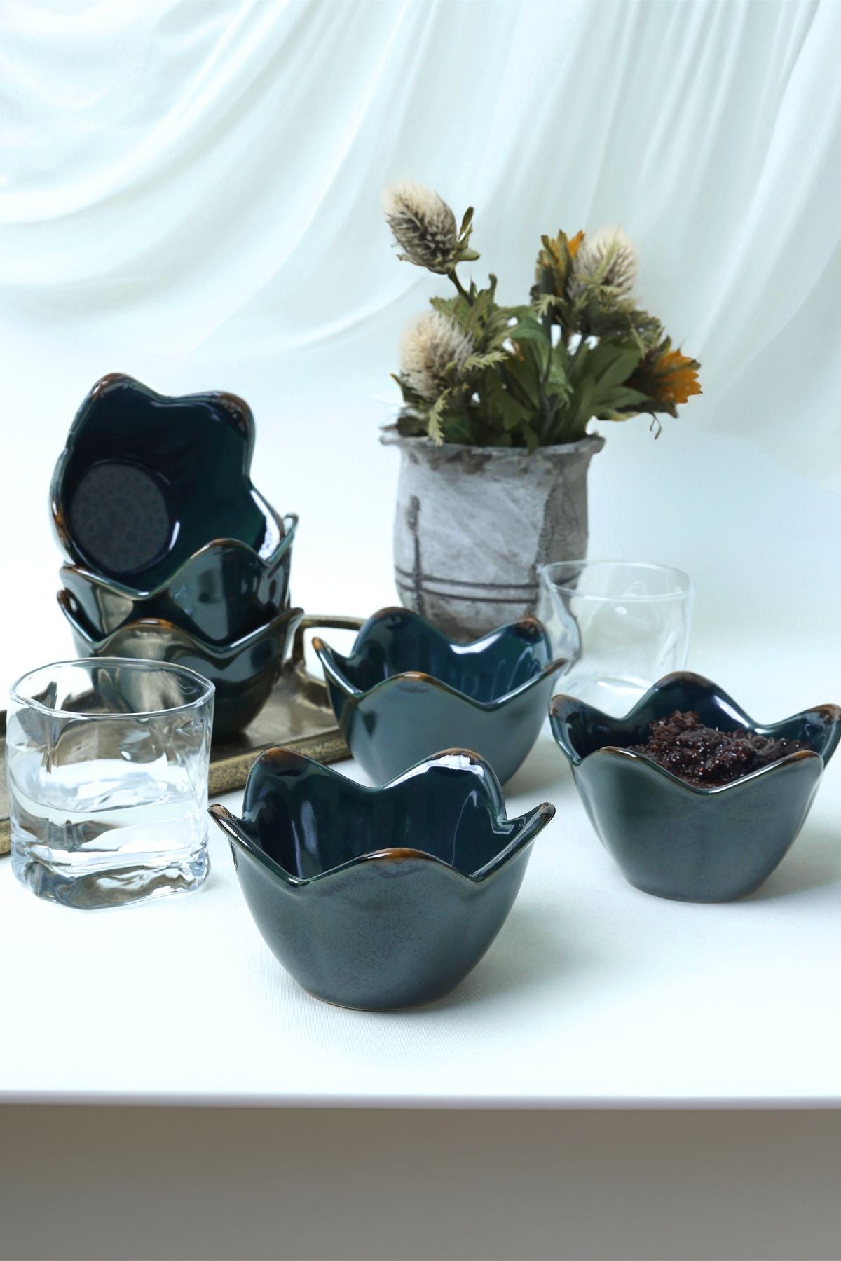 Sade bir aile yemeği veya kalabalık bir partide sizlere eşlik edecek keramika 6 adet zümrüt zambak çerezlik servislerinize çok şık bir hava katacaktır. Zümrüt serisinin içerisinde yer alan yeşilin en asil tonlarını barındıran bu takım, gözalıcı sunumlar yapmanızın püf noktası olacak ve masanıza havalı bir görünüm kazandıracaktır.